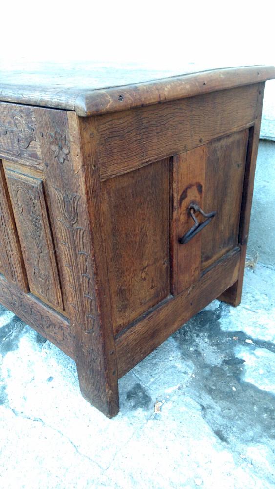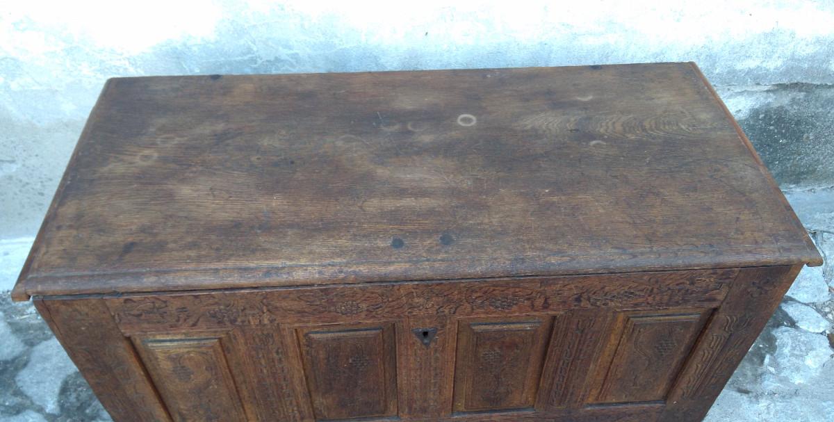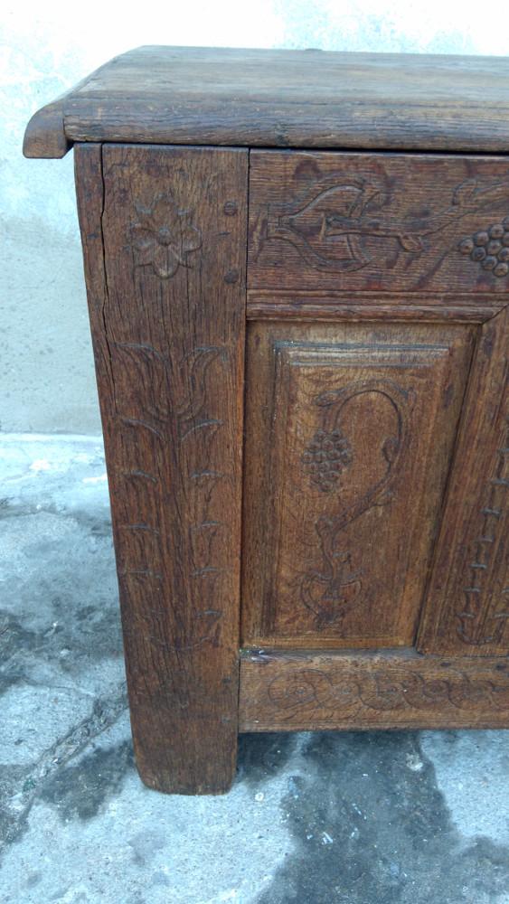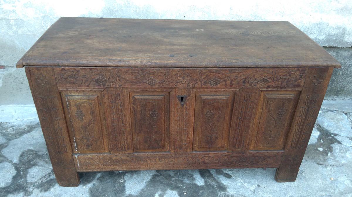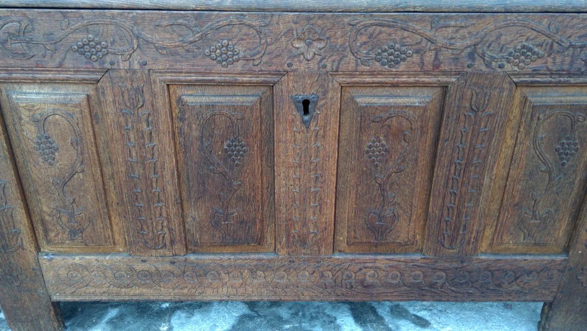Oryginalna skrzynia barokowa. Wykonana w dębinie, front ze snycerskimi dekoracjami. Okucia i uchwyty oryginalne.