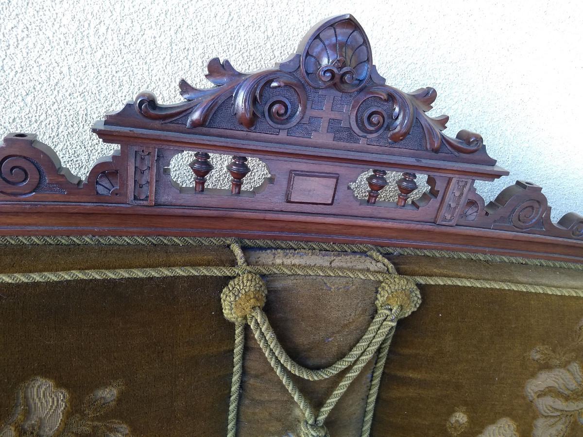 Piękna orzechowa sofa z XIX wieku. Mebel eklektyczny z z całą paletą cech typowych dla stylu. Do dziś dnia zachowało się nawet oryginalne, pierwotne poszycie softy.
