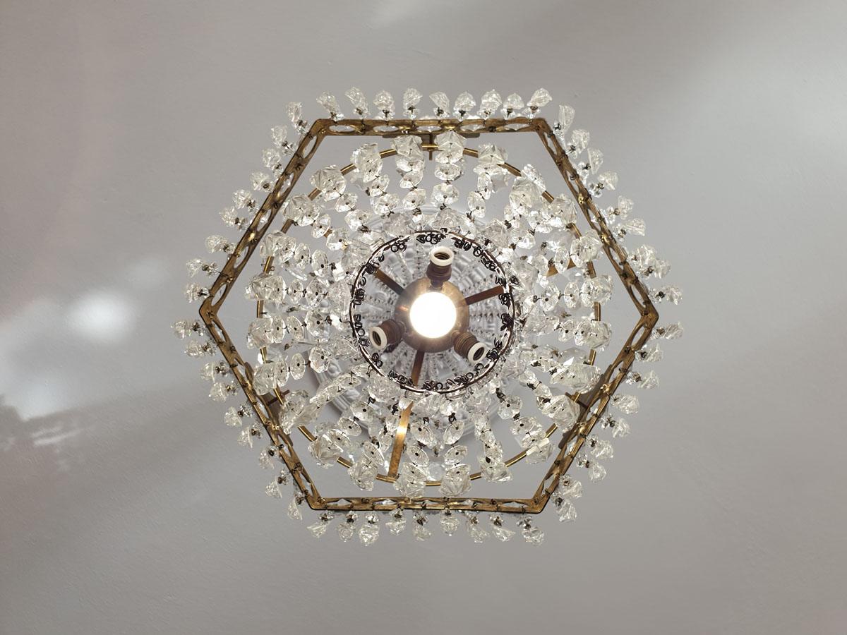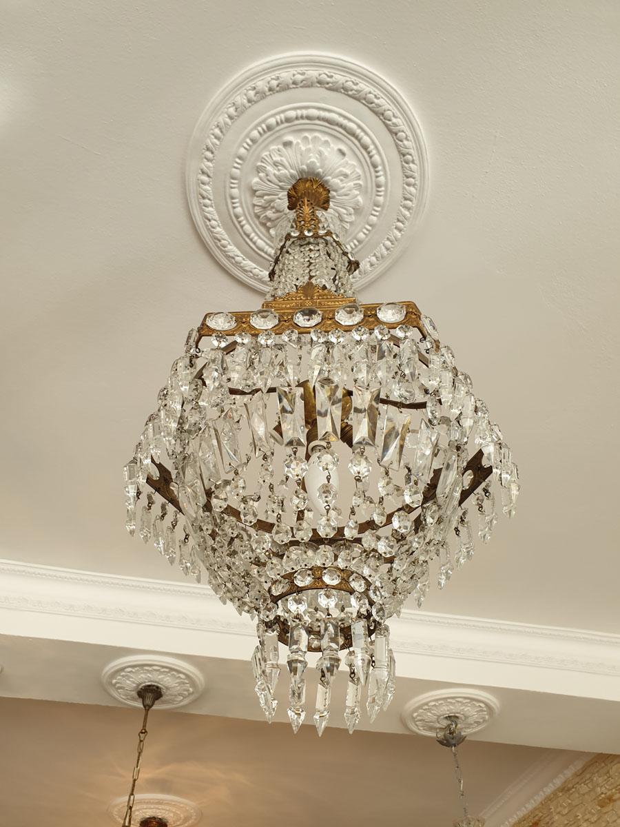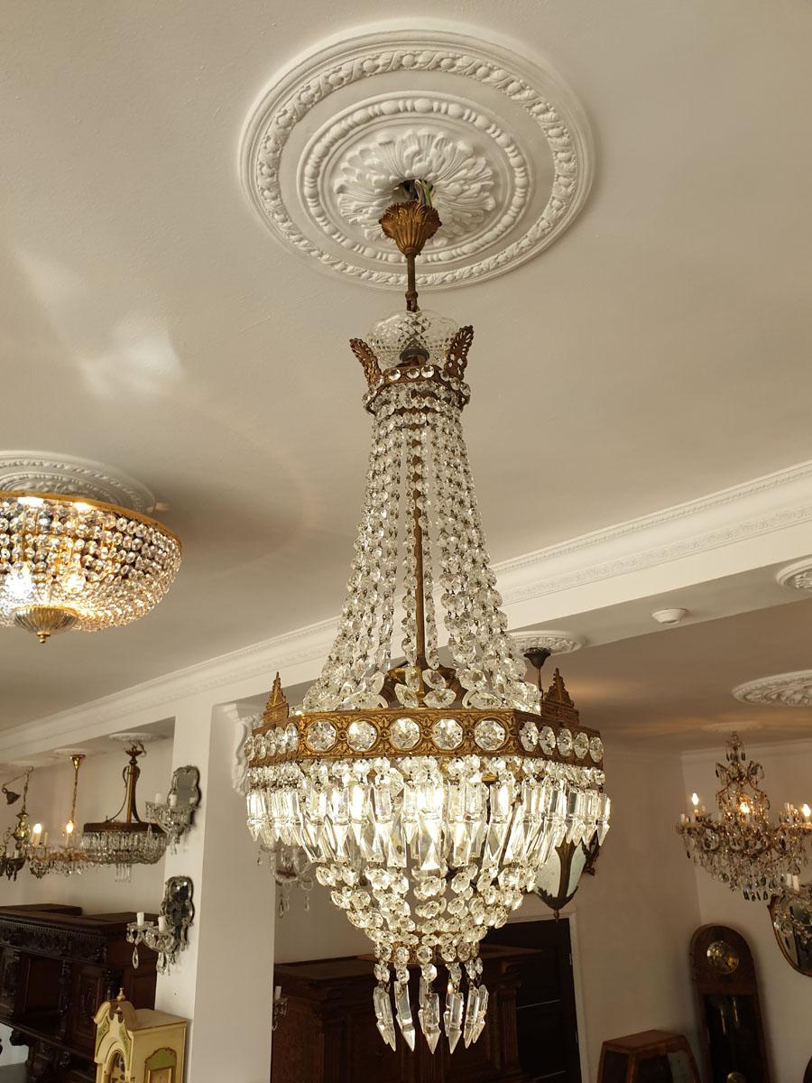 Wysoki żyrandol kryształowy o bardzo dekoracyjnym wzorze. Kryształy w formie grotów, oprawki porcelanowe.