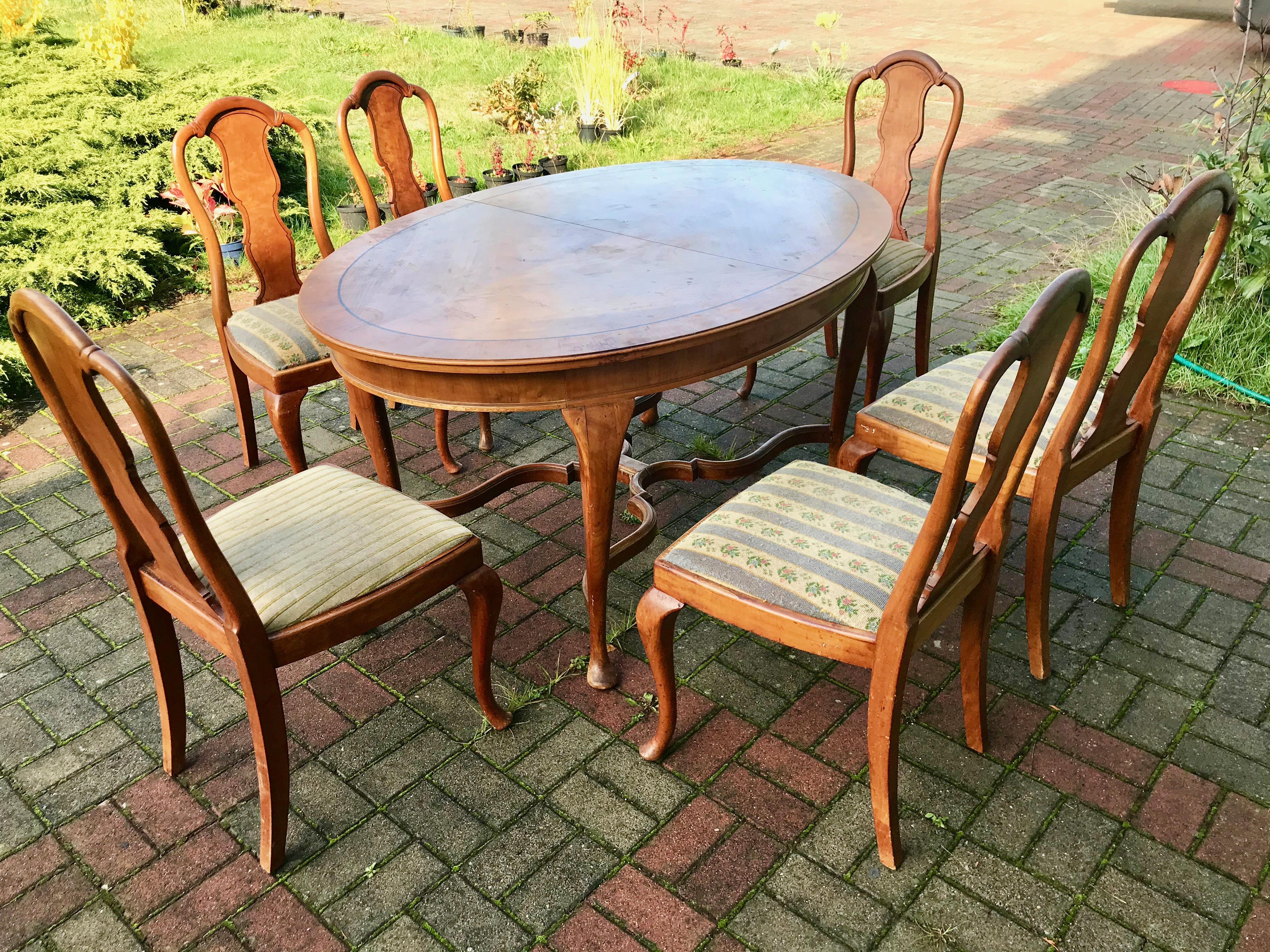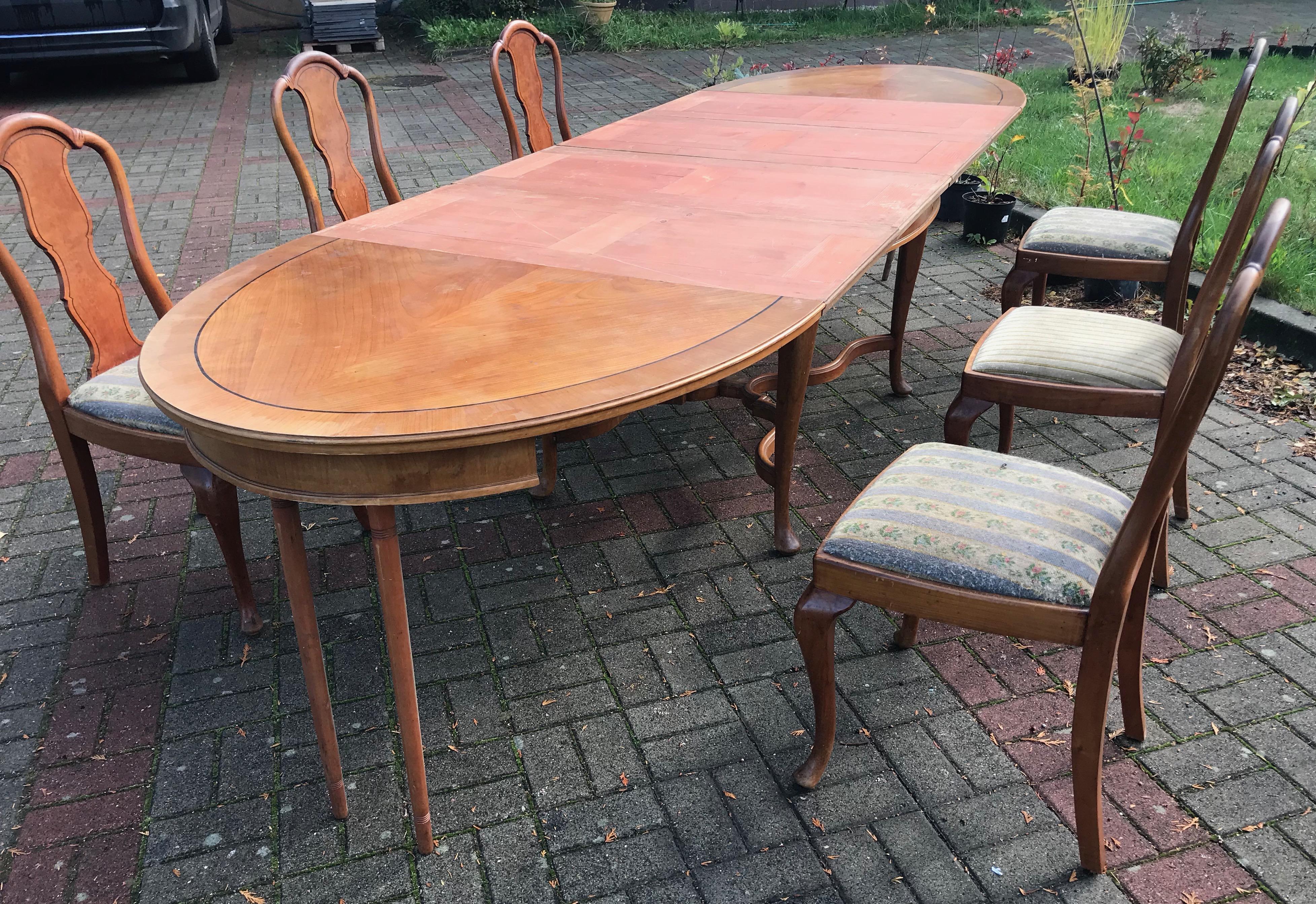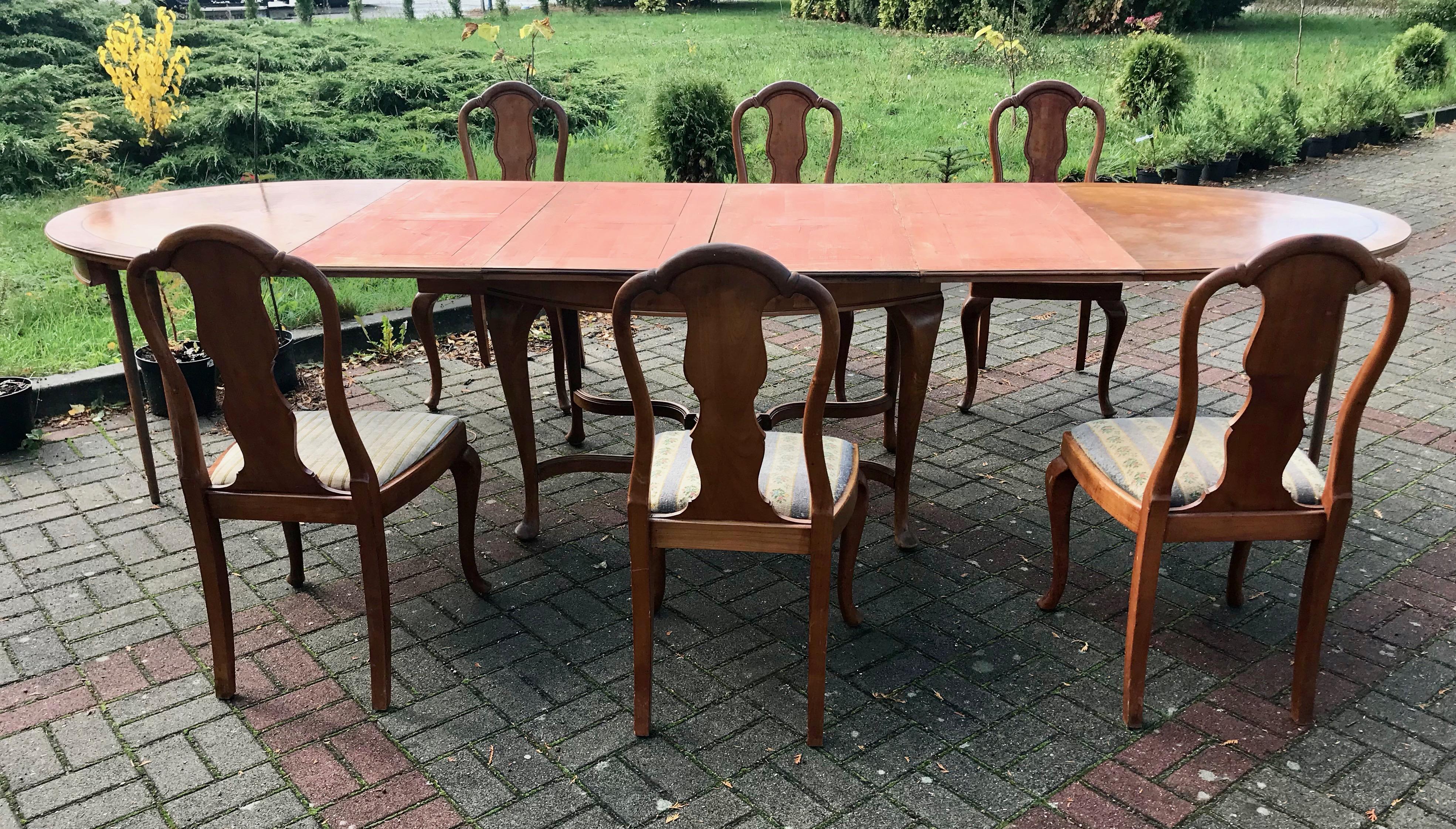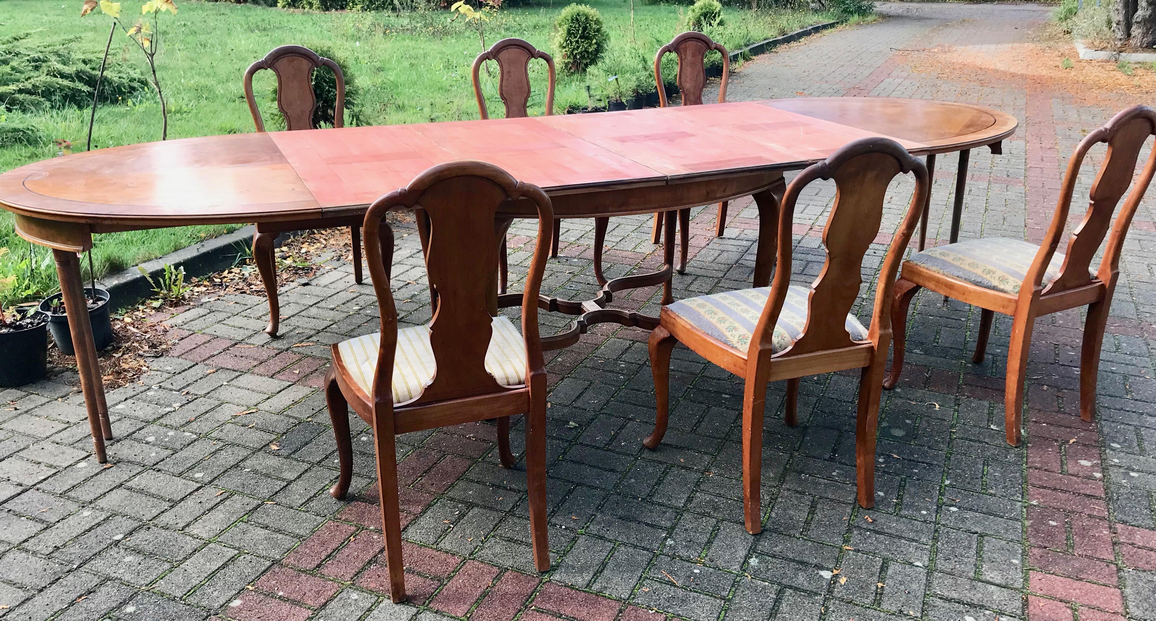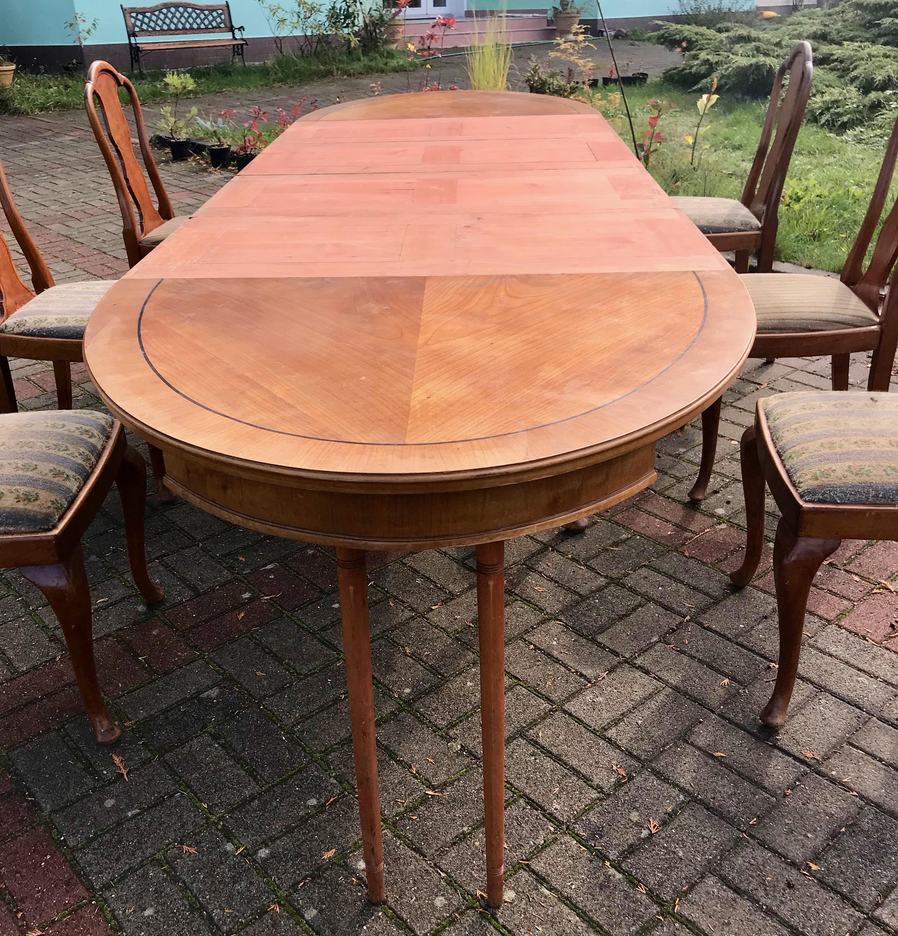 (nr 8186)Przepiękny komplet rozkładany stół z sześcioma krzesłami z okresu międzywojennego. Meble wykonane z orzecha lub czereśni w jasnym i ciepłym odcieniu. Zarówno stelaż krzeseł jak i wiązania nóg bardzo delikatne i finezyjne. Na blacie i oparciach krzeseł hebanowa intarsja. Stół dający wiele możliwości - przez cztery wkłady do rozkładania można go powiększyć do 340 centymetrów.