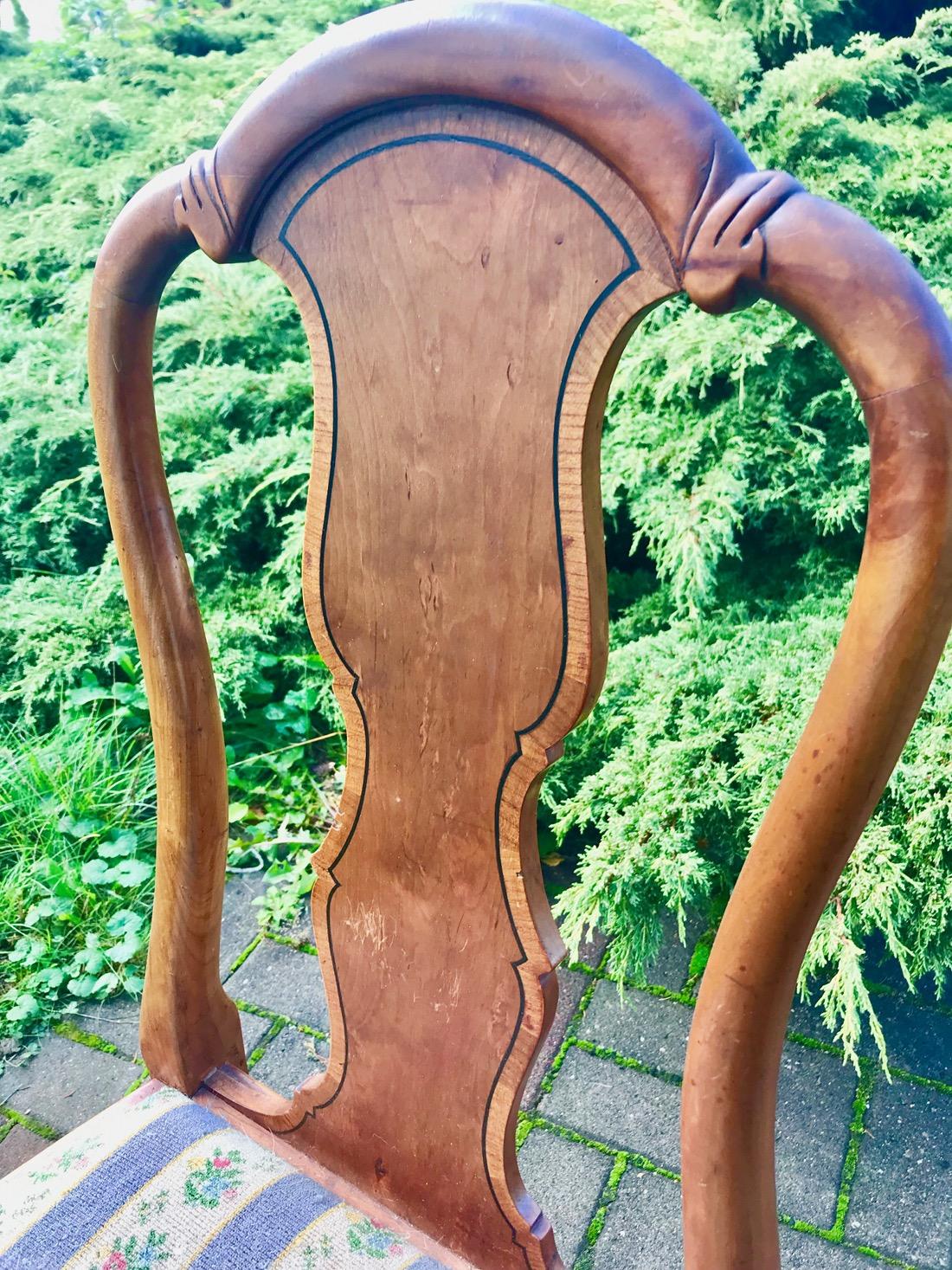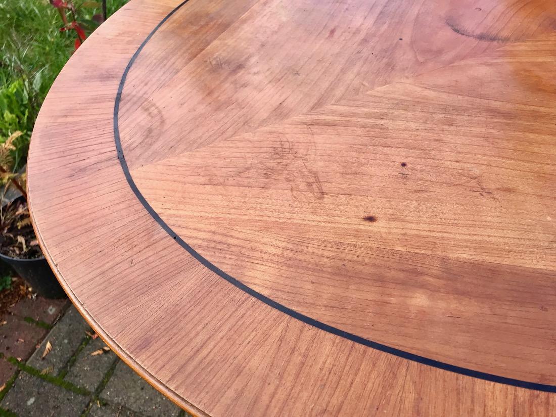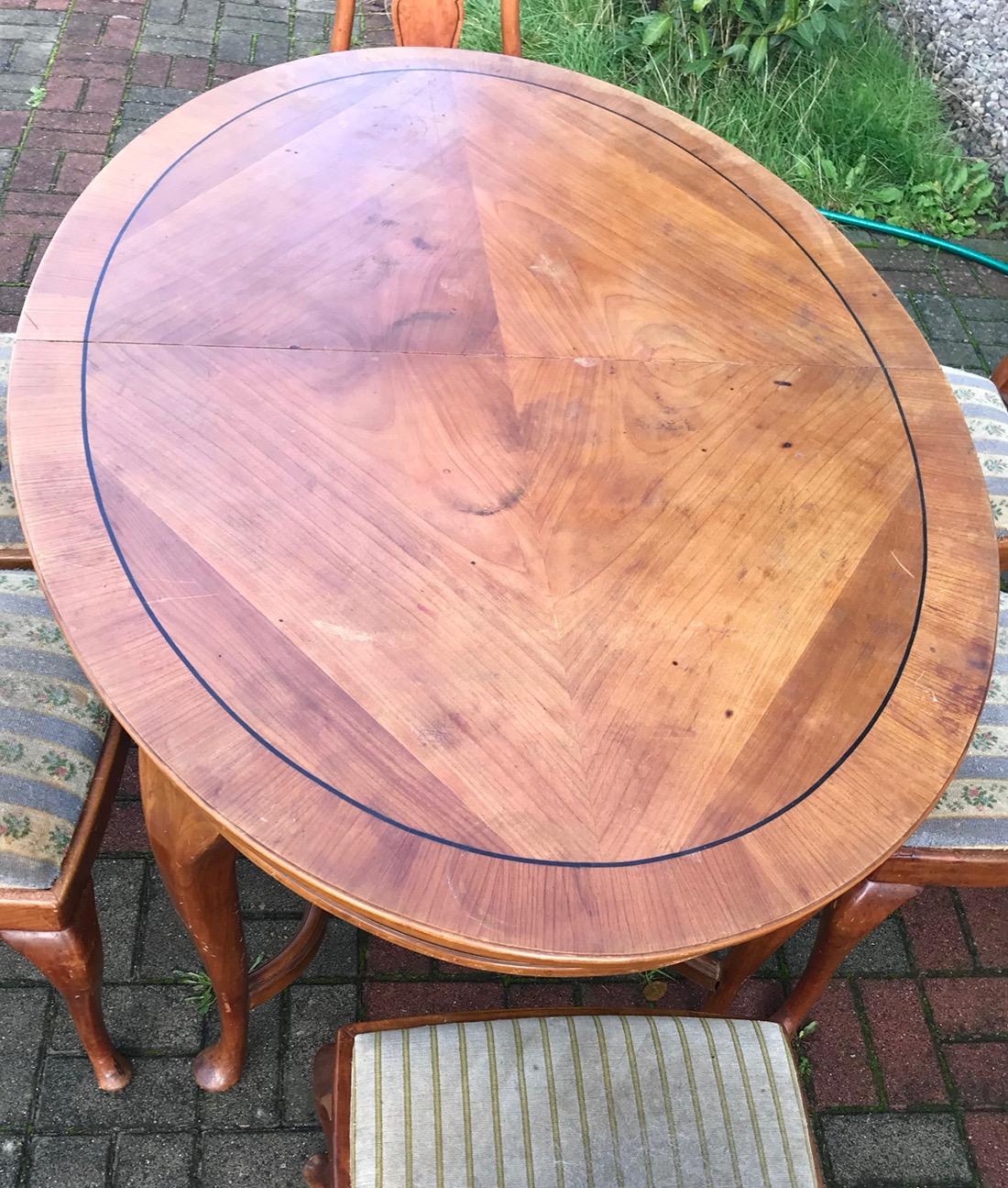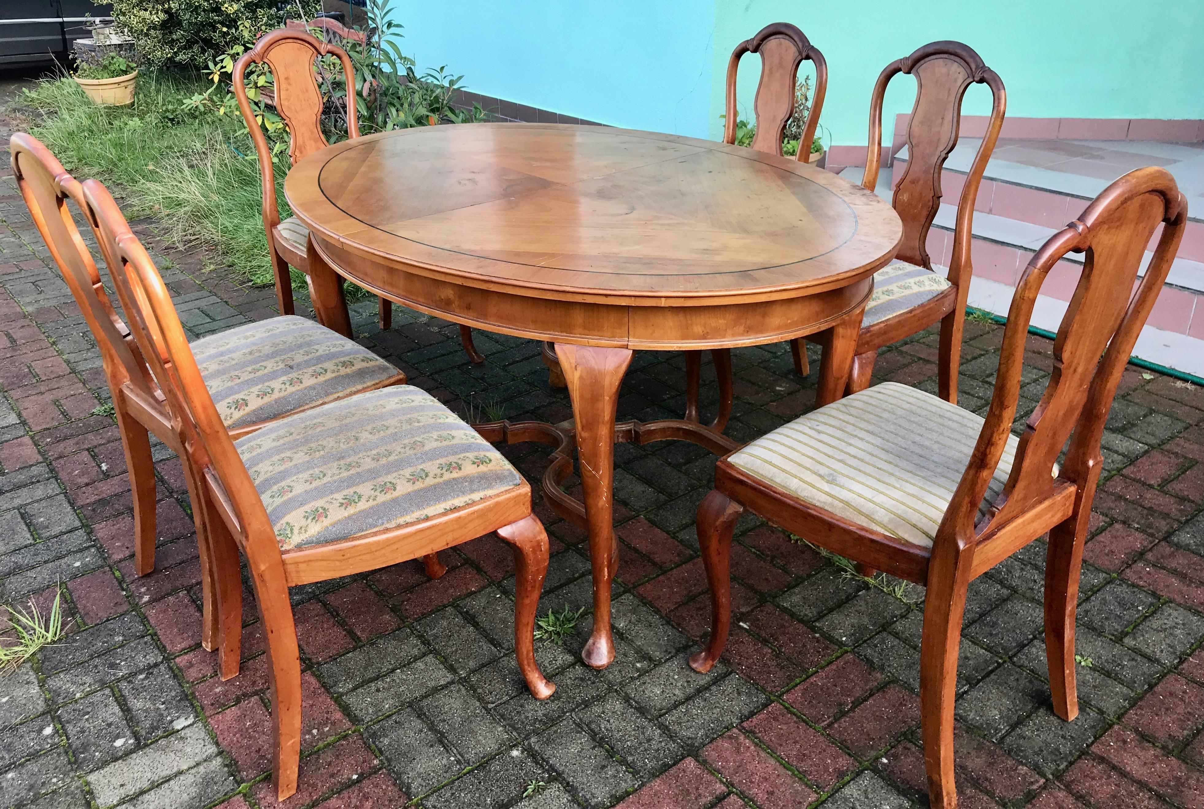 (nr 8186)Przepiękny komplet rozkładany stół z sześcioma krzesłami z okresu międzywojennego. Meble wykonane z orzecha lub czereśni w jasnym i ciepłym odcieniu. Zarówno stelaż krzeseł jak i wiązania nóg bardzo delikatne i finezyjne. Na blacie i oparciach krzeseł hebanowa intarsja. Stół dający wiele możliwości - przez cztery wkłady do rozkładania można go powiększyć do 340 centymetrów.