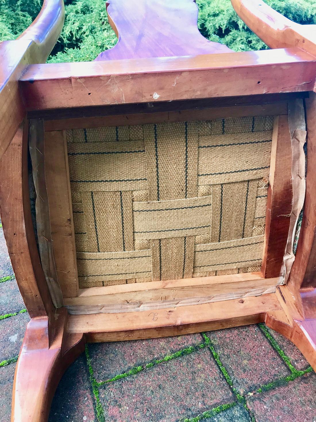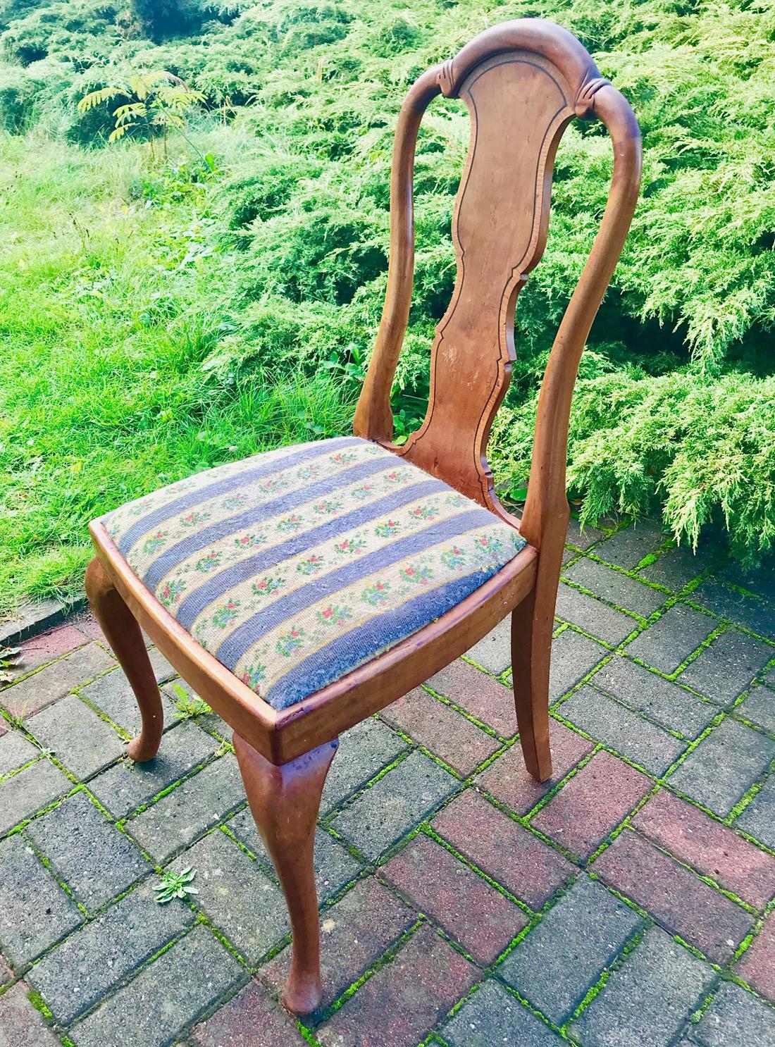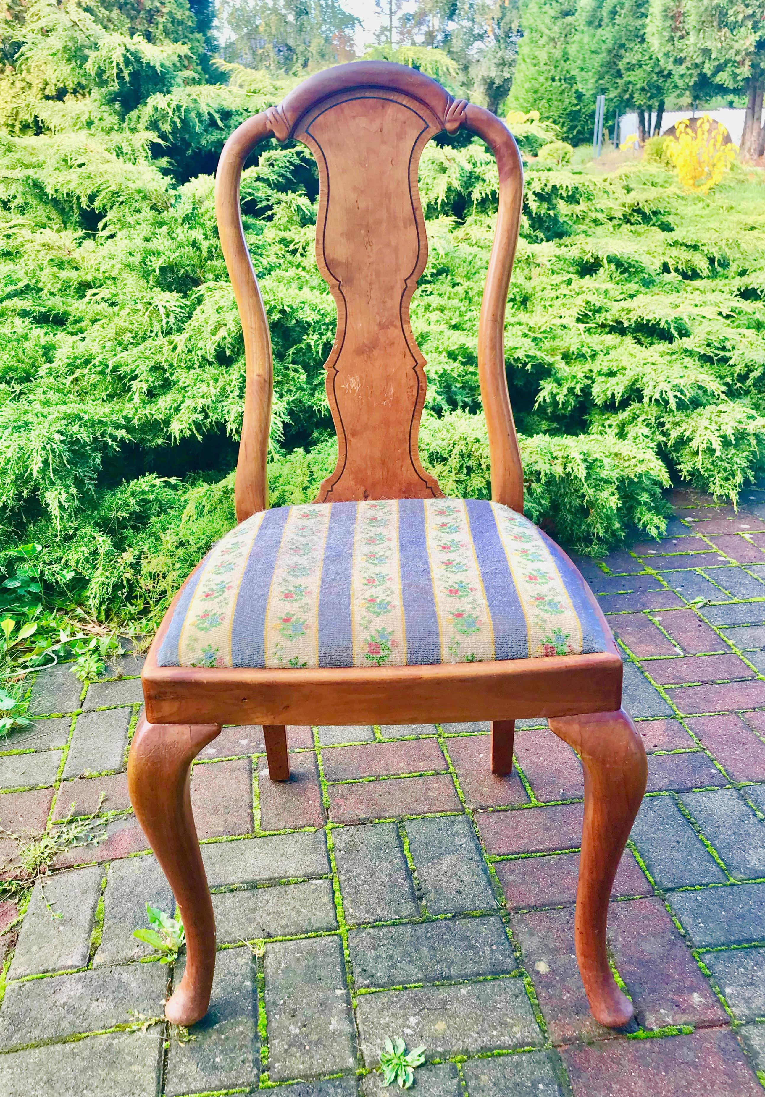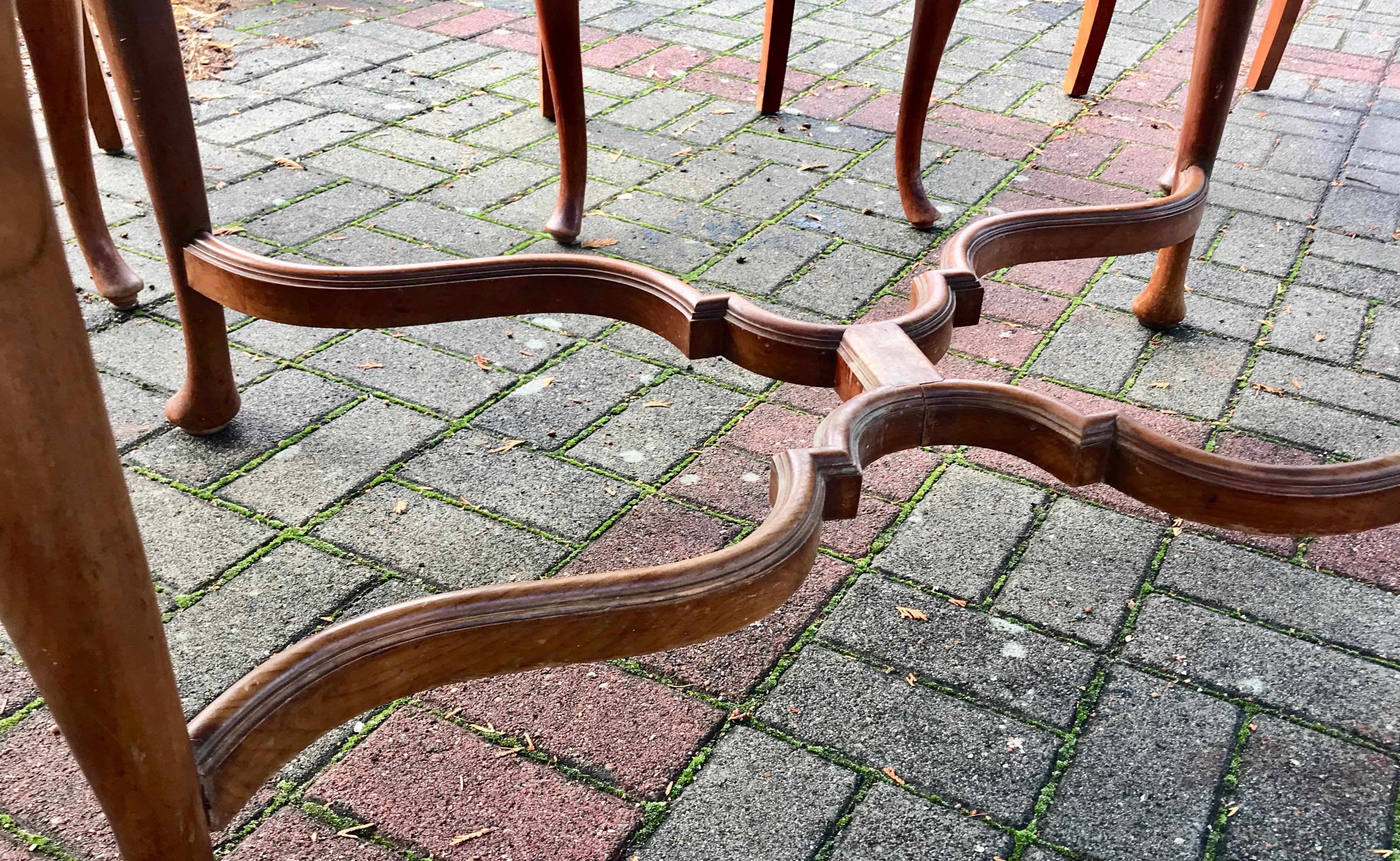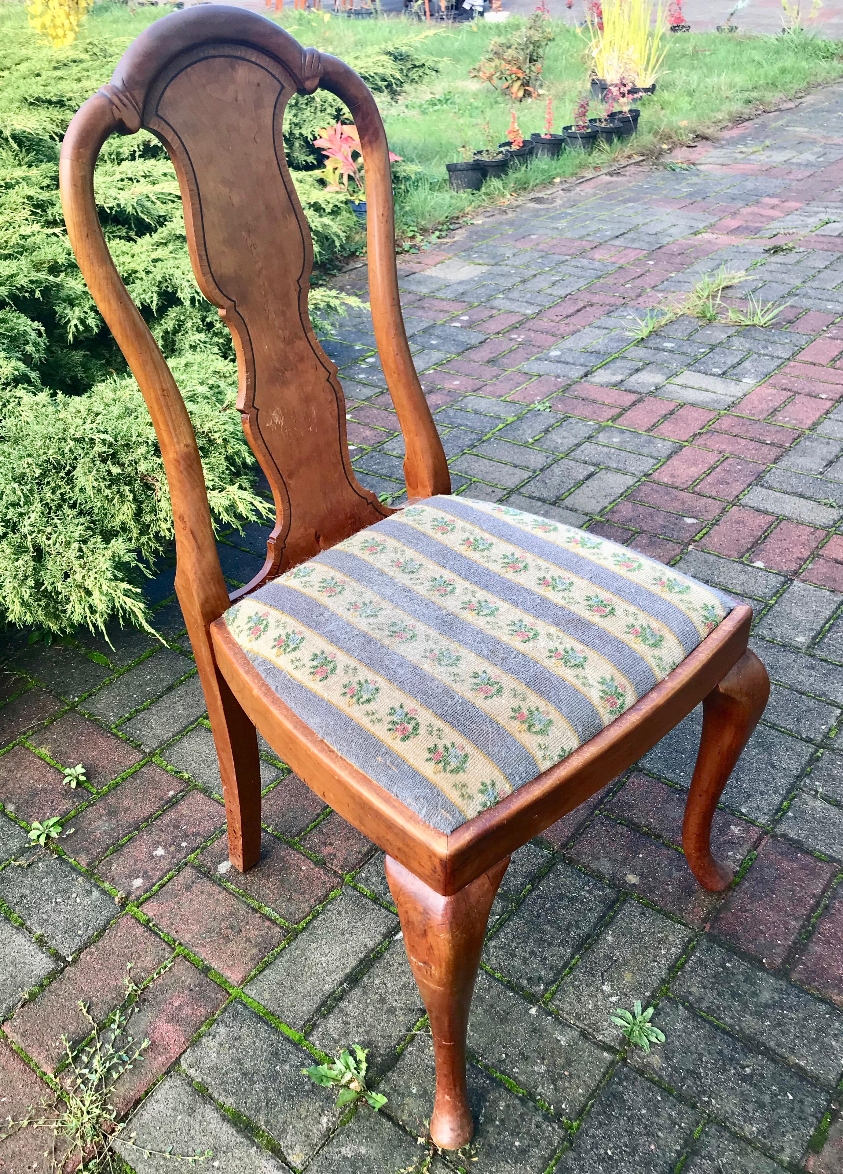 (nr 8186)Przepiękny komplet rozkładany stół z sześcioma krzesłami z okresu międzywojennego. Meble wykonane z orzecha lub czereśni w jasnym i ciepłym odcieniu. Zarówno stelaż krzeseł jak i wiązania nóg bardzo delikatne i finezyjne. Na blacie i oparciach krzeseł hebanowa intarsja. Stół dający wiele możliwości - przez cztery wkłady do rozkładania można go powiększyć do 340 centymetrów.