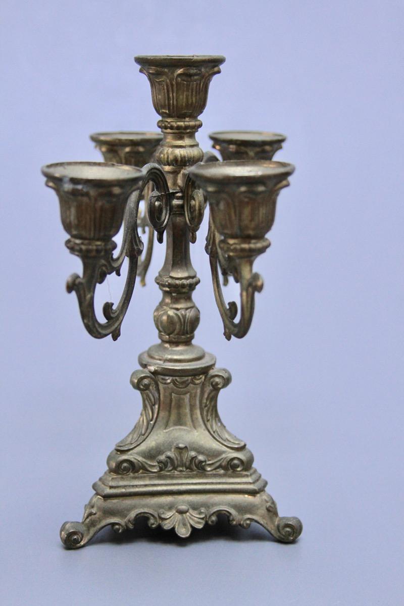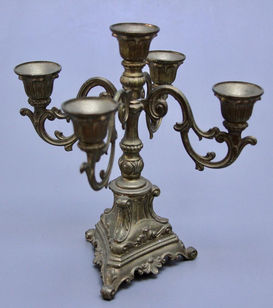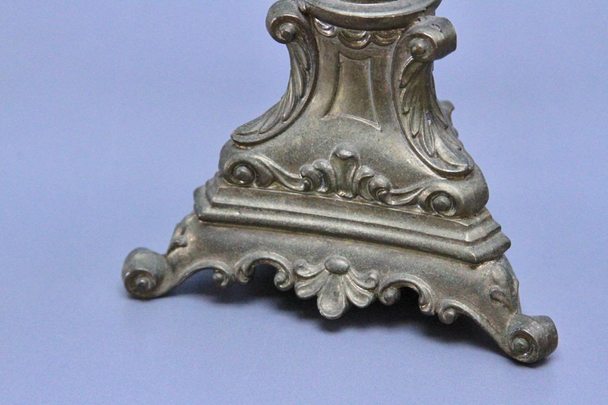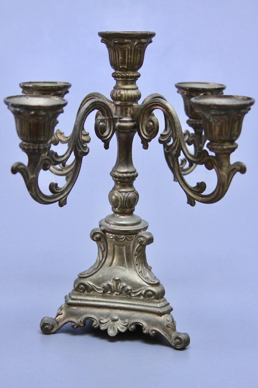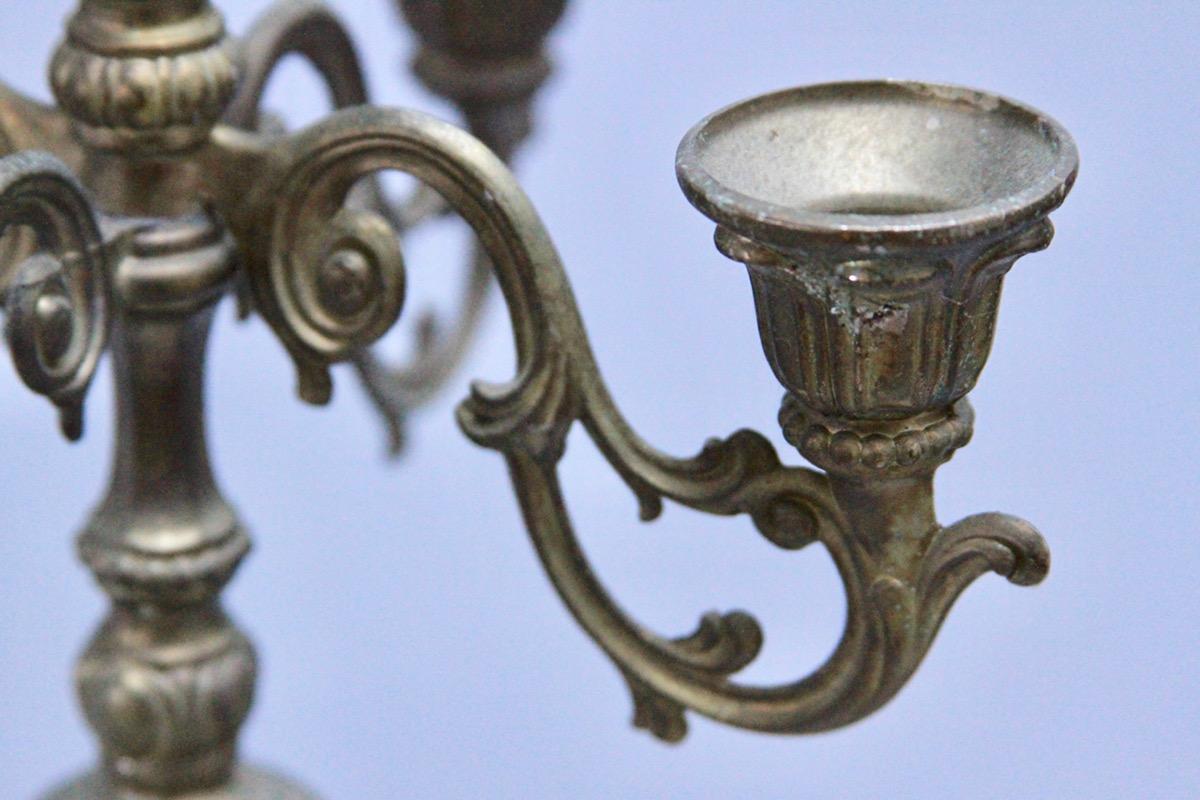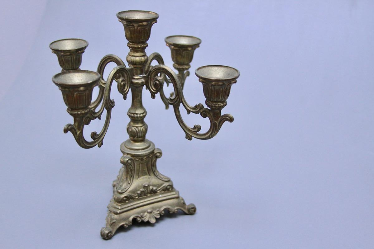 Ciekawy świecznik, z regulowanymi ramionami. Daje to możliwość ustawienia "go" nawet na małej przestrzeni, wąskiej półce. Przedmiot wykonany z mosiądzu na przełomie XIX i XX wieku.