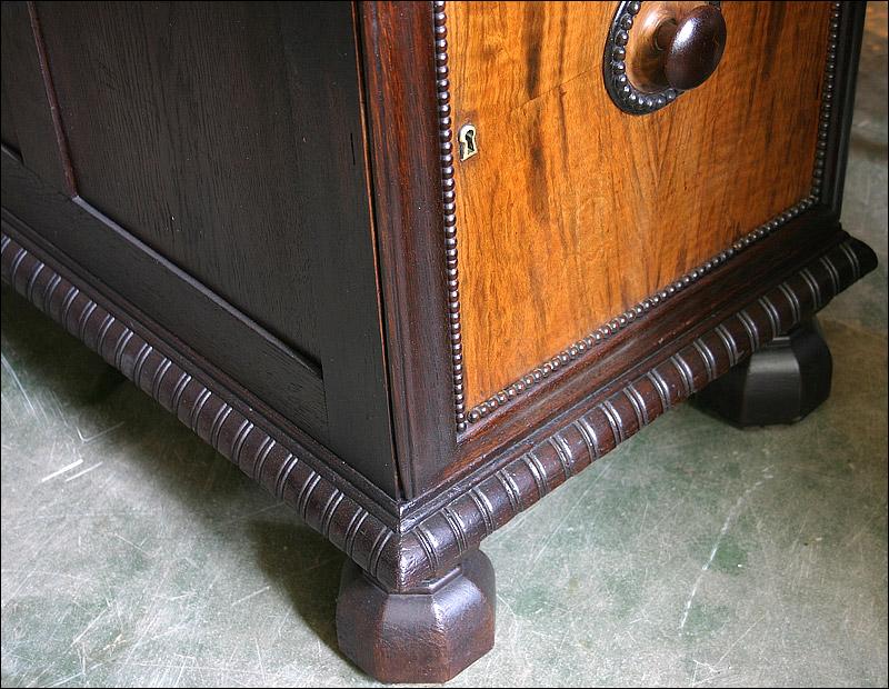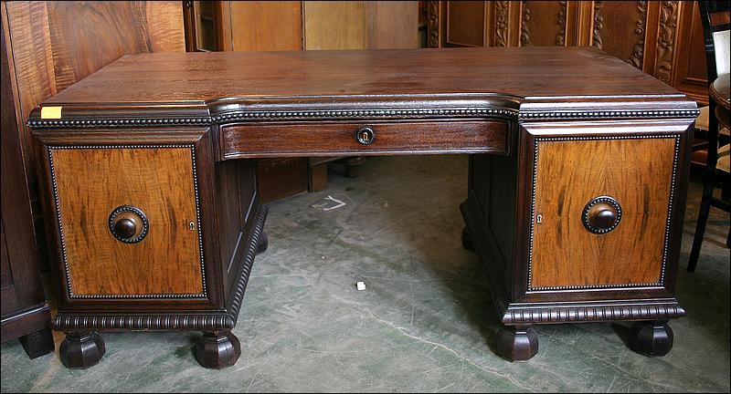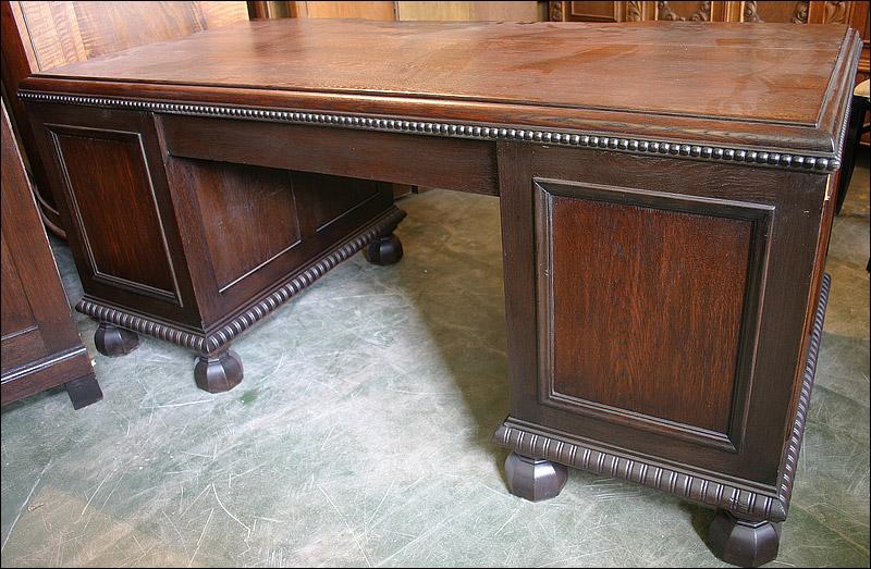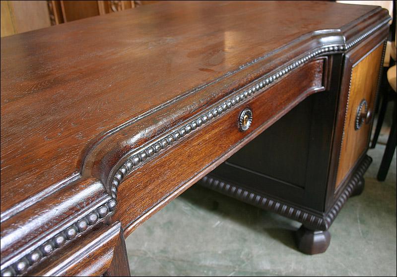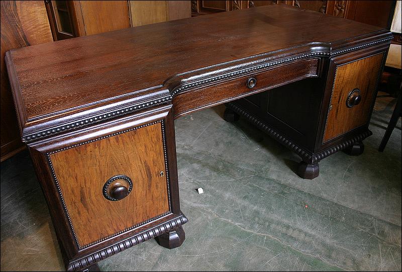 Dębowe biurko gabinetowe. Fronty drzwiczek z czeczotami orzechowymi.