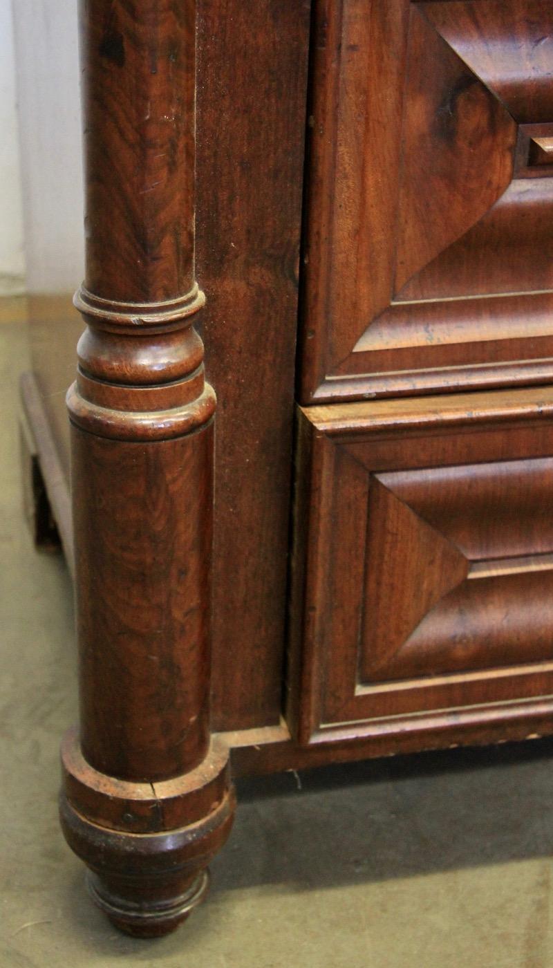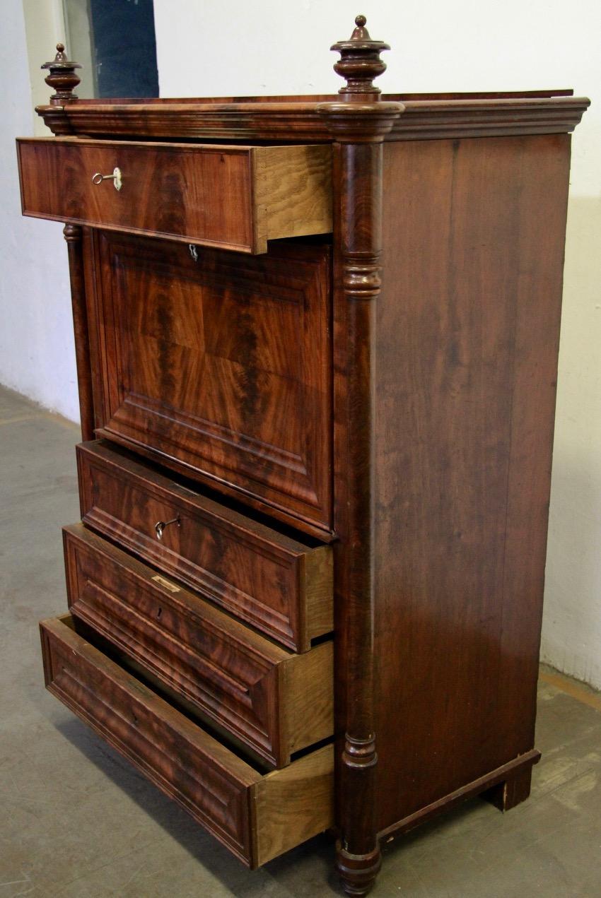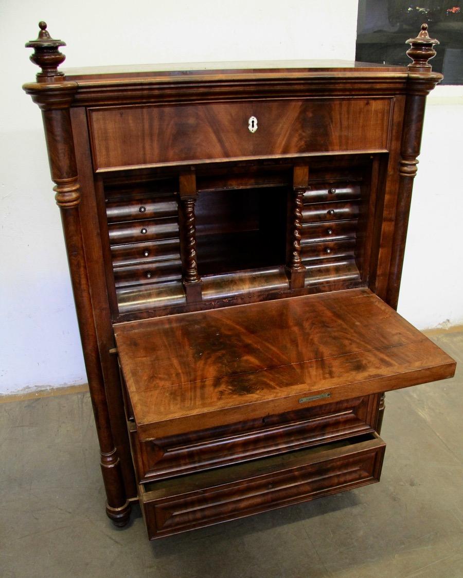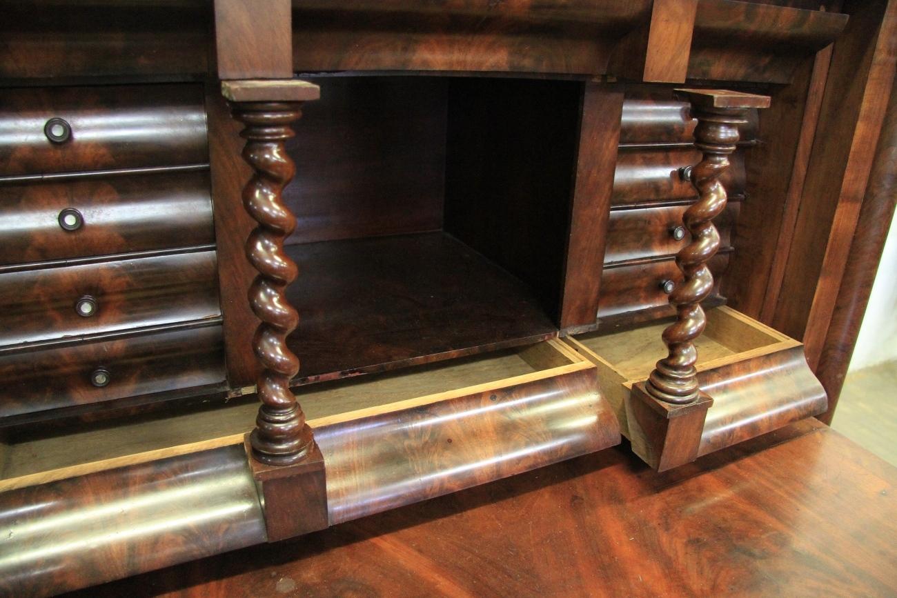 (nr 8367)Przepiękny sekretarzyk z drugiej połowy XIX wieku. mebel fornirowany pięknie układanymi liśćmi forniru mahoniowego. Po opuszczeniu blatu otwiera się widok na niesamowity "gołębnik" zaaranżowany bardzo ekskluzywnie bez "wodotrysków" za to z wielkim spokojem i klasą. Jedyną ozdobą są forniry, krągłości frontów szuflad i spiralne kolumny. Sekretarzyk kryje też zakamuflowane schowki, które pokazujemy na zdjęciach a na pierwszy rzut oka są niewidoczne. Mebel w bardzo dobrym stanie. Może wymagać ew.drobnych napraw i lekkiego odświeżenia.