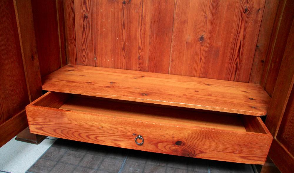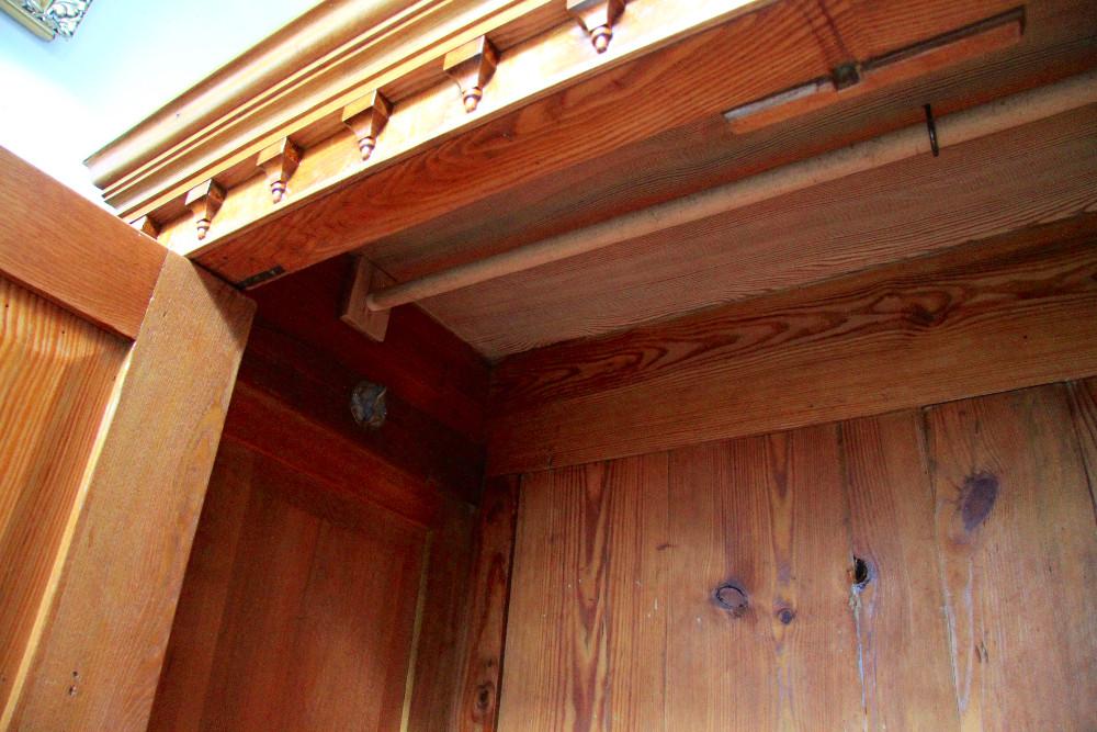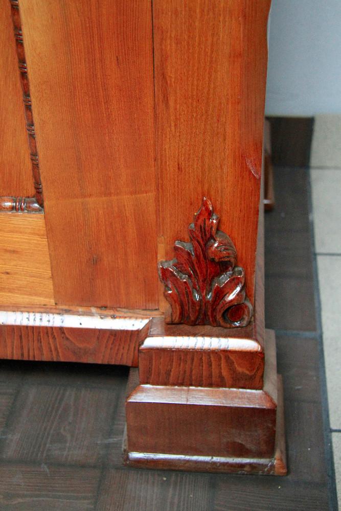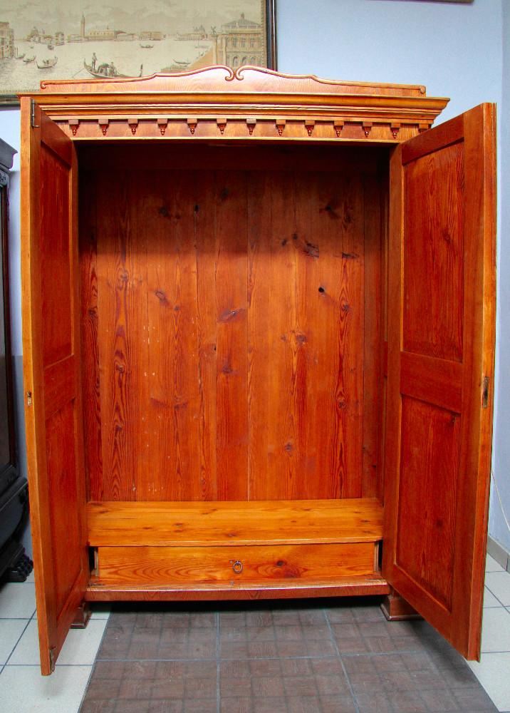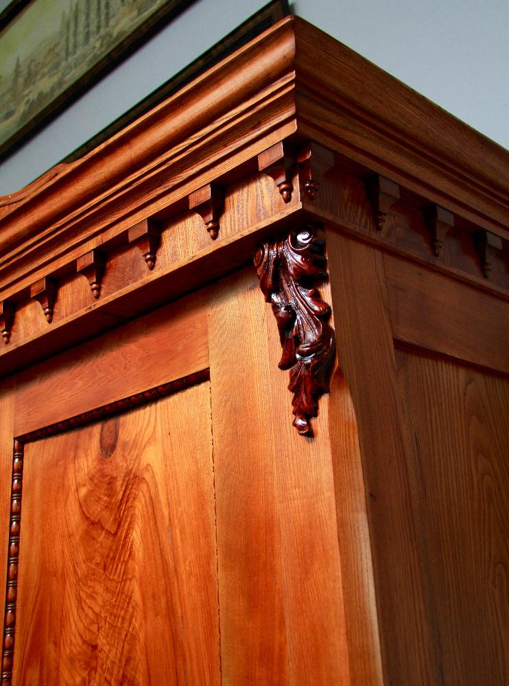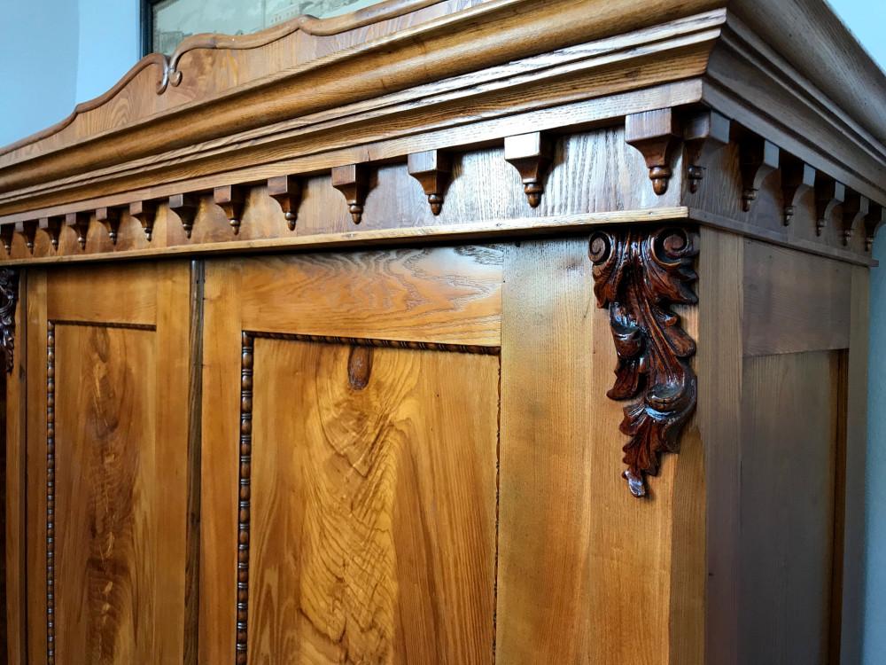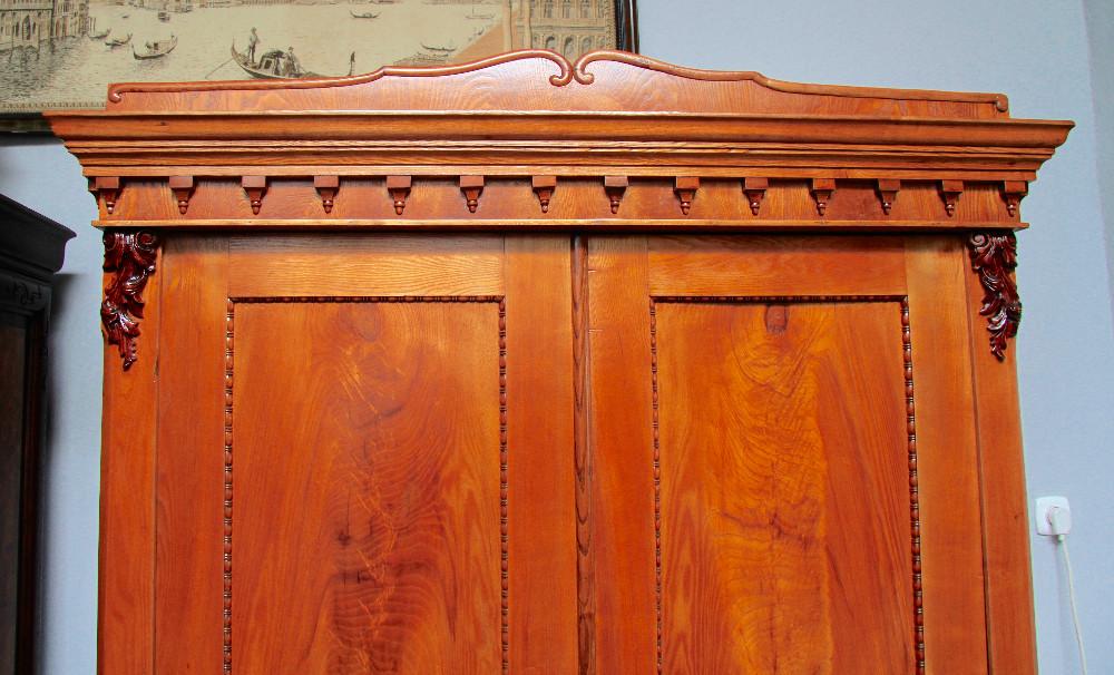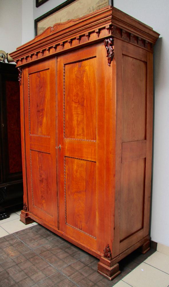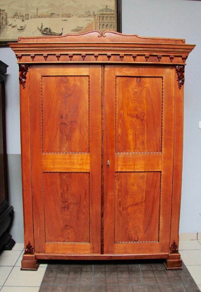 (nr 8501)Piękna orzechowa szafa z II połowy XIX w. Trudno jednoznacznie określić styl szafy. Mebel w dużej mierze oparty na Biedermeier'owskich trendach. Zarówno, linia, forma, prostota i część zdobień są kontynuacją tego stylu. Spokojne zwieńczenie dostało już nieco cieplejszego kształtu i zostało dodatkowo owinięte profilowaną listwą. Pojawiają się też elementy floralne dające znać, że w momencie jej narodzin mijała już pierwsza połowa XIX wieku.
