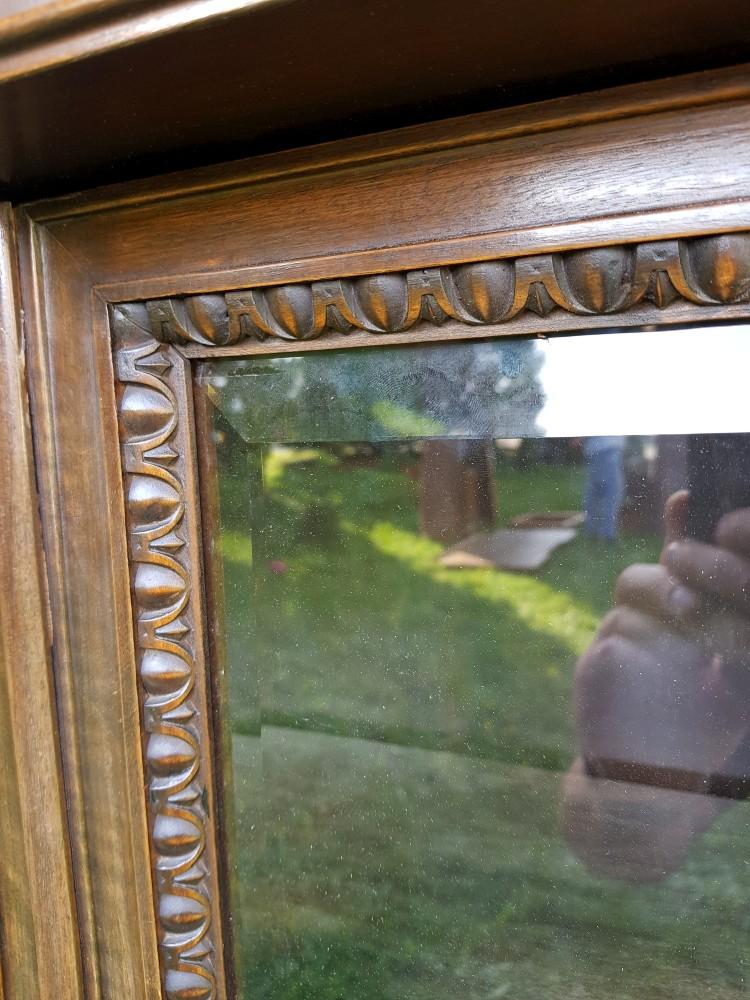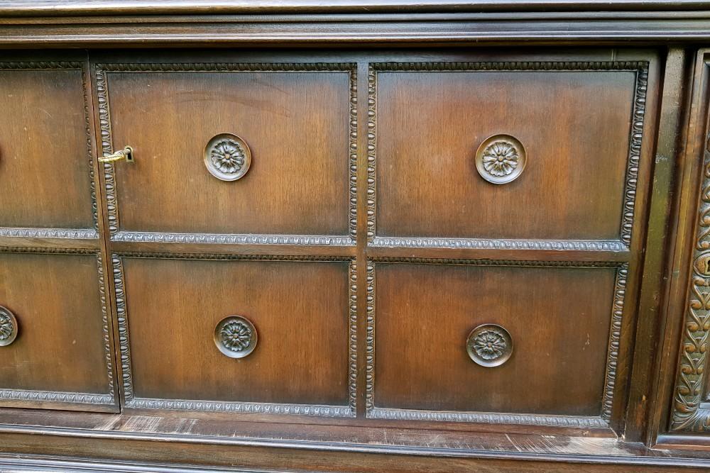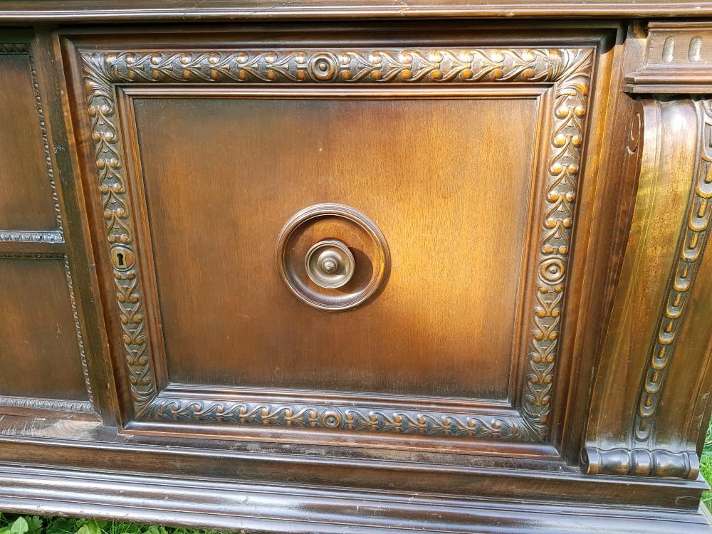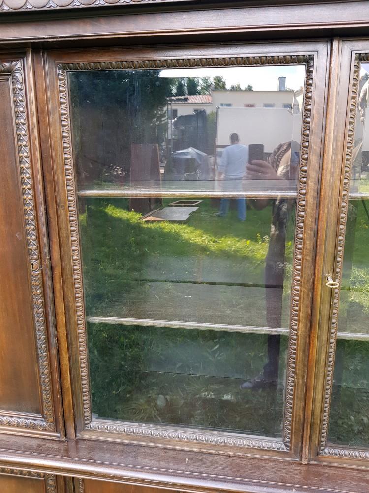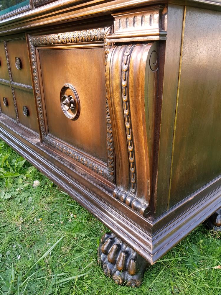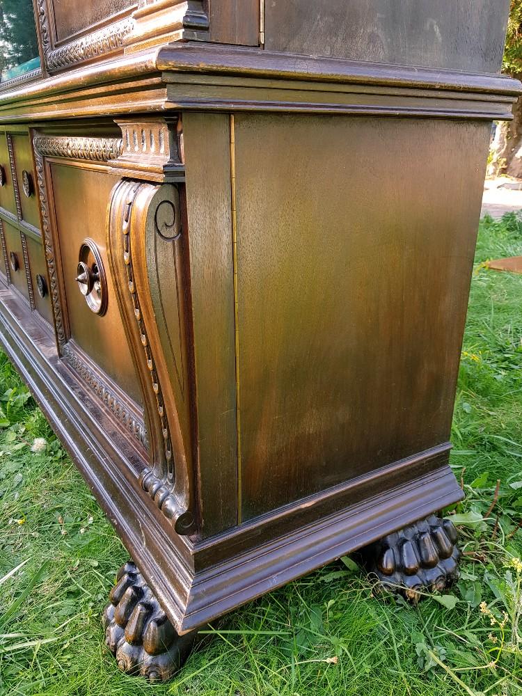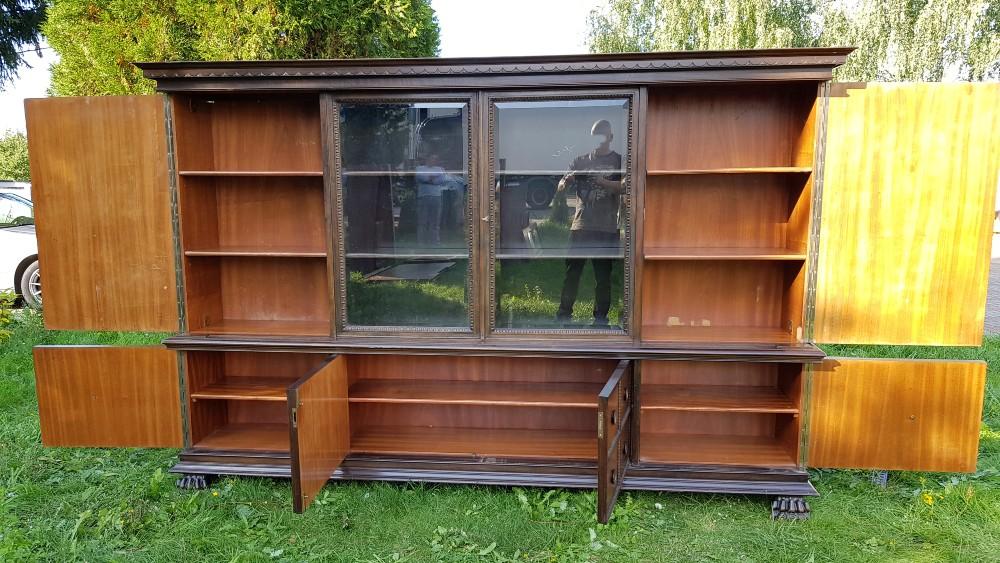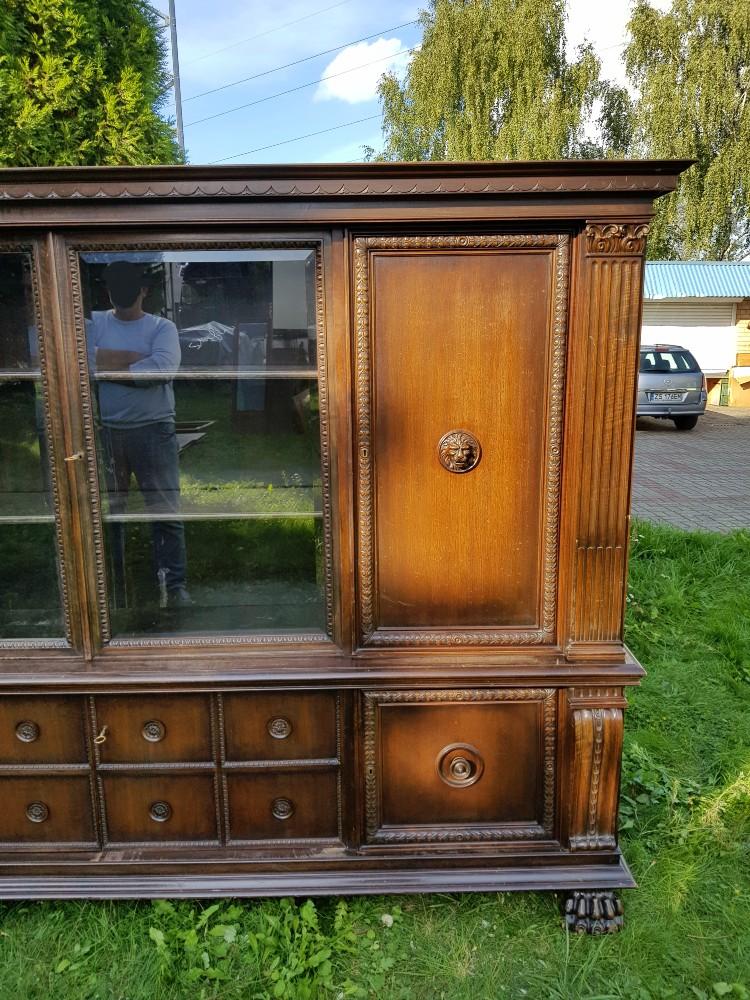 Orzechowa biblioteka neorenesansowa, na lwich łapach lata 30-te/40-te. Mebel dwuczęściowy, góra rozkładana. Biblioteka posiada fazowane szyby, po bokach znajdują się szerokie pilastry. W dolnej części szafki imitujące szuflady.