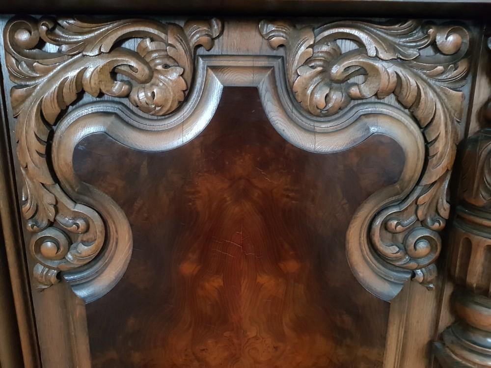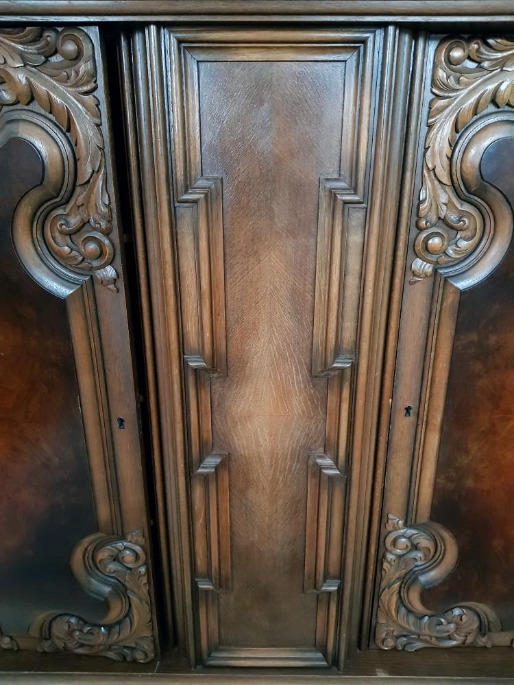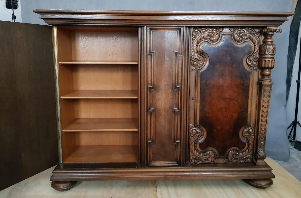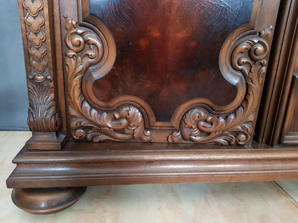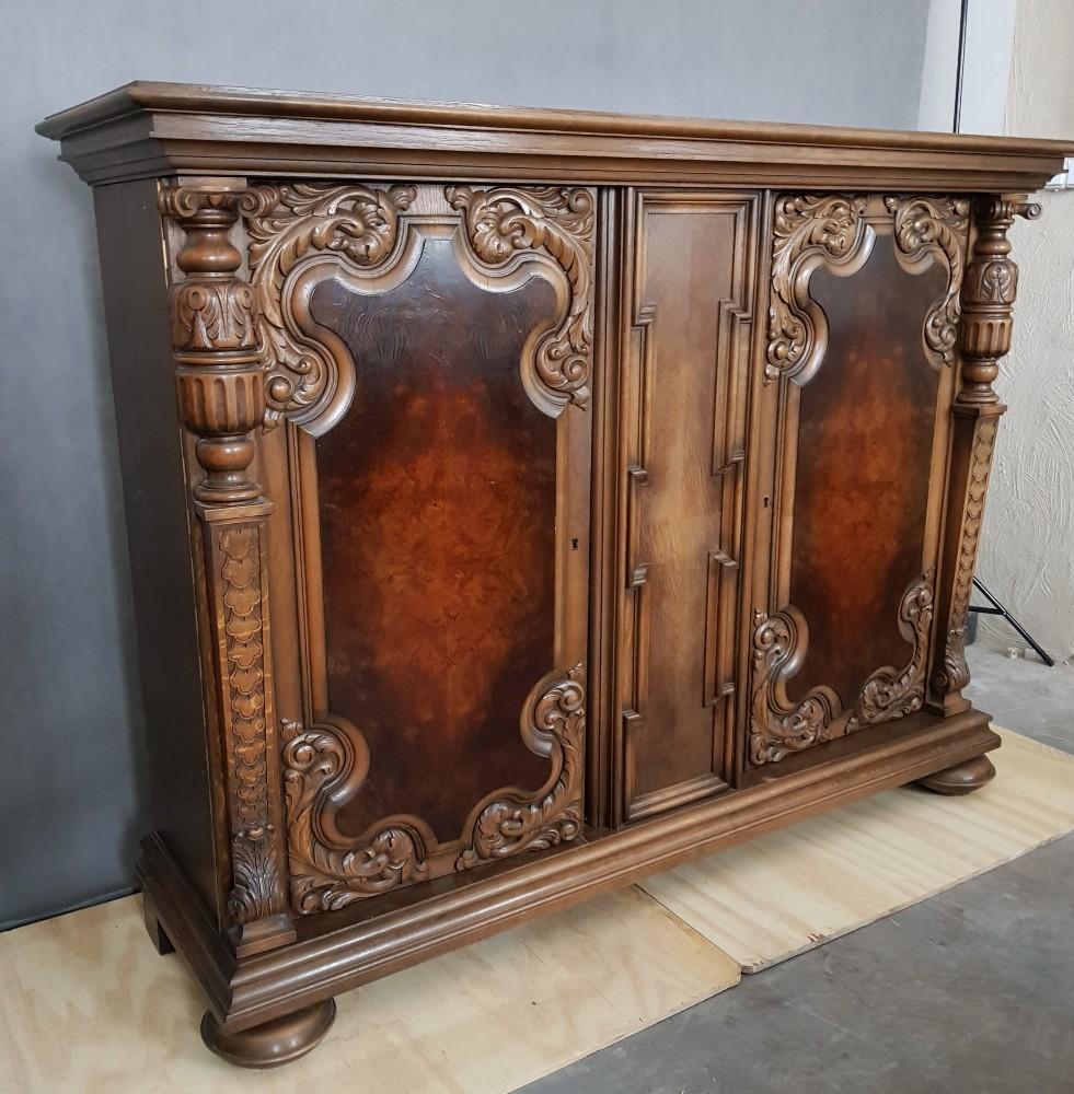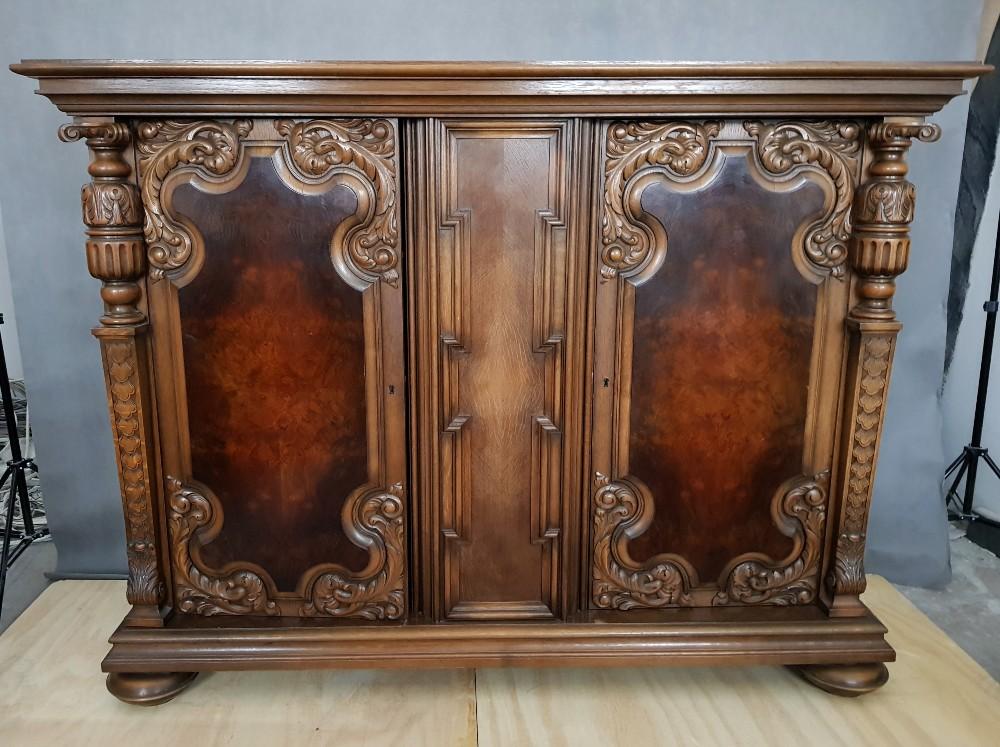 Stylizowana komoda flamandzka, lata 50-te. Mebel dębowy z orzechowymi czeczotami na drzwiach, udekorowany bogatymi zdobieniami snycerskimi. Nogi toczone, styl kolumn i pilastrów nawiązuje do eklektyzmu.