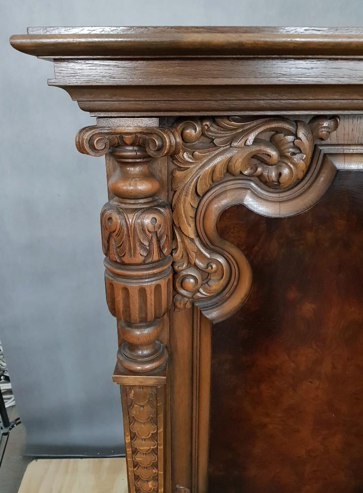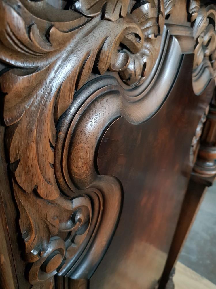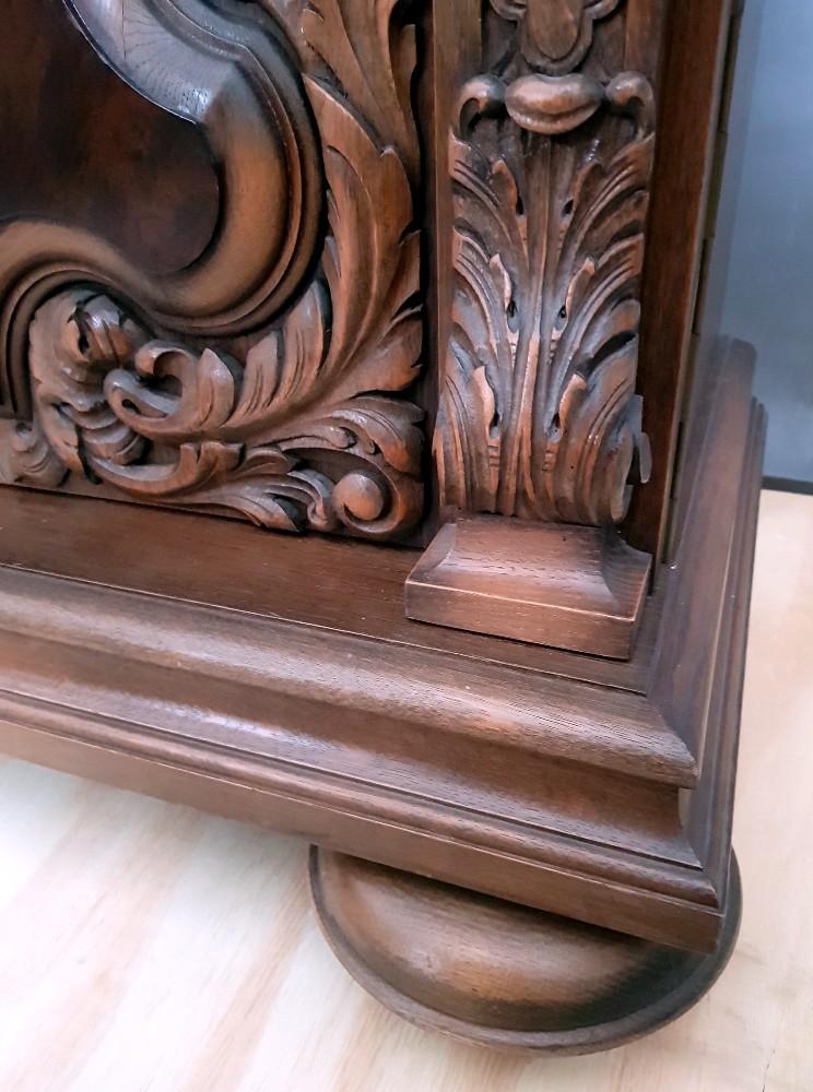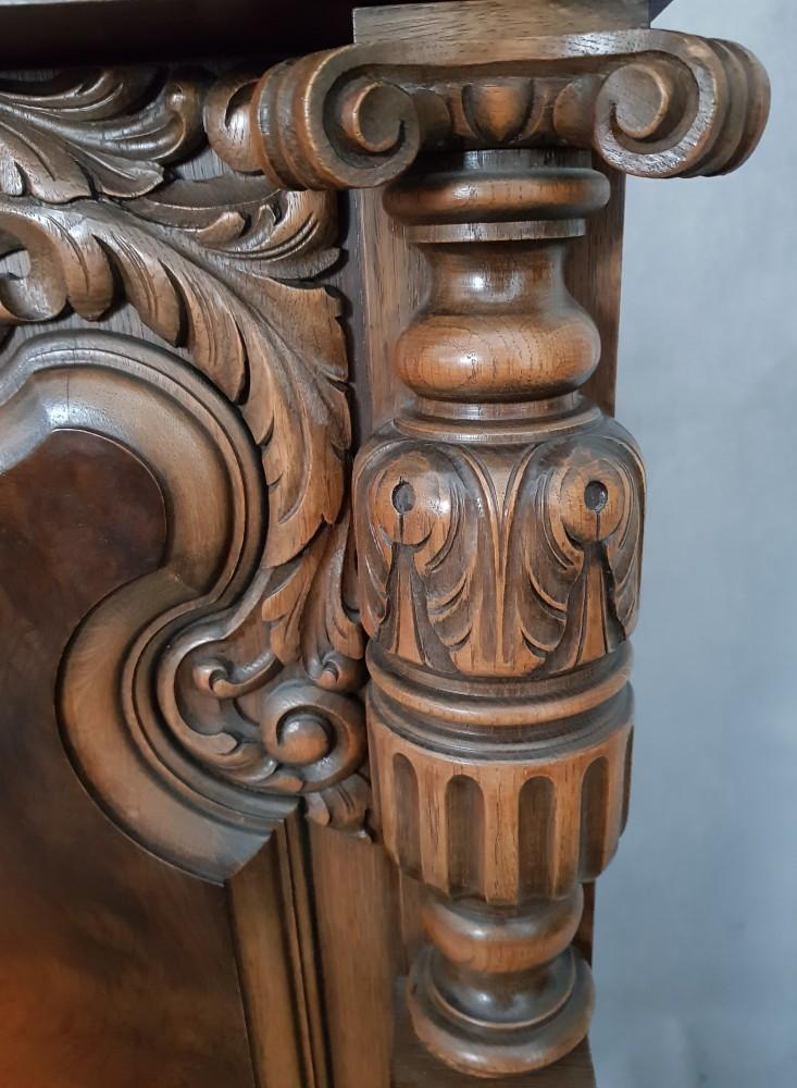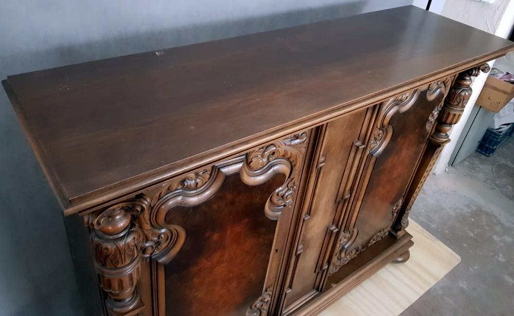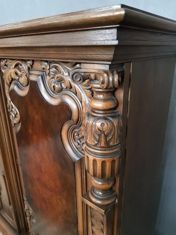 Stylizowana komoda flamandzka, lata 50-te. Mebel dębowy z orzechowymi czeczotami na drzwiach, udekorowany bogatymi zdobieniami snycerskimi. Nogi toczone, styl kolumn i pilastrów nawiązuje do eklektyzmu.