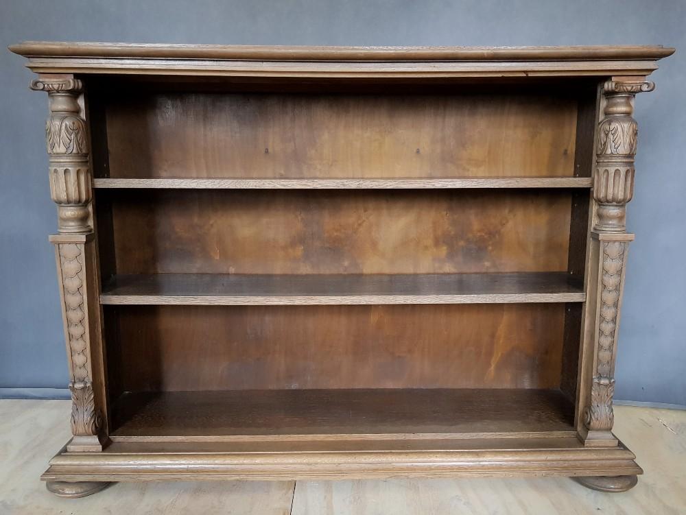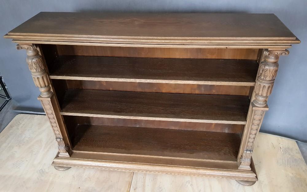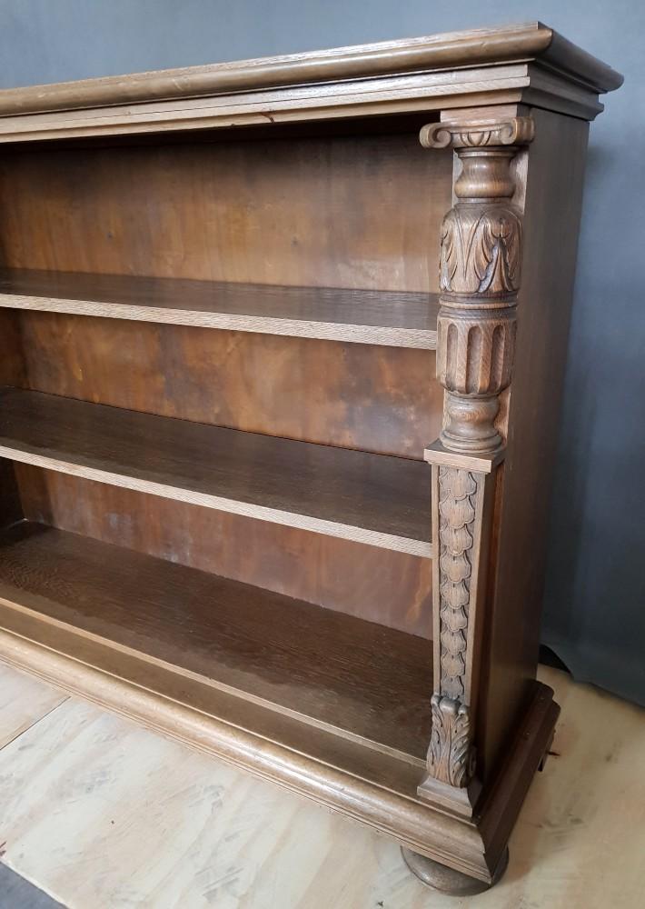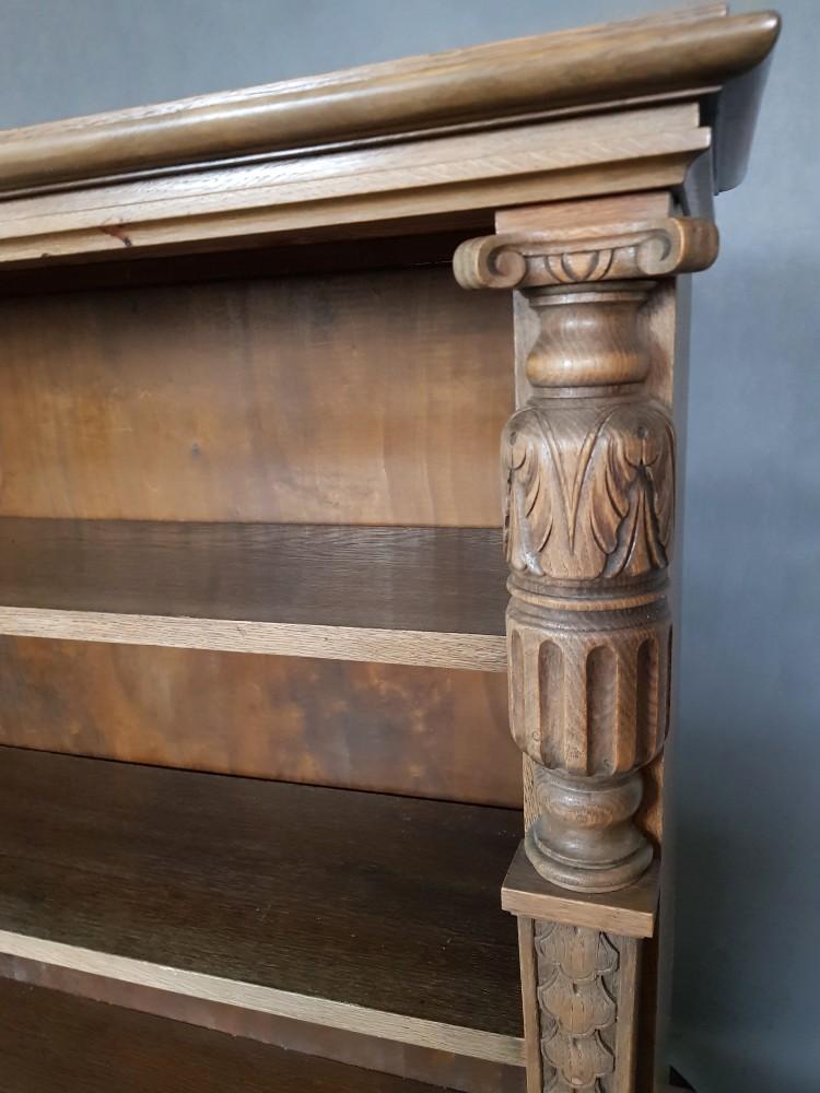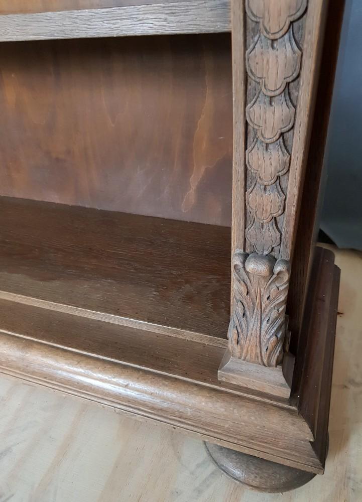 Stylizowana biblioteczka-regał flamandzka, lata 50-te. Mebel dębowy, posiada dwie półki z regulowaną wysokością. Nogi toczone, styl kolumn i pilastrów nawiązuje do eklektyzmu.