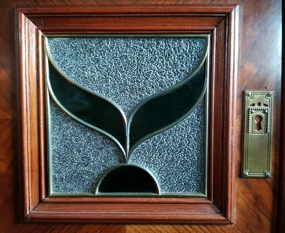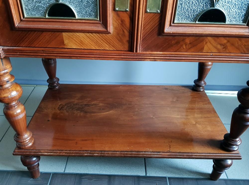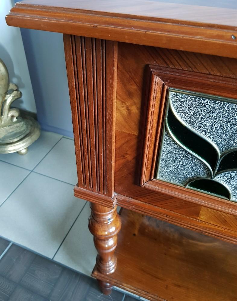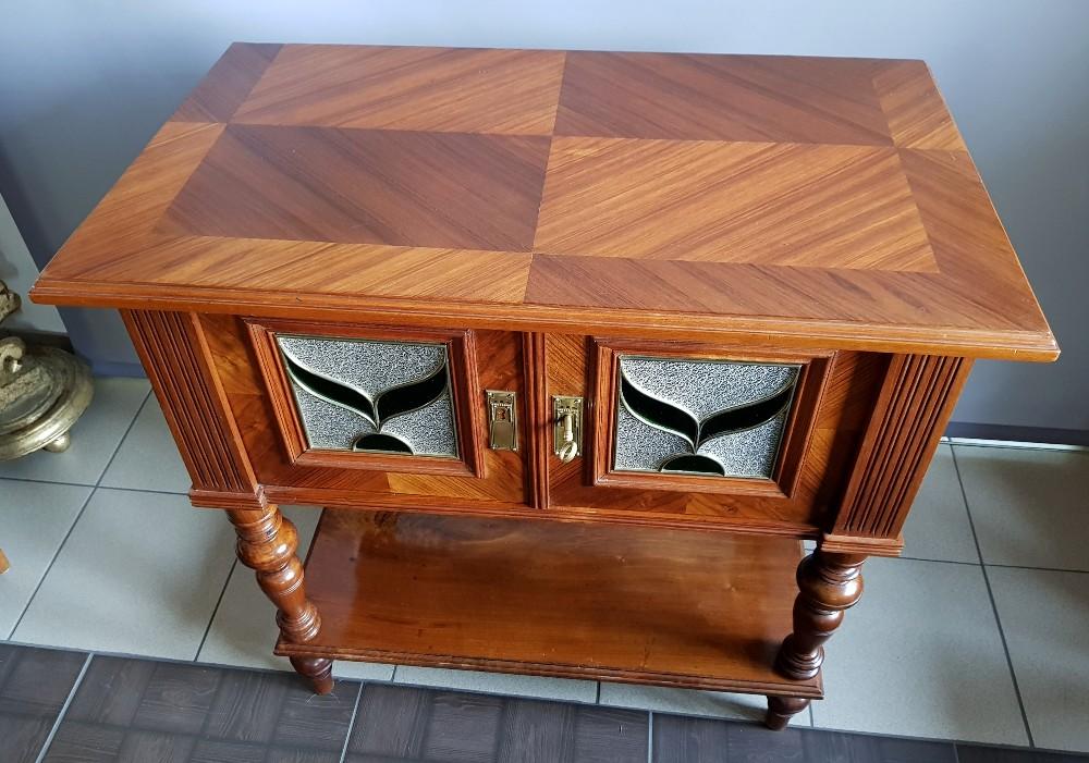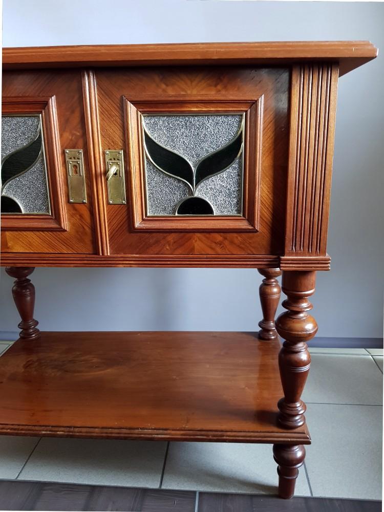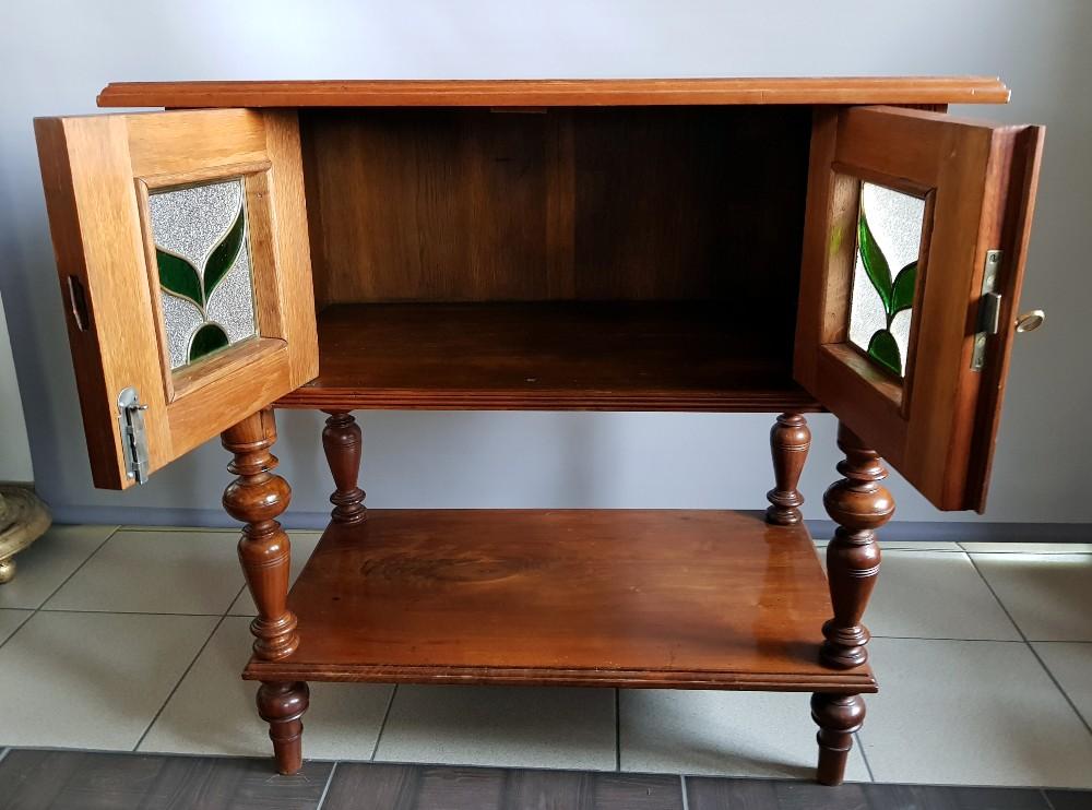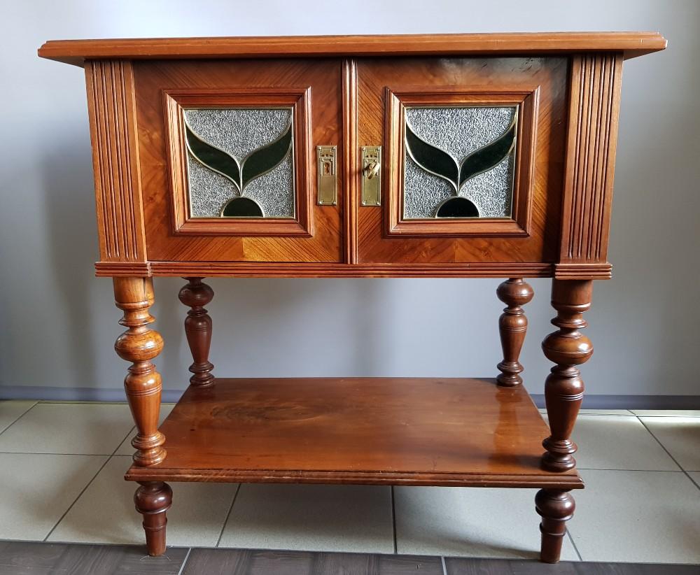 Orzechowa komódka eklektyczna z końca XIX w. Mebel posiada dodatkowy dolny blat, wsparty na czterech toczonych nogach charakterystycznych dla swojej epoki. Na drzwiach znajdują się witrażowe zdobienia.