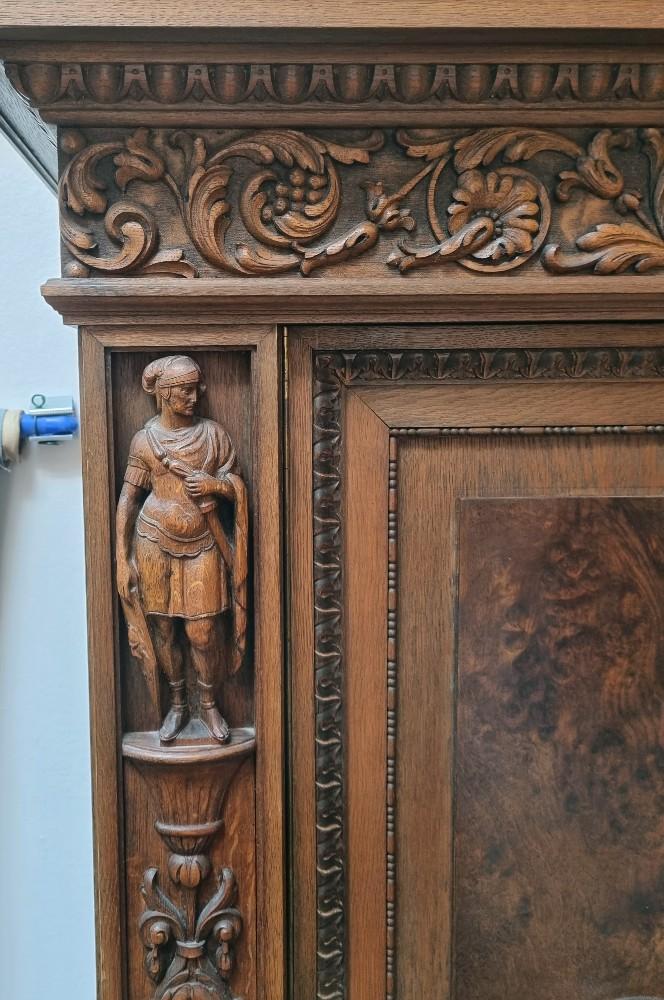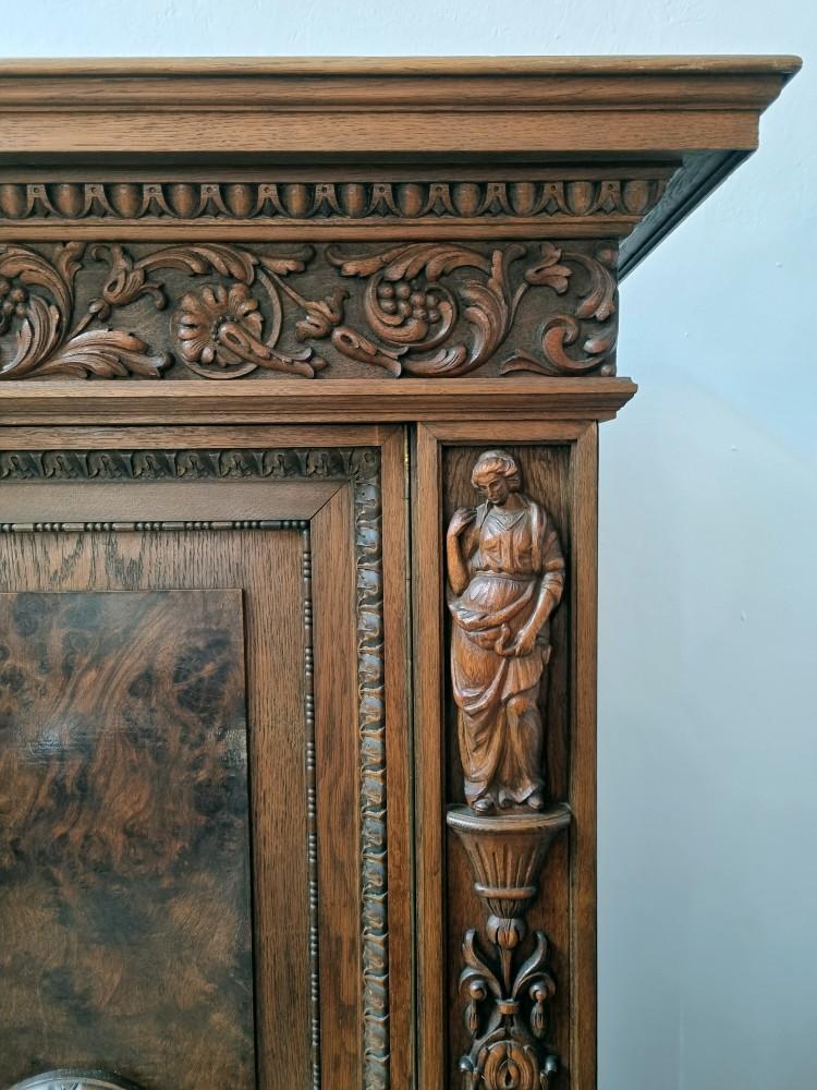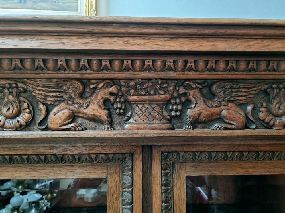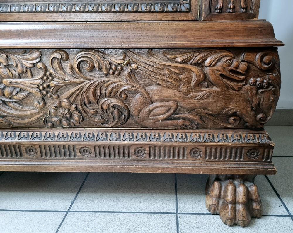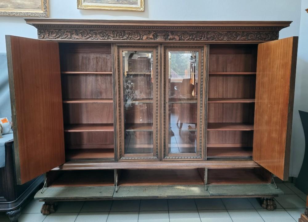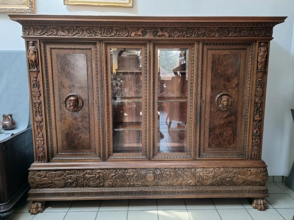 Orzechowa biblioteka neorenesansowa z początku XX w. Mebel bardzo bogato zdobiony pięknymi rzeźbieniami. Po bokach widnieją figury postaci, na drzwiach wizerunki kobiety i mężczyzny. Na bocznych drzwiach orzechowe czeczoty, szyby fazowane.