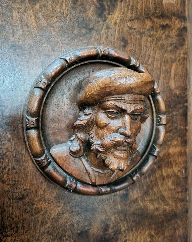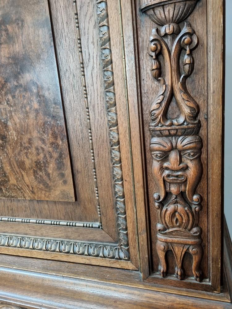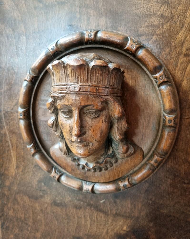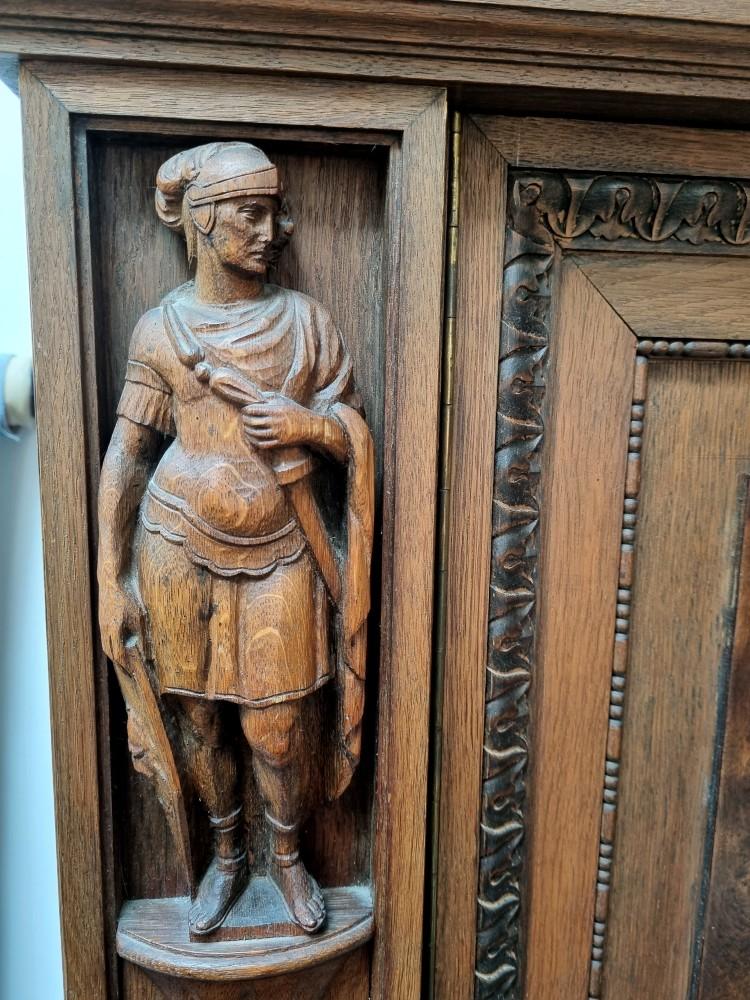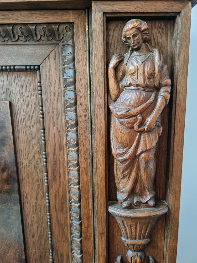 Orzechowa biblioteka neorenesansowa z początku XX w. Mebel bardzo bogato zdobiony pięknymi rzeźbieniami. Po bokach widnieją figury postaci, na drzwiach wizerunki kobiety i mężczyzny. Na bocznych drzwiach orzechowe czeczoty, szyby fazowane.