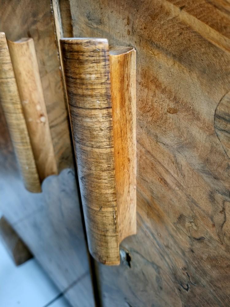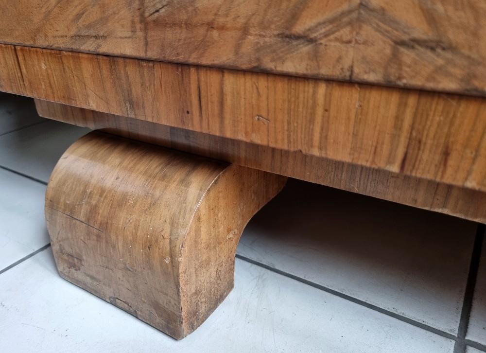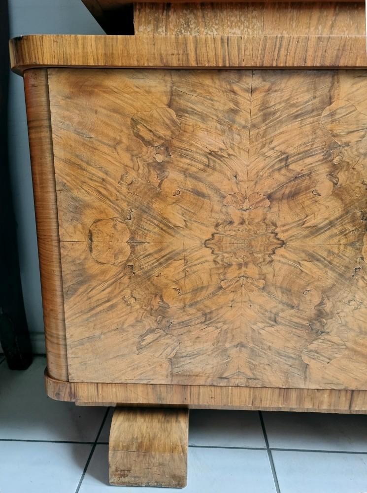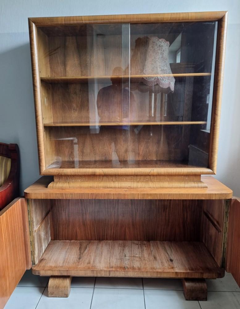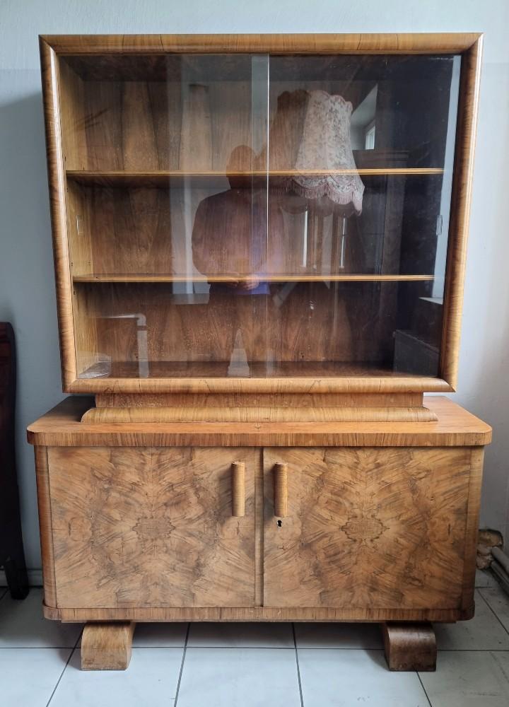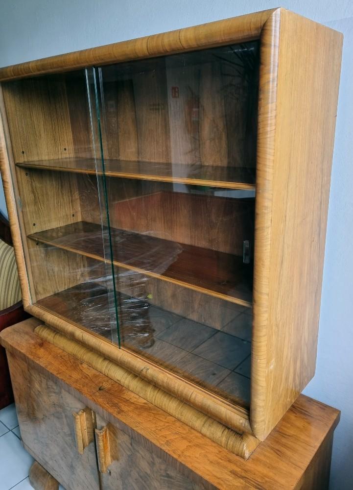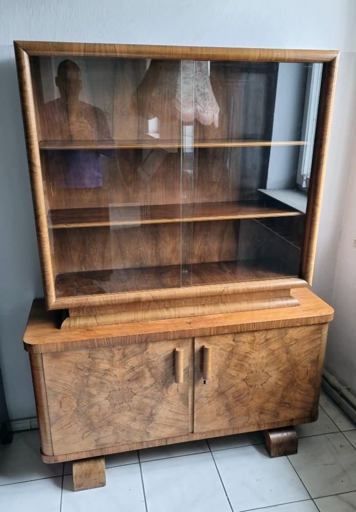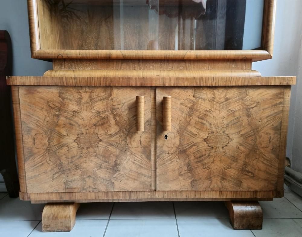 Orzechowa, dwuczęściowa witryna, którą śmiało można nazwać rasowym przedstawicielem stylu Art Deco. Mebel z lat 30/40-tych. W dolnej części mebla na drzwiach znajdują się czeczoty orzechowe, uchwyty drewniane.