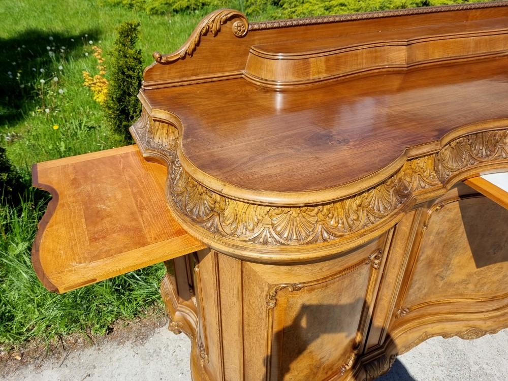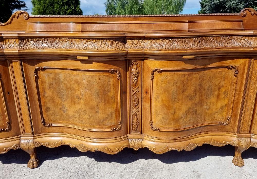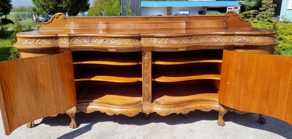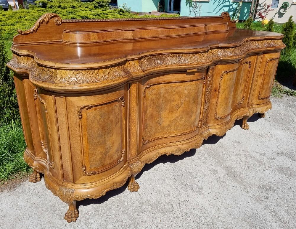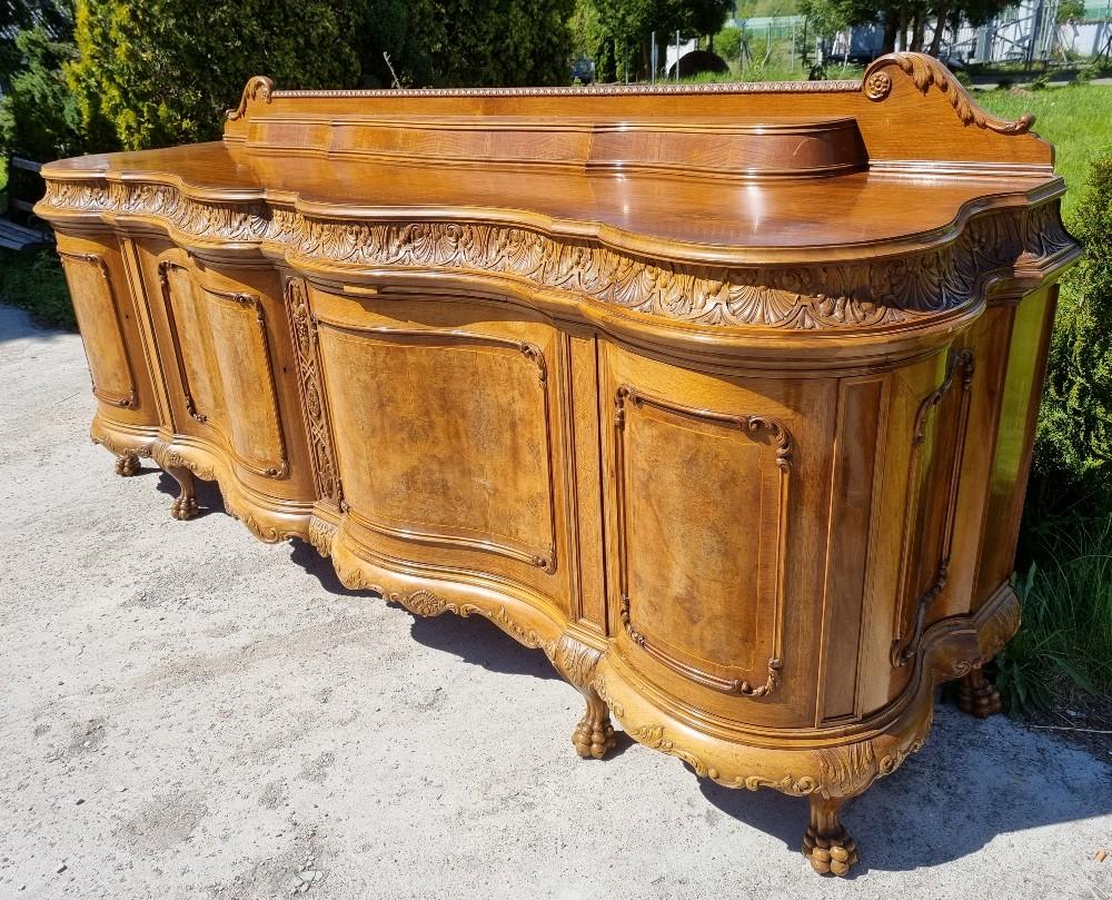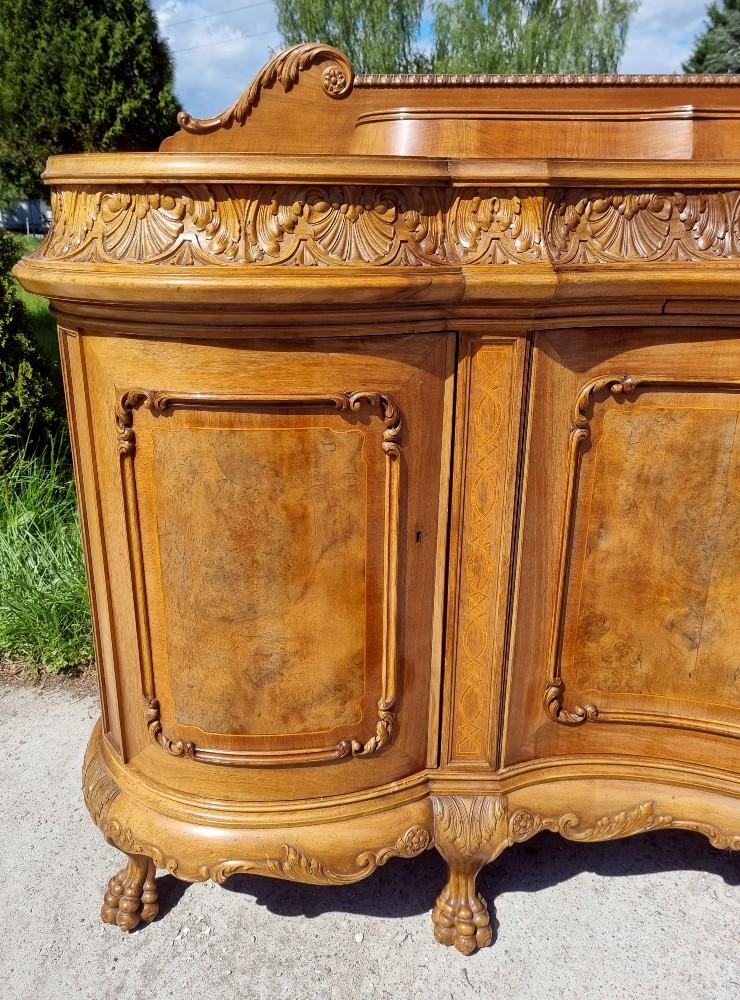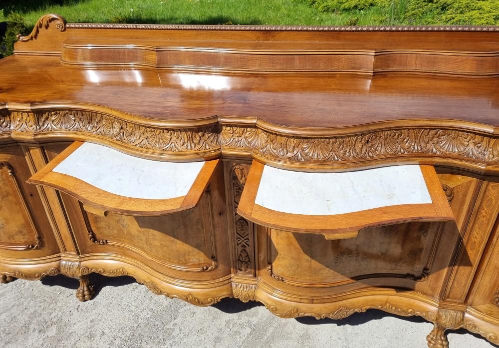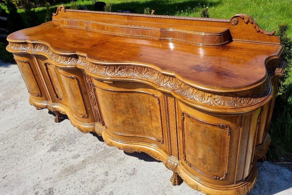 Niepowtarzalny, orzechowy bufet Chippendale z okresu międzywojennego. Mebel posiada profilowane fronty, przez co pomimo sporych gabarytów wydaje się bardzo zgrabny. Na drzwiach znajdują się czeczoty orzechowe, otoczone snycerskimi zdobieniami, grodzie intarsjowane. W blacie znajdują się dwie szuflady z bogato rzeźbionymi frontami. Poniżej szuflad ukryte są dwa wysuwane blaty z marmurami. Zdecydowanie rzadziej spotykanym elementem, są dwa dodatkowe, wysuwane po bokach blaty. Bufet posiada ściąganą nadstawkę.
