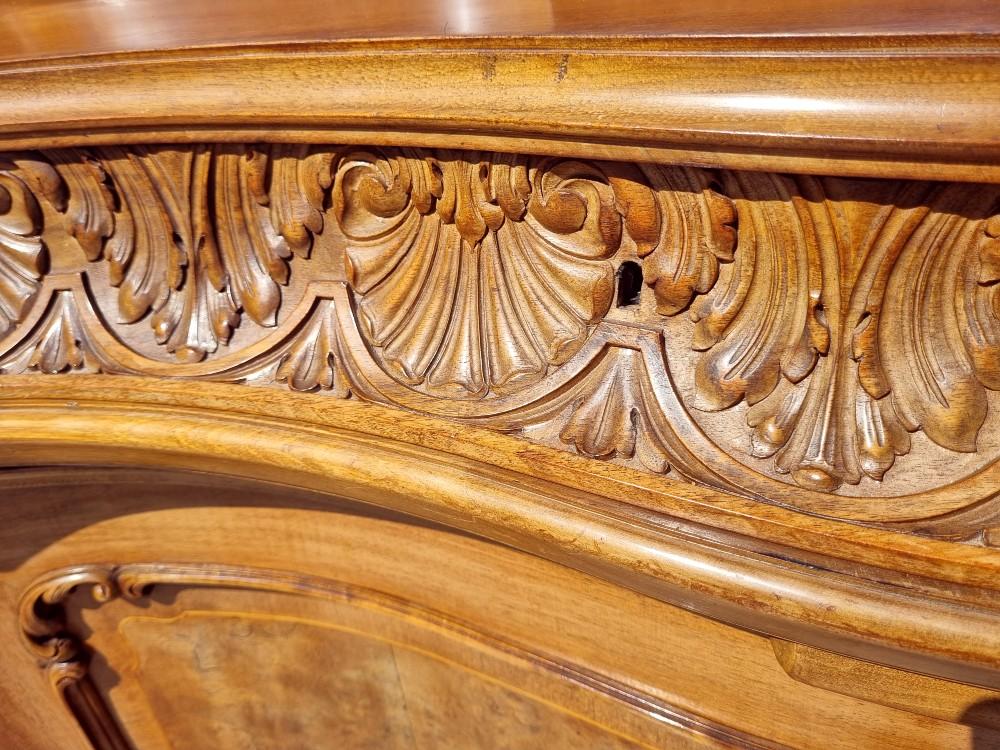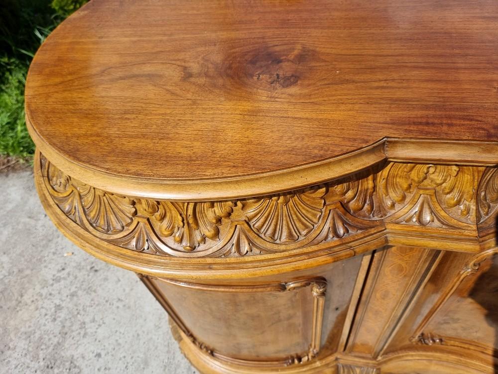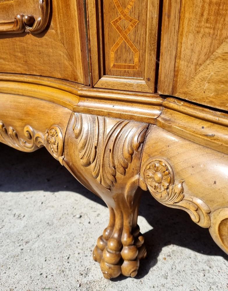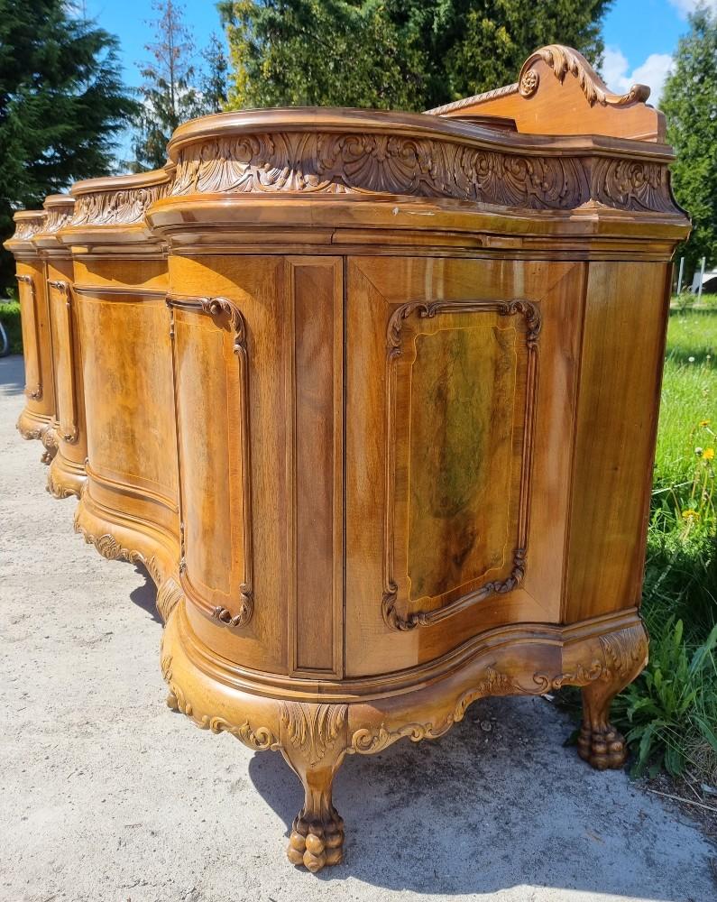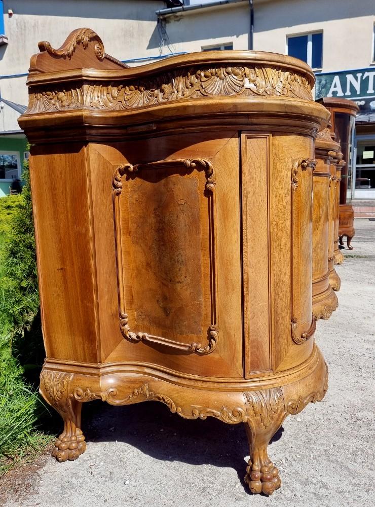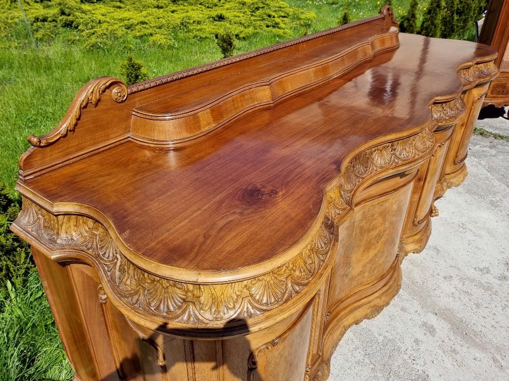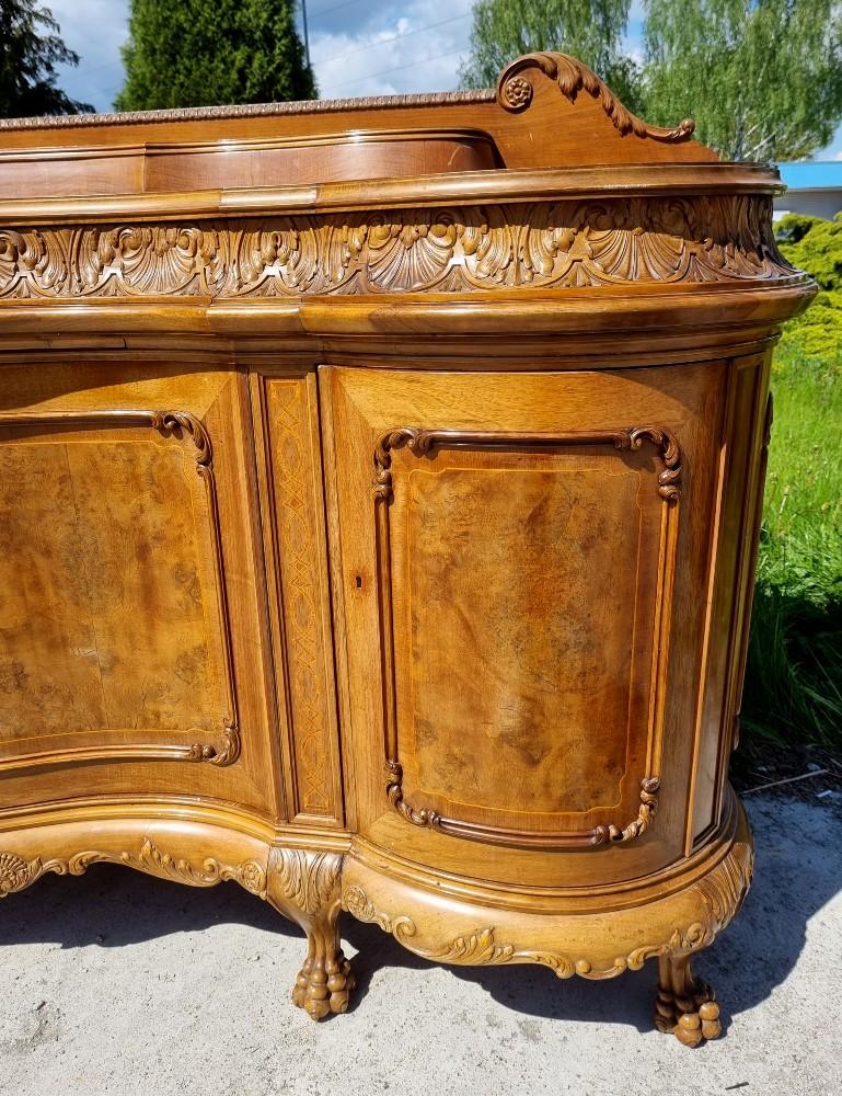 Niepowtarzalny, orzechowy bufet Chippendale z okresu międzywojennego. Mebel posiada profilowane fronty, przez co pomimo sporych gabarytów wydaje się bardzo zgrabny. Na drzwiach znajdują się czeczoty orzechowe, otoczone snycerskimi zdobieniami, grodzie intarsjowane. W blacie znajdują się dwie szuflady z bogato rzeźbionymi frontami. Poniżej szuflad ukryte są dwa wysuwane blaty z marmurami. Zdecydowanie rzadziej spotykanym elementem, są dwa dodatkowe, wysuwane po bokach blaty. Bufet posiada ściąganą nadstawkę.