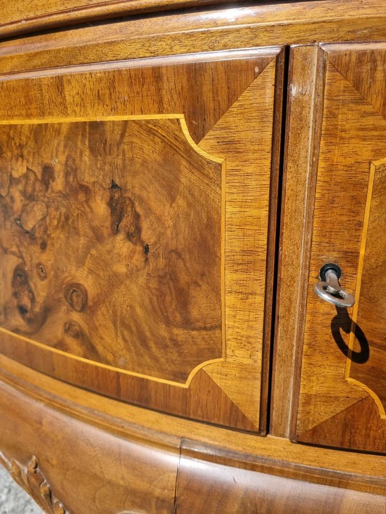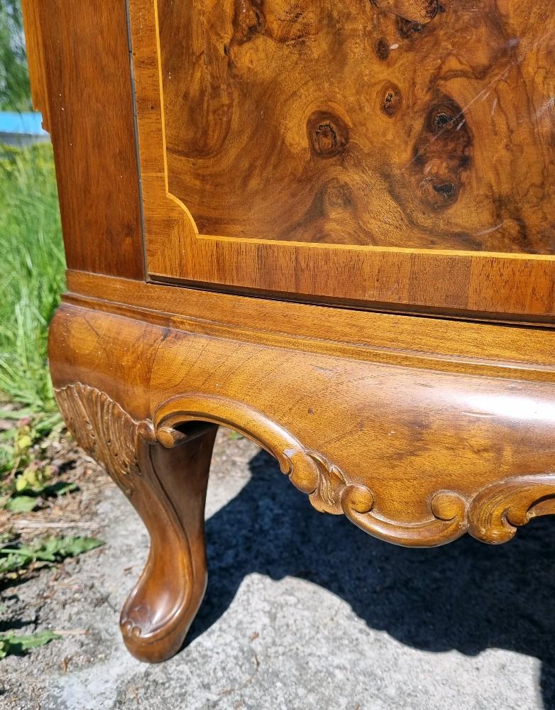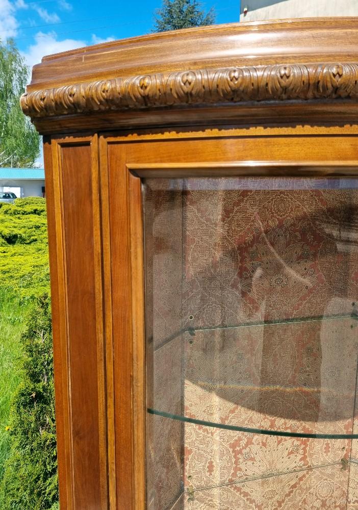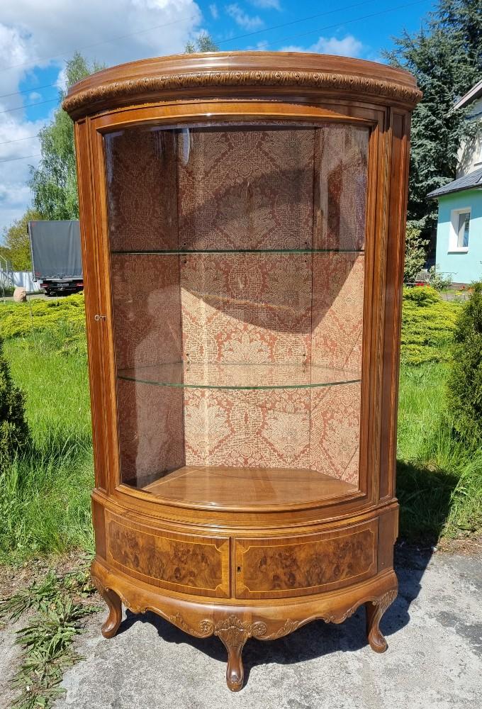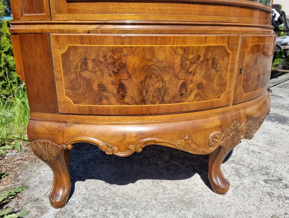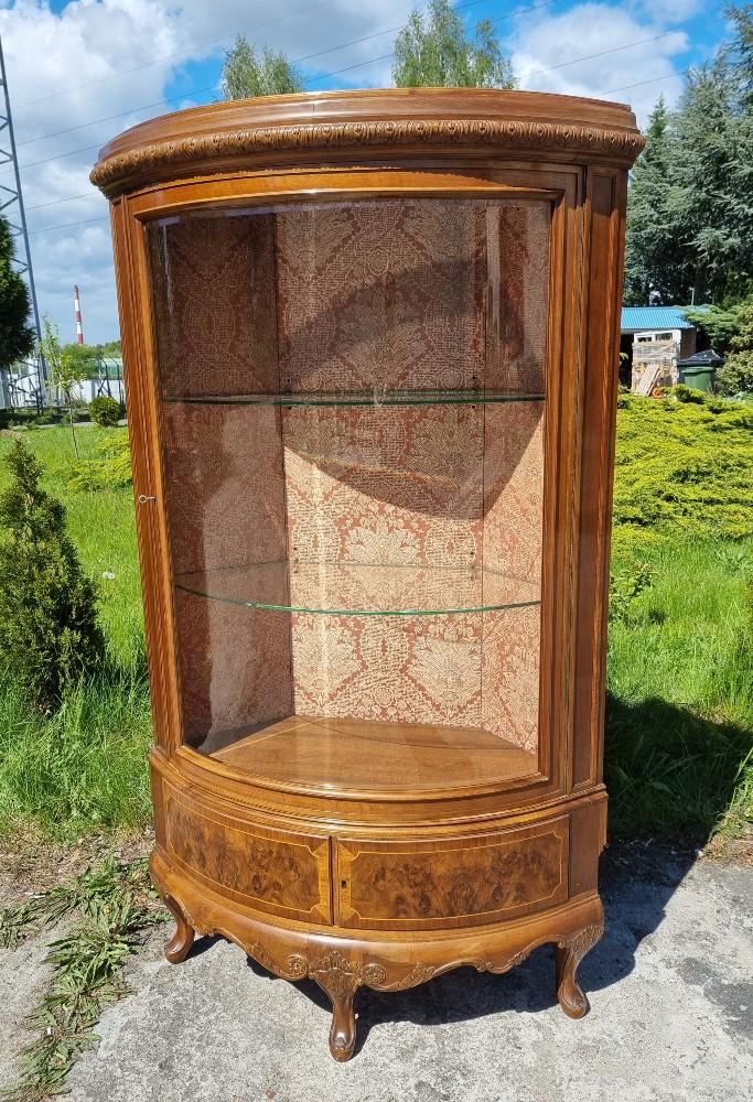 Narożna, orzechowa witryna Chippendale z okresu międzywojennego. Na dolnych drzwiczkach znajdują się czeczoty orzechowe otoczone intarsjami. Szyba gięta, fazowana.