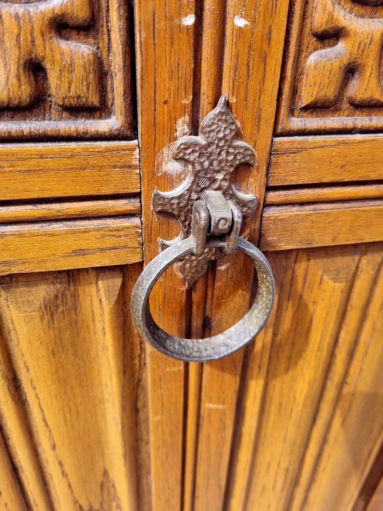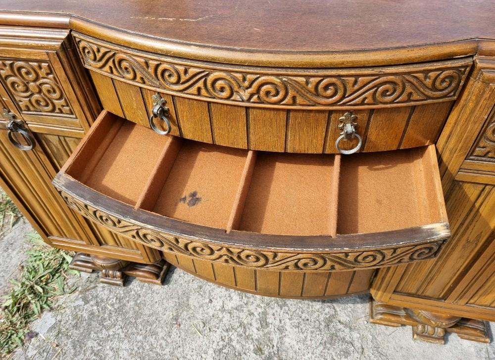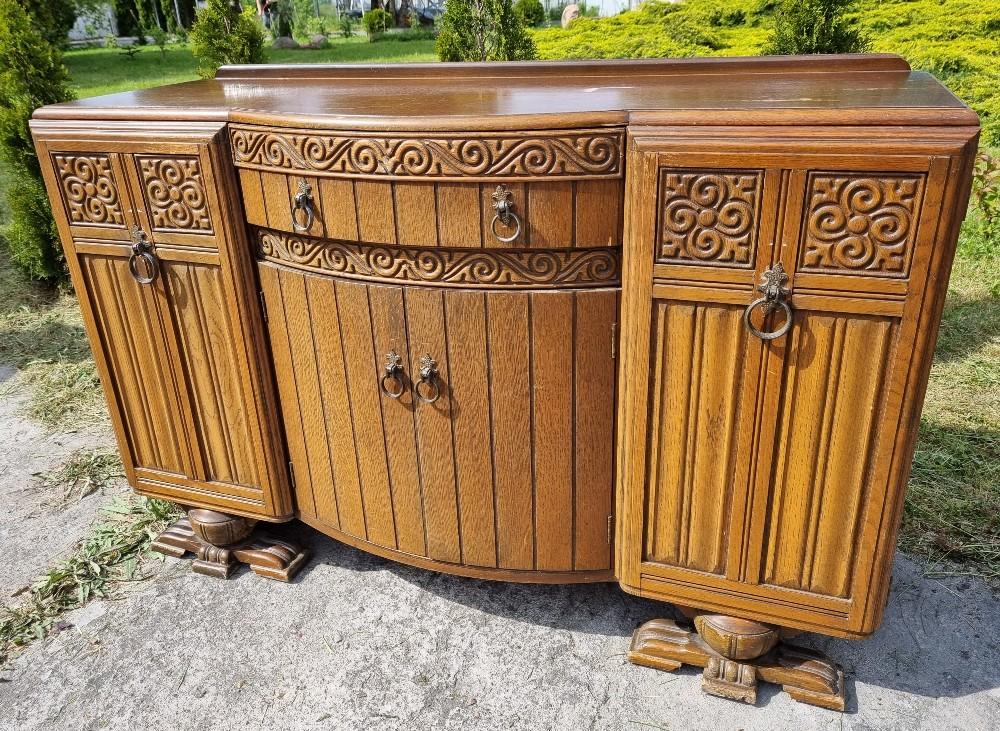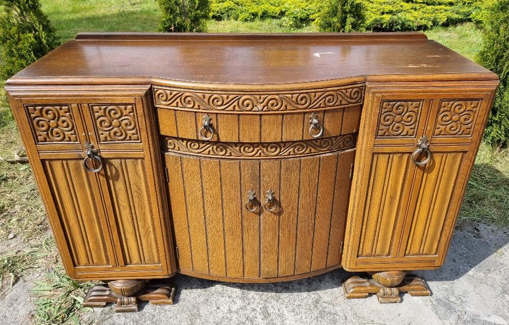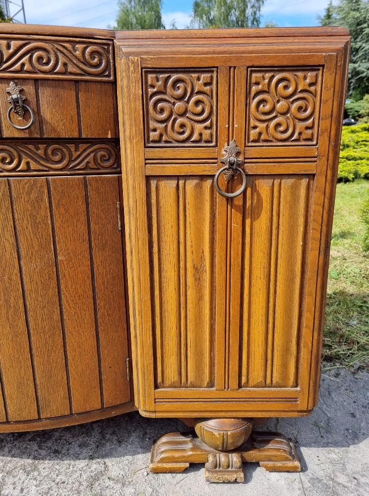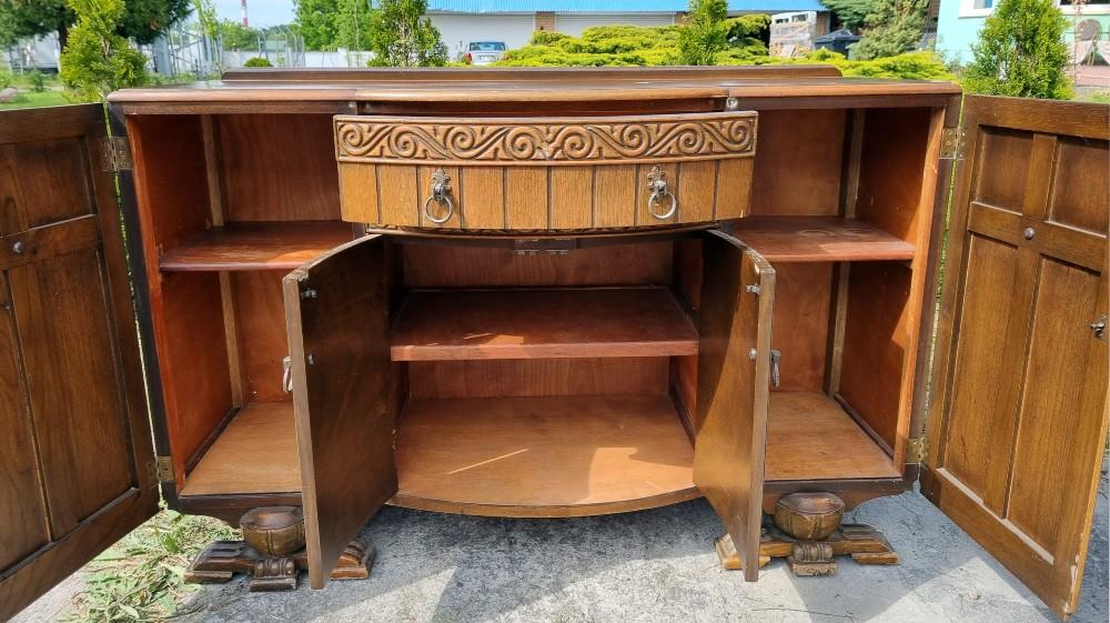 Dębowa, czterodrzwiowa komoda Art Deco. Mebel pochodzi z Wielkiej Brytanii. Na frontach widnieją delikatne zdobienia snycerskie. Uchwyty i okucia wykonane z mosiądzu. Mebel stoi na masywnych, zdobionych nogach.