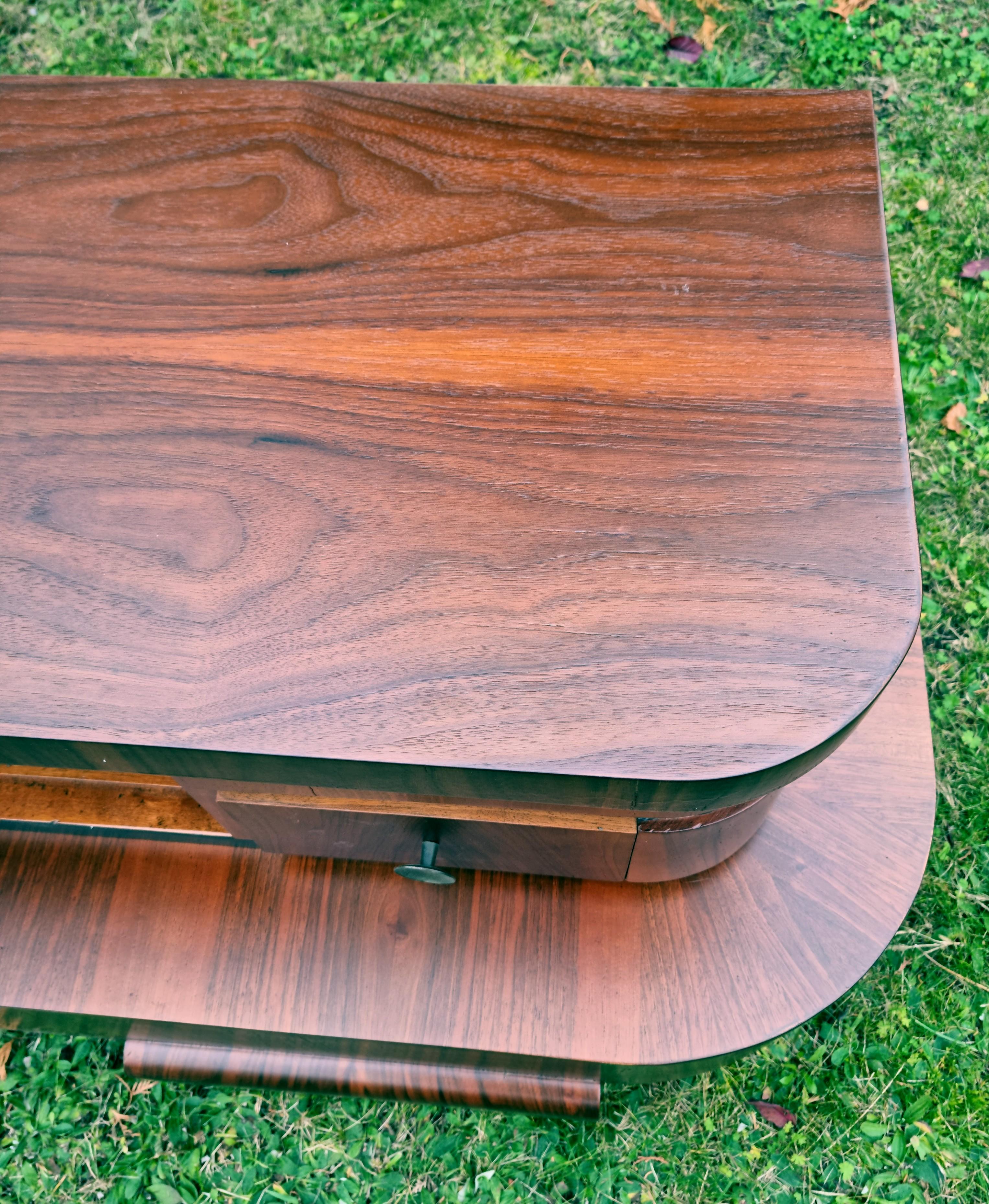 (nr 8702)Niesamowity mebel art deco. Już w tytule zasugerowaliśmy możliwość wykorzystania mebla jako komodę np pod telewizor. Nie ukrywamy, że ta jak "ją" nazwaliśmy esencja stylu w założeniu była sporą biblioteczką, w której stłuczono gięte szyby. Szybko wpadliśmy na pomysł zmiany przeznaczenia mebla i jego przebudowy do dzisiejszych potrzeb. Na rynku brakuje takich mebli nie tylko do loftów, dużych salonów i pomieszczeń wyposażonych w stylu art deco. Czystość formy nieskażona żadnymi zdobieniami przemawia do nas podwójnie, gdyż mamy w ofercie obok drugi mebel od kompletu, który może pomóc w ciekawy, niepowtarzalny sposób ozdobić i wyposażyć Wasze wnętrze. Ten mebel jest wart wielu pochwalnych peanów, zdjęcia oddają zaledwie cząstkę jego ciężaru i piękna. Docenić w pełni można je tylko na żywo i to w sporym pomieszczeniu. Ten nietypowy bufet wymaga przestrzeni. Mebel oprócz miejsca na wielki telewizor, ma też półkę na sprzęt audio i inne potrzeby, oraz dwie niewielkie szuflady. Telewizor może też zawisnąć nad meblem użyczając więcej miejsca na górnej półce na sprzęt audio.