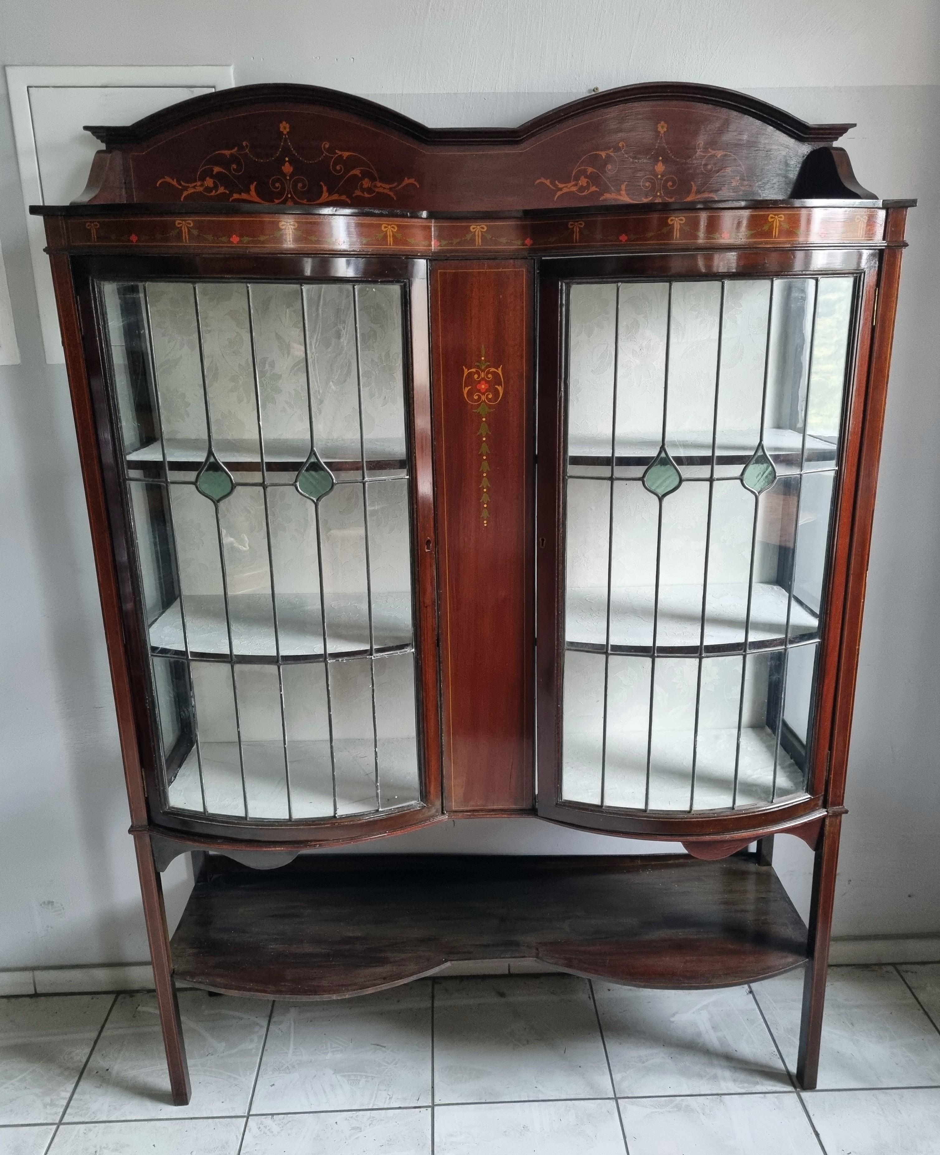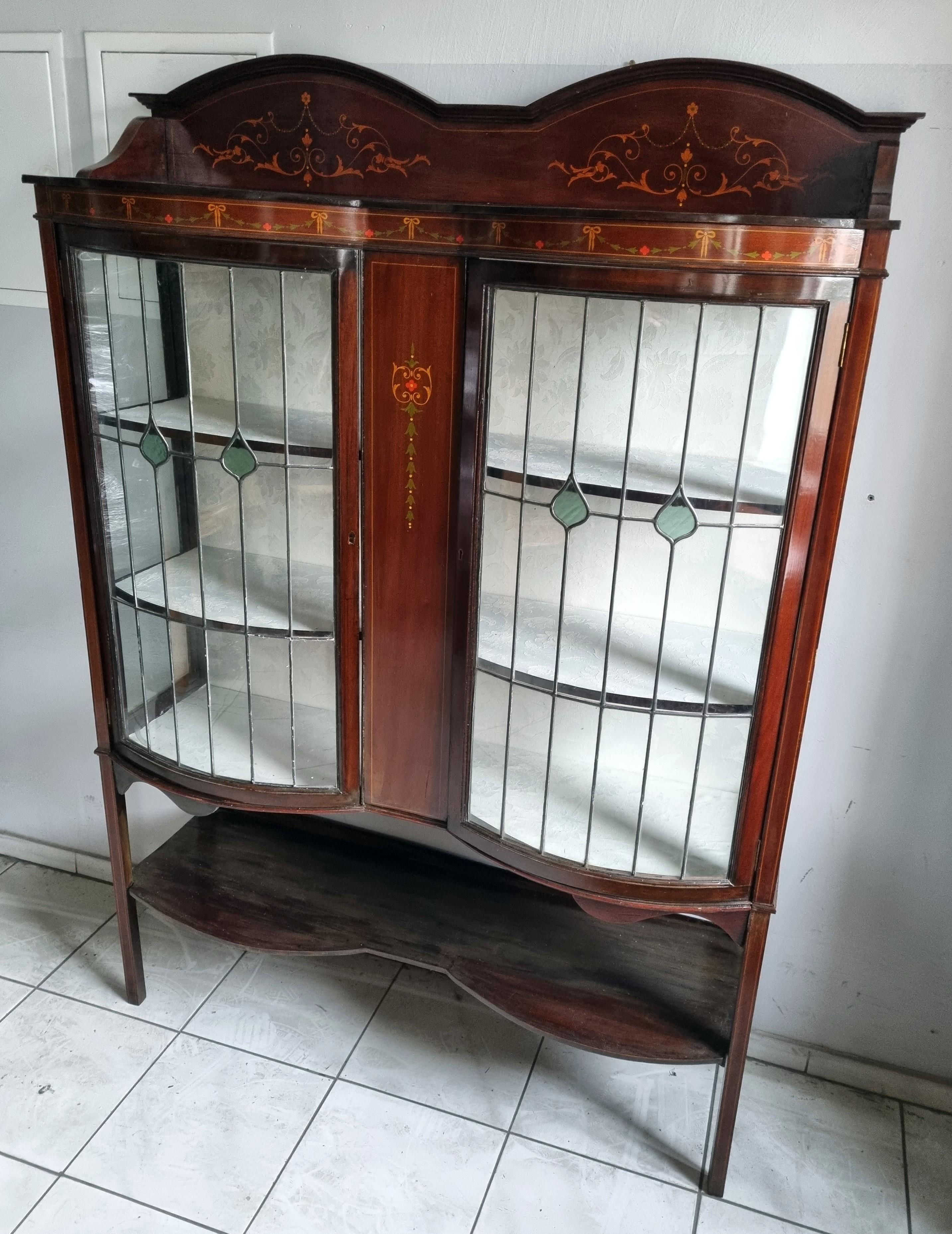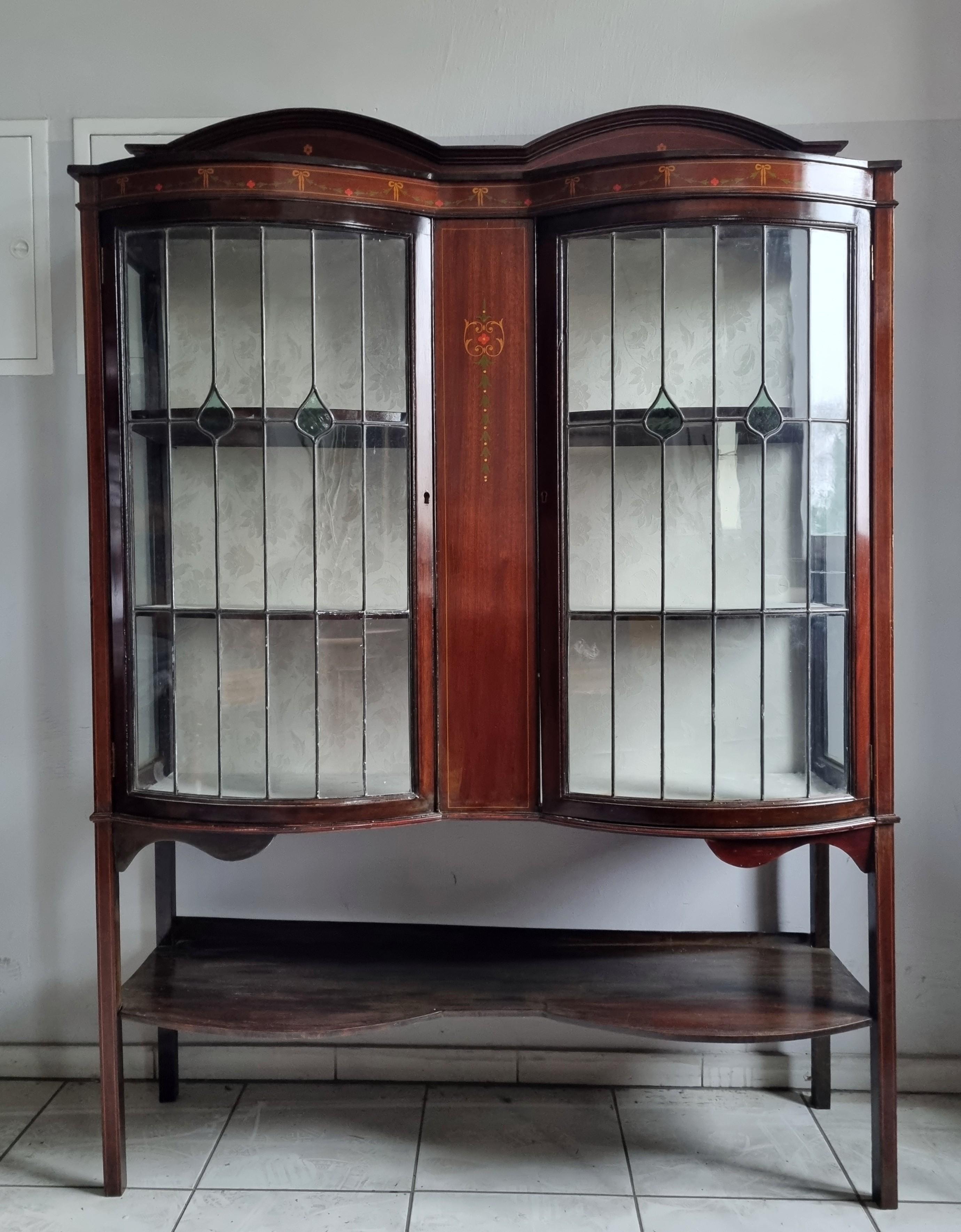 Wiktoriańska witryna - serwantka z przełomu XIX i XX wieku. Mebel fornirowany intarsjowanym mahoniem. Szyby wykonane z witrażu. W środku znajdują się dwie drewniane półki. Na dole dodatkowy blat. Mebel jest nierozkładany.