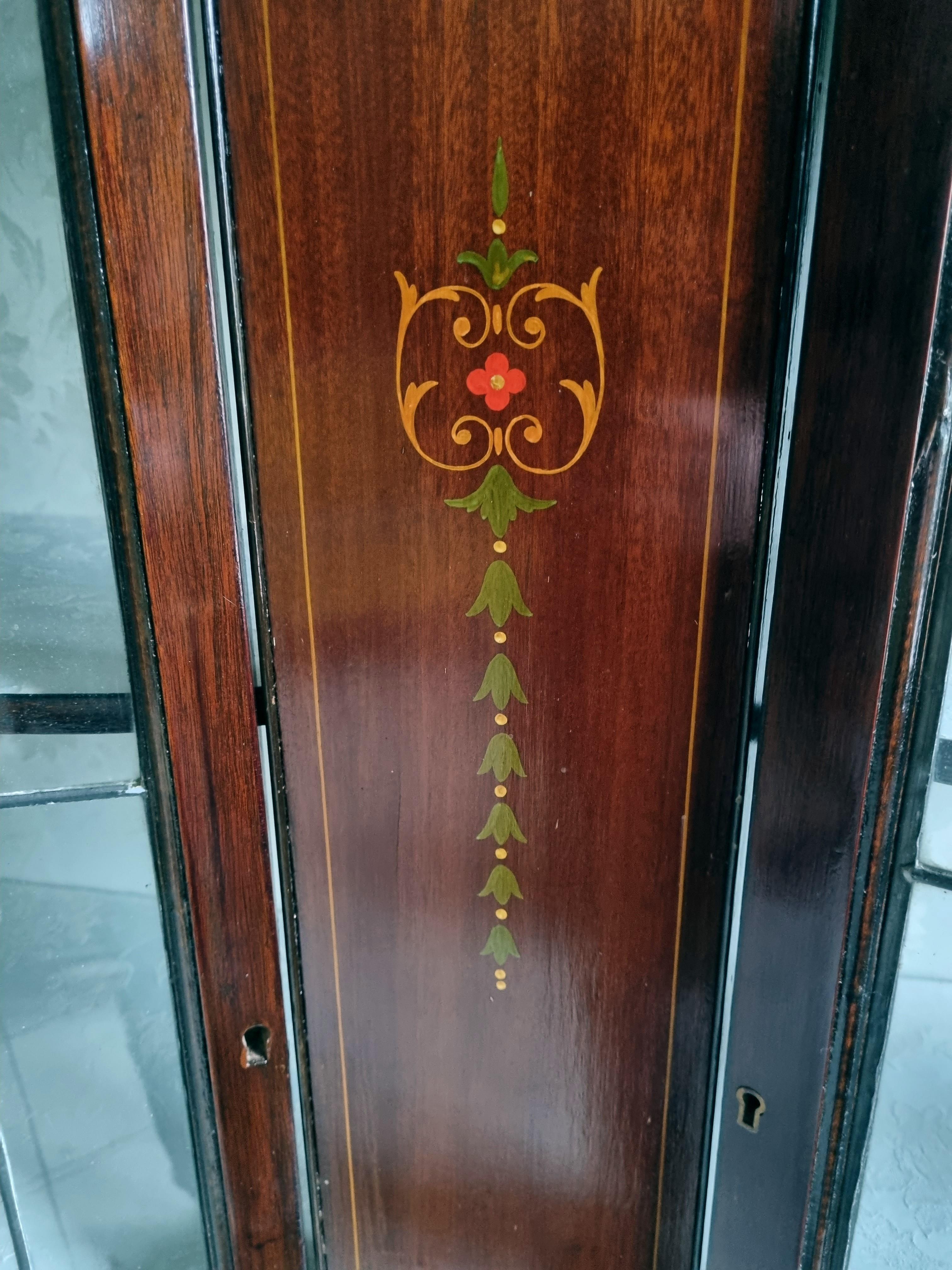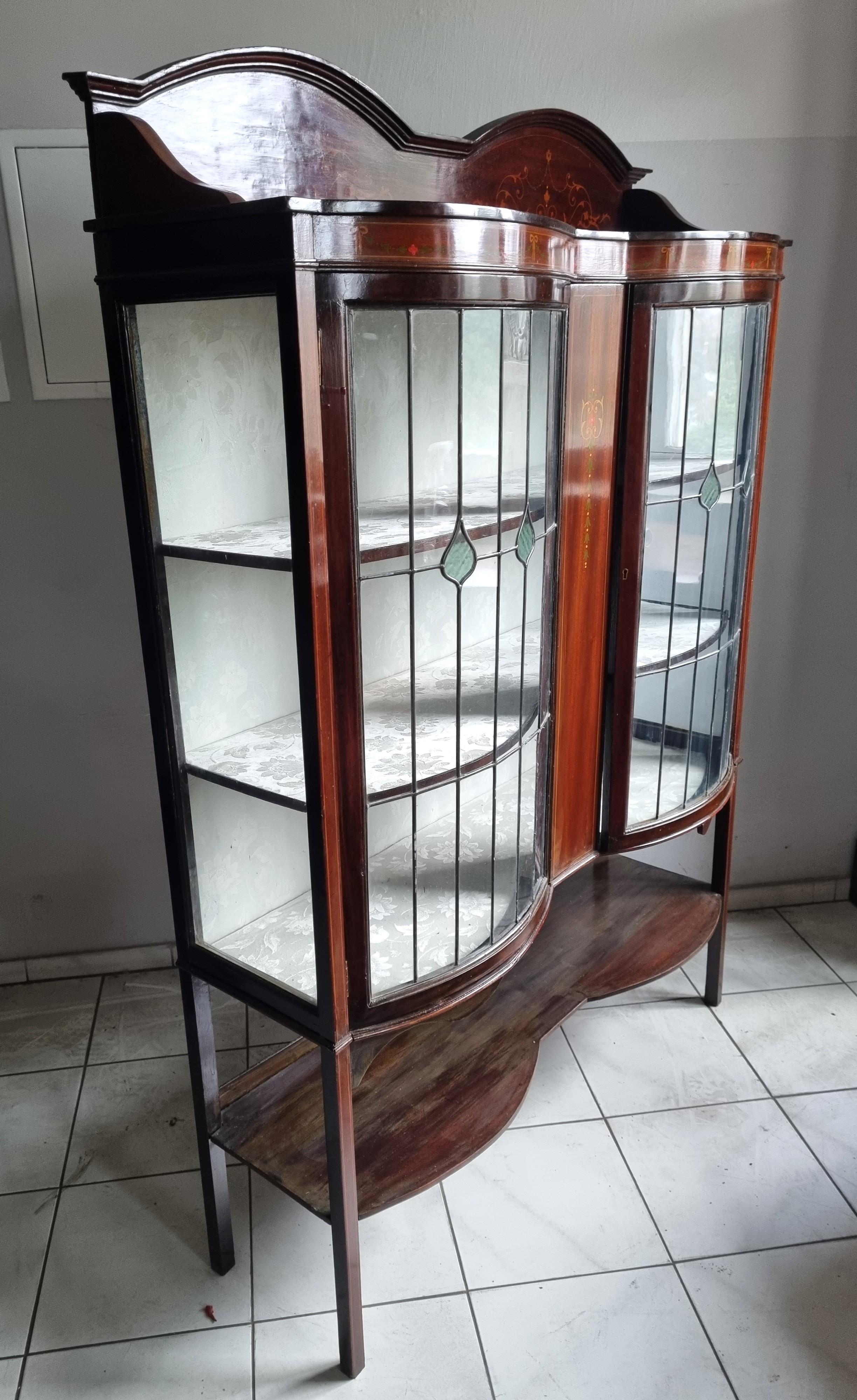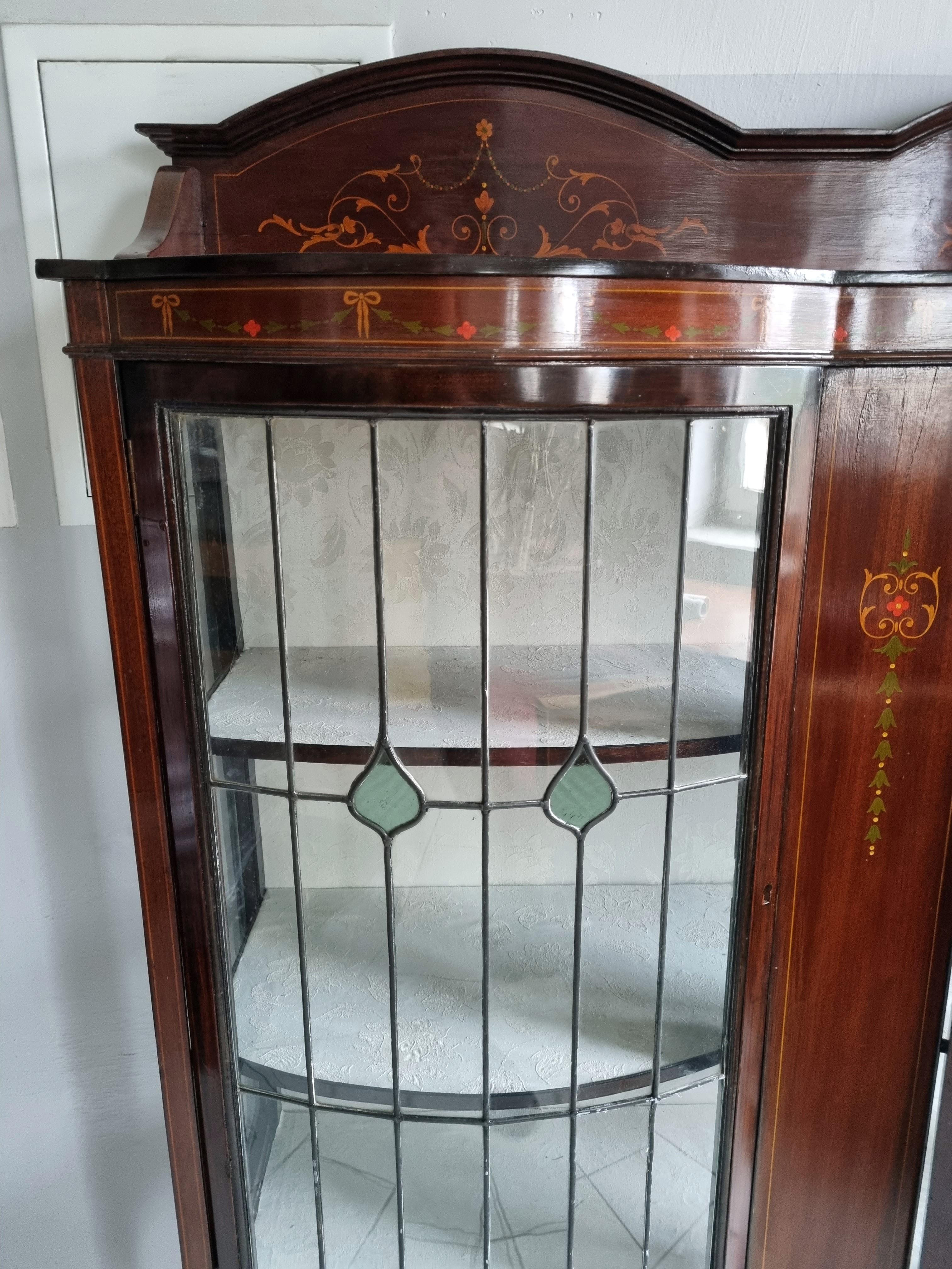 Wiktoriańska witryna - serwantka z przełomu XIX i XX wieku. Mebel fornirowany intarsjowanym mahoniem. Szyby wykonane z witrażu. W środku znajdują się dwie drewniane półki. Na dole dodatkowy blat. Mebel jest nierozkładany.