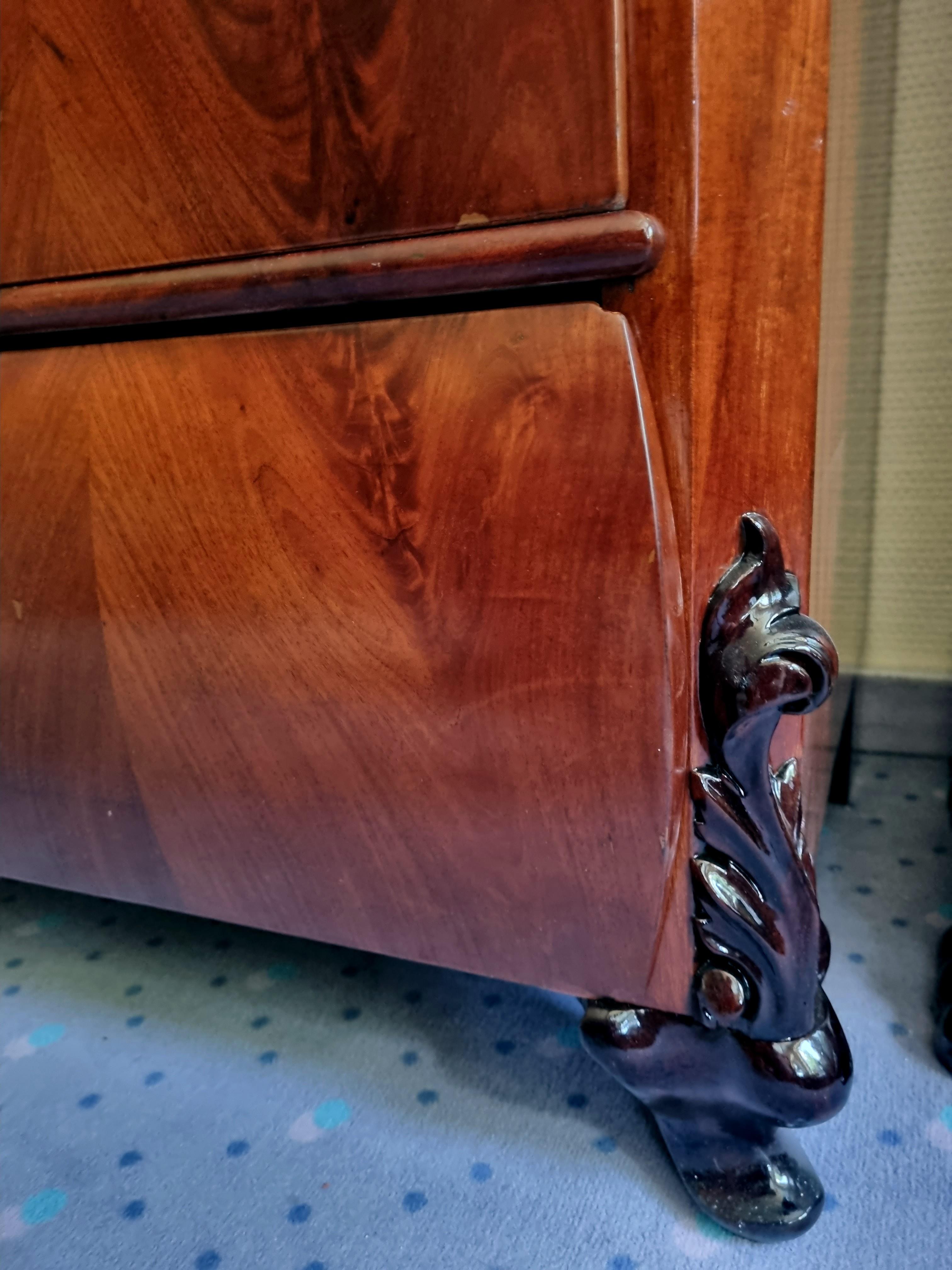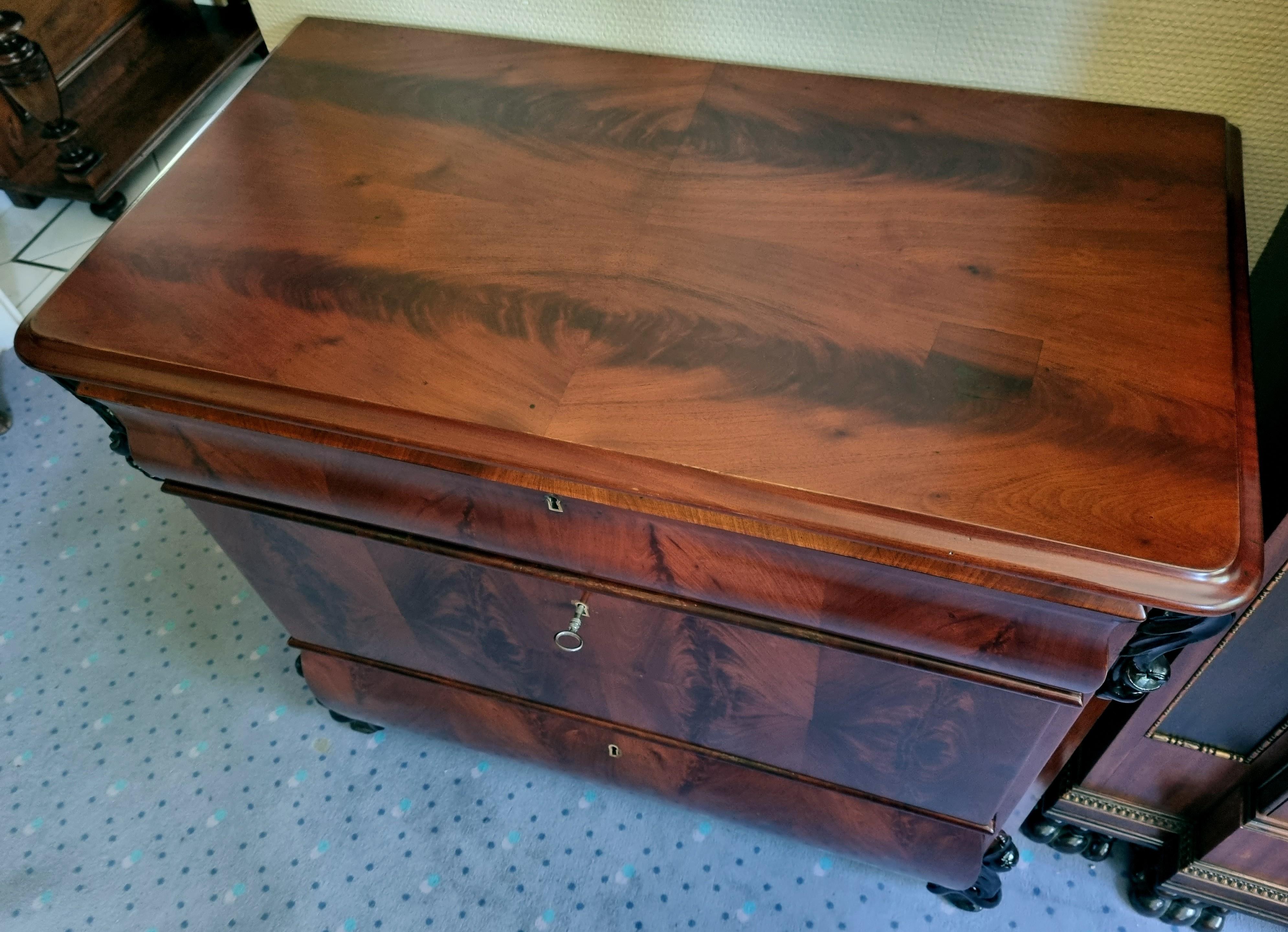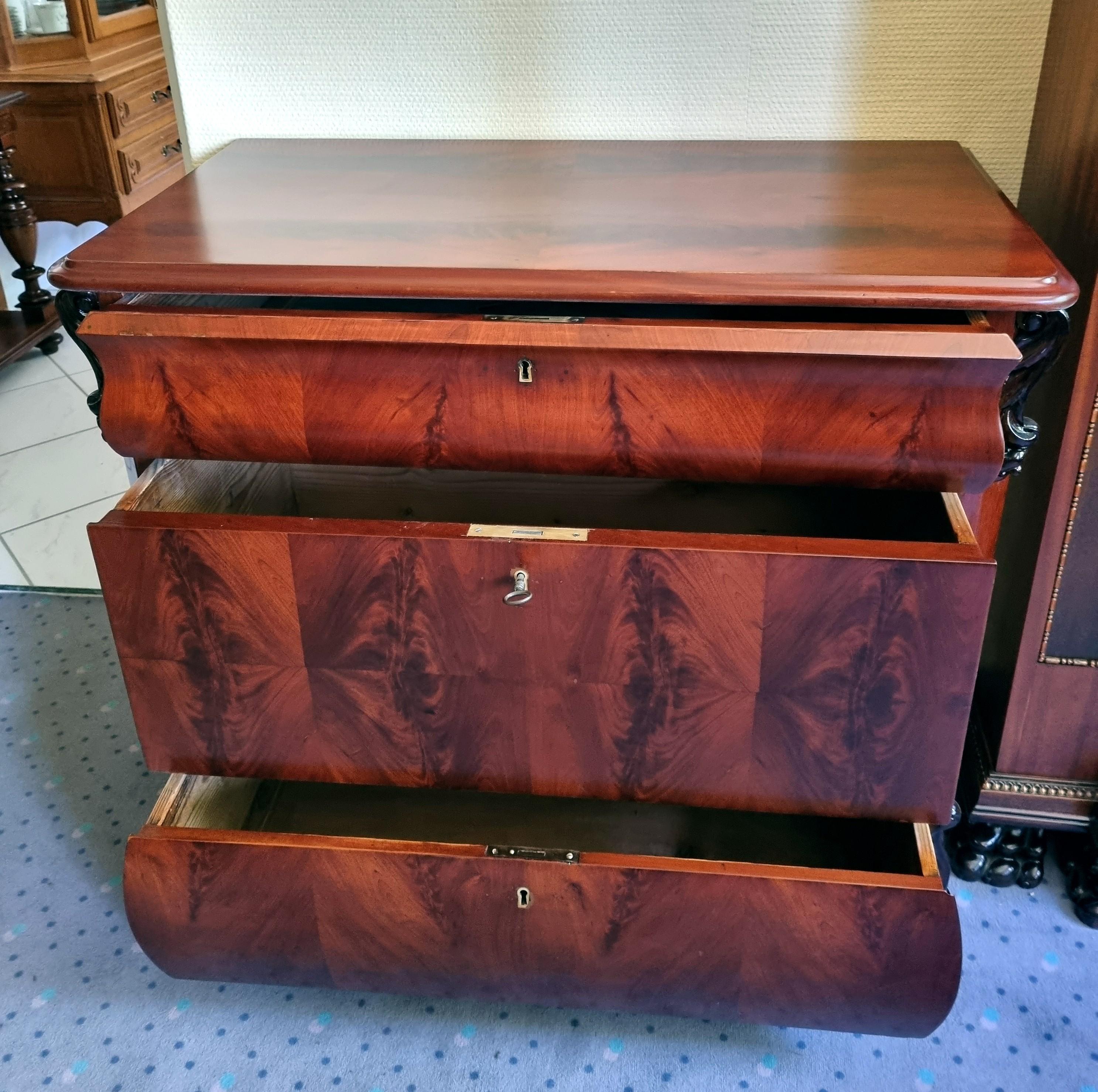 Piękna komoda ludwikowska z drugiej połowy XIX wieku. Mebel fornirowany jest mahoniem piramidą. Wewnątrz znajdują się trzy wysuwane szuflady.