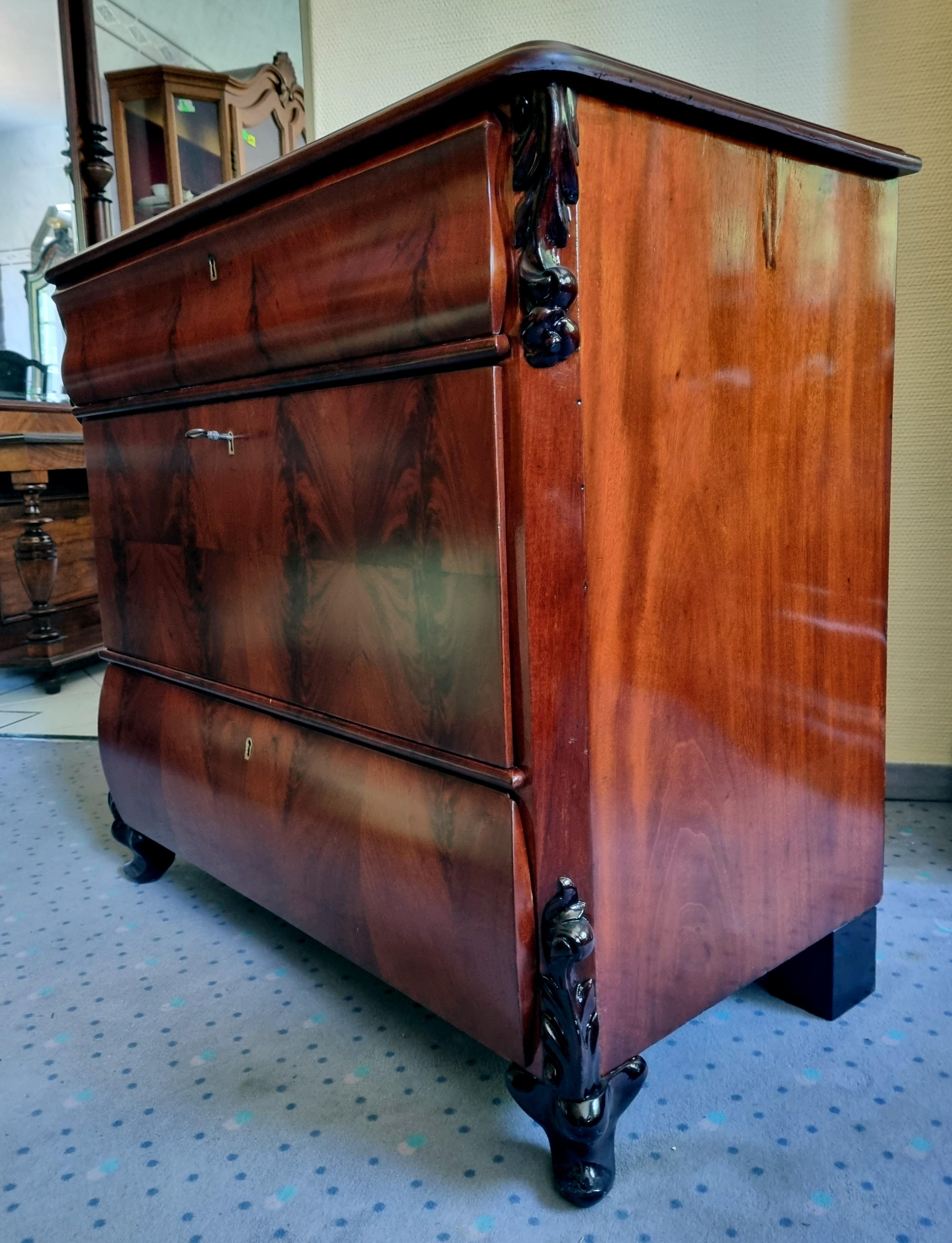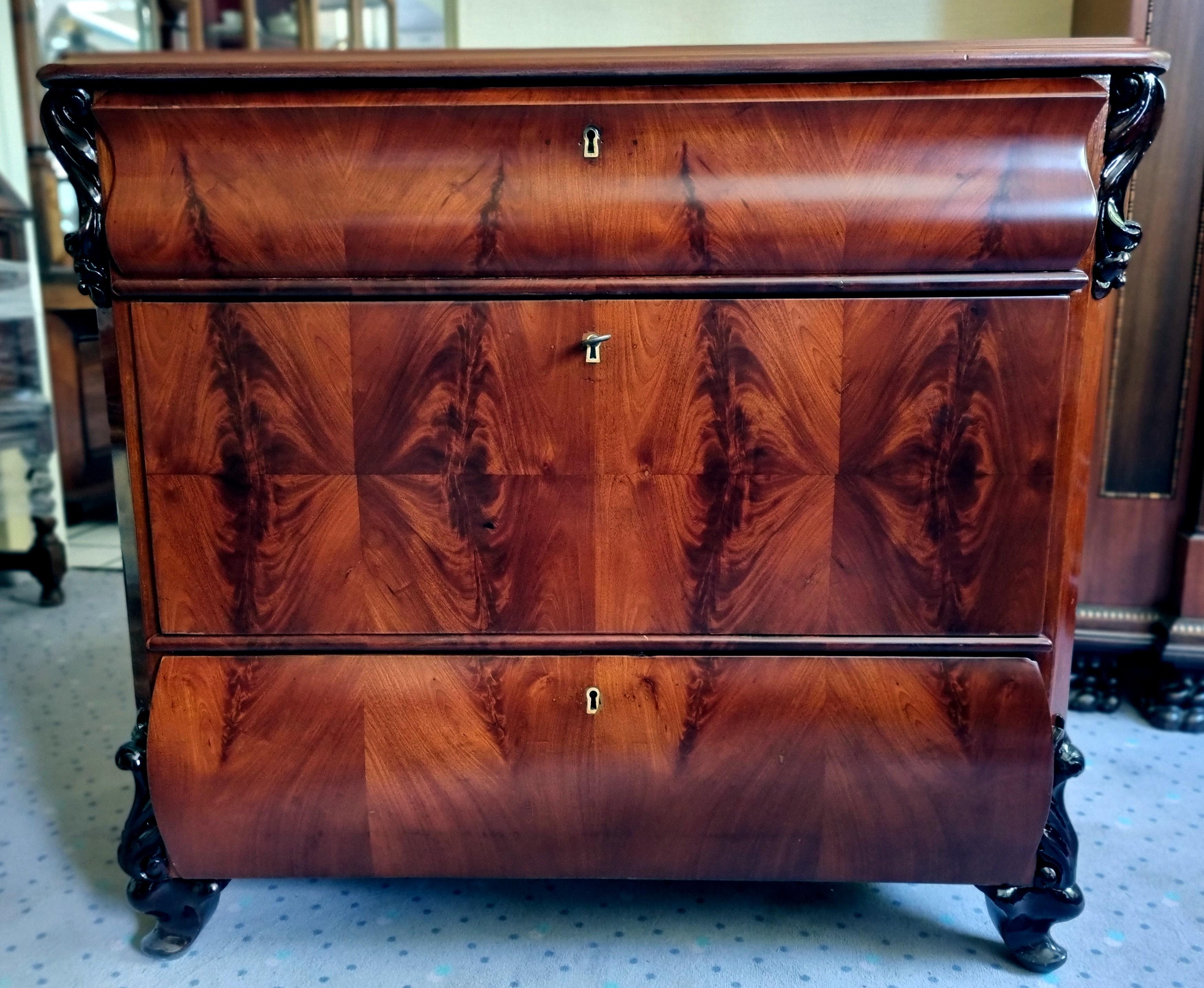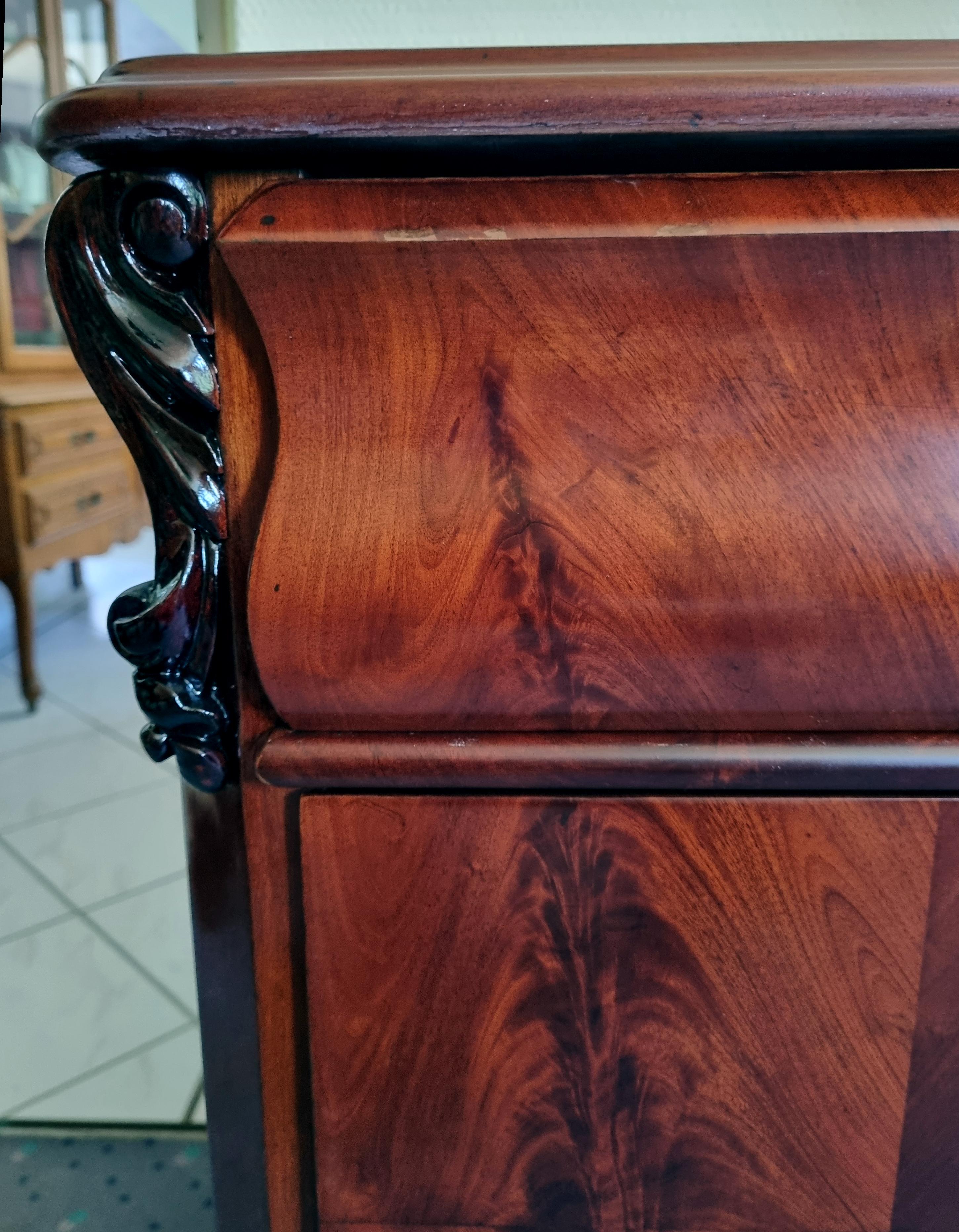 Piękna komoda ludwikowska z drugiej połowy XIX wieku. Mebel fornirowany jest mahoniem piramidą. Wewnątrz znajdują się trzy wysuwane szuflady.