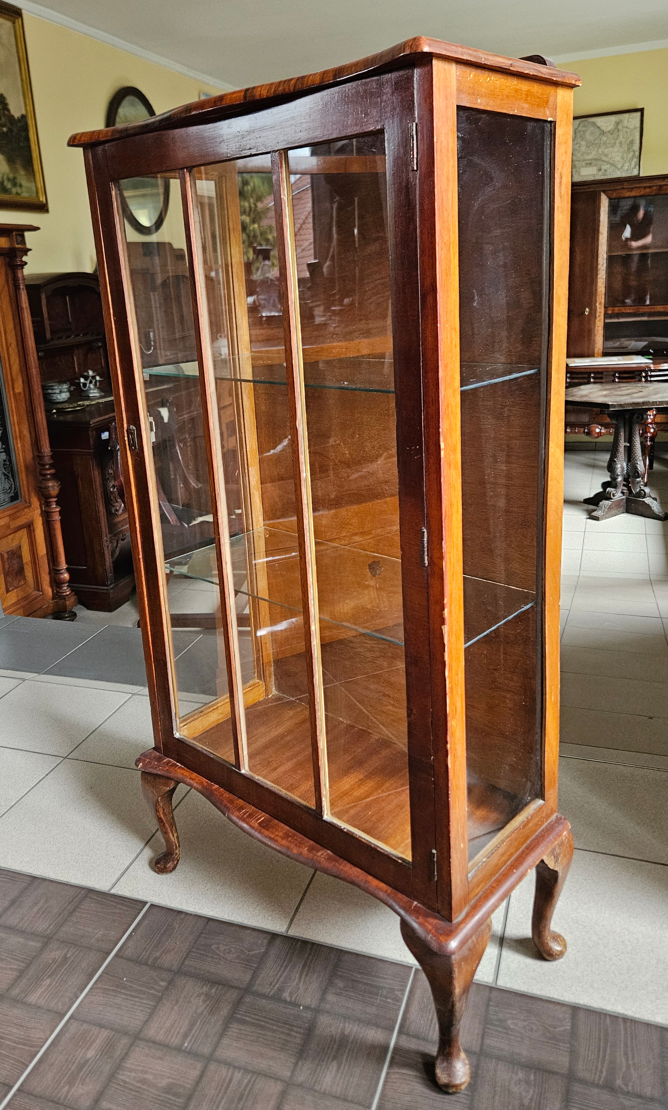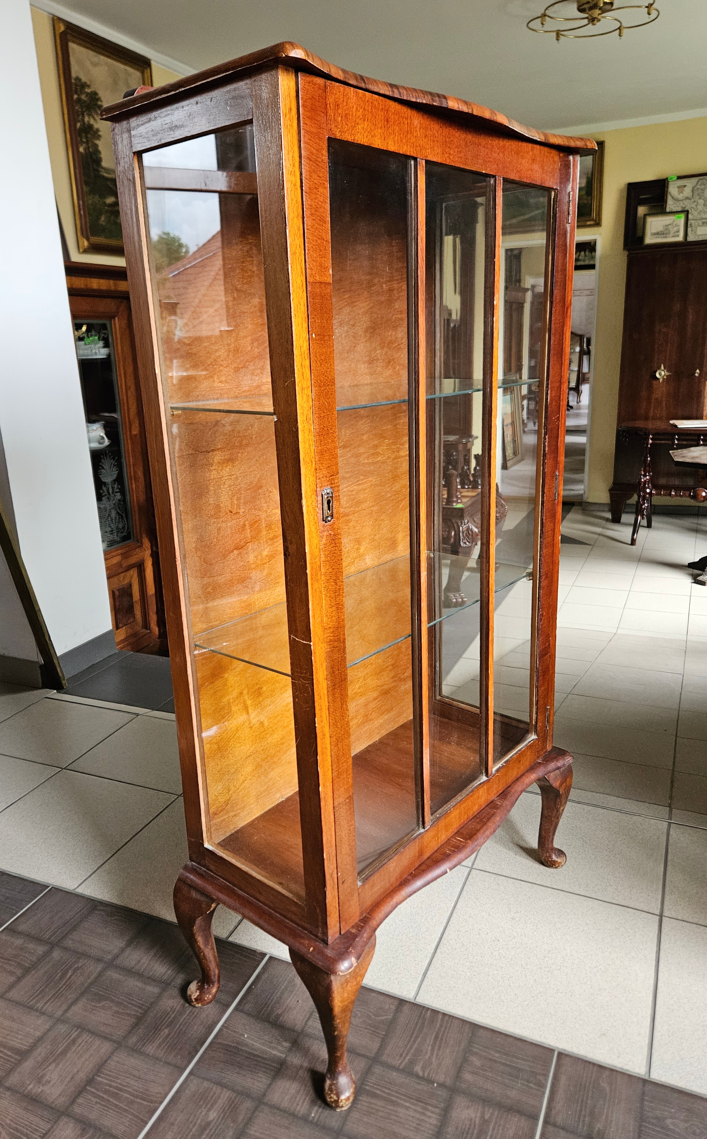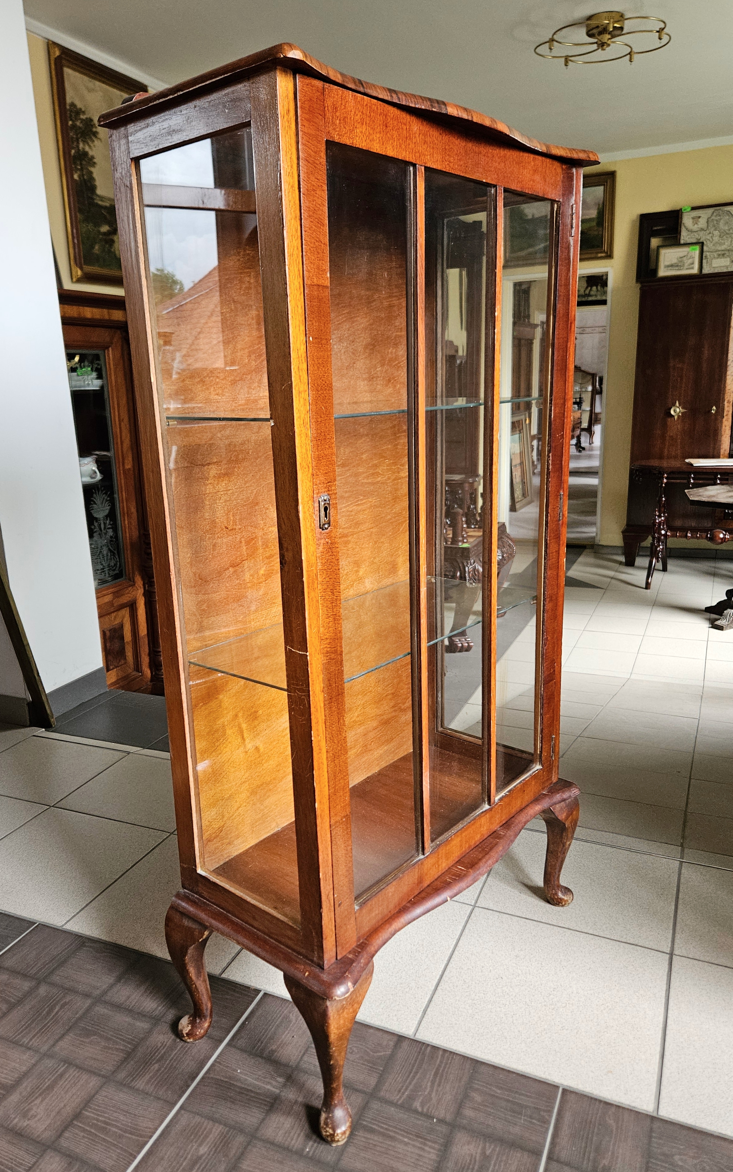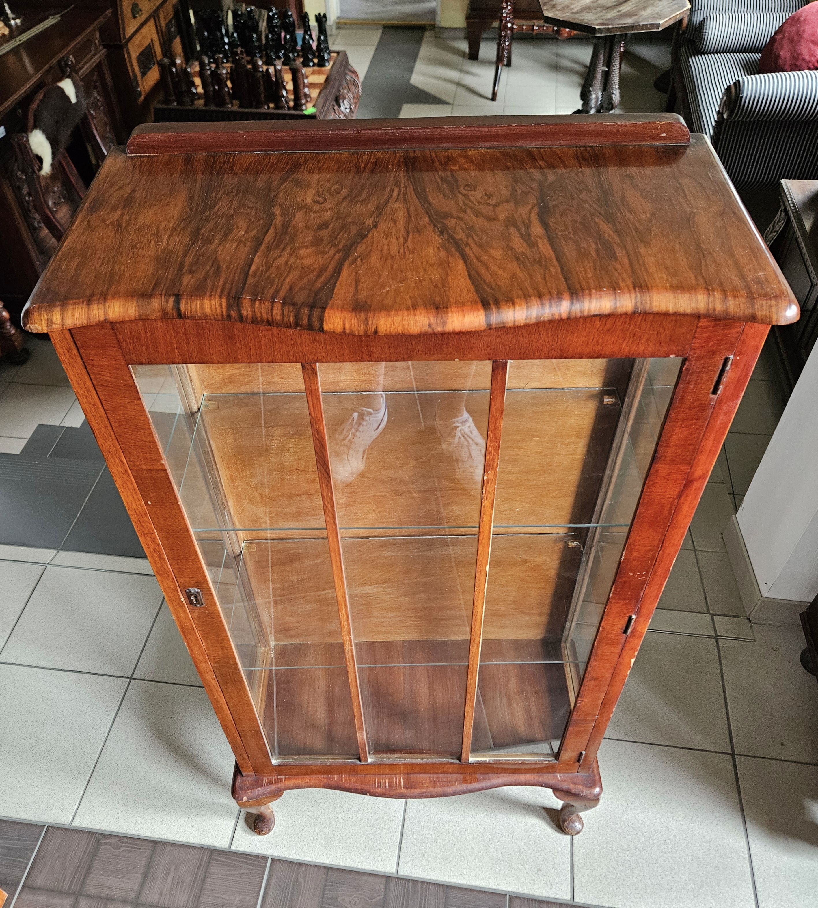 Angielska witrynka w stylu chippendale. Mebel fornirowany orzechem. Boki przeszklone. Wewnątrz znajdują się dwie szklane półki.