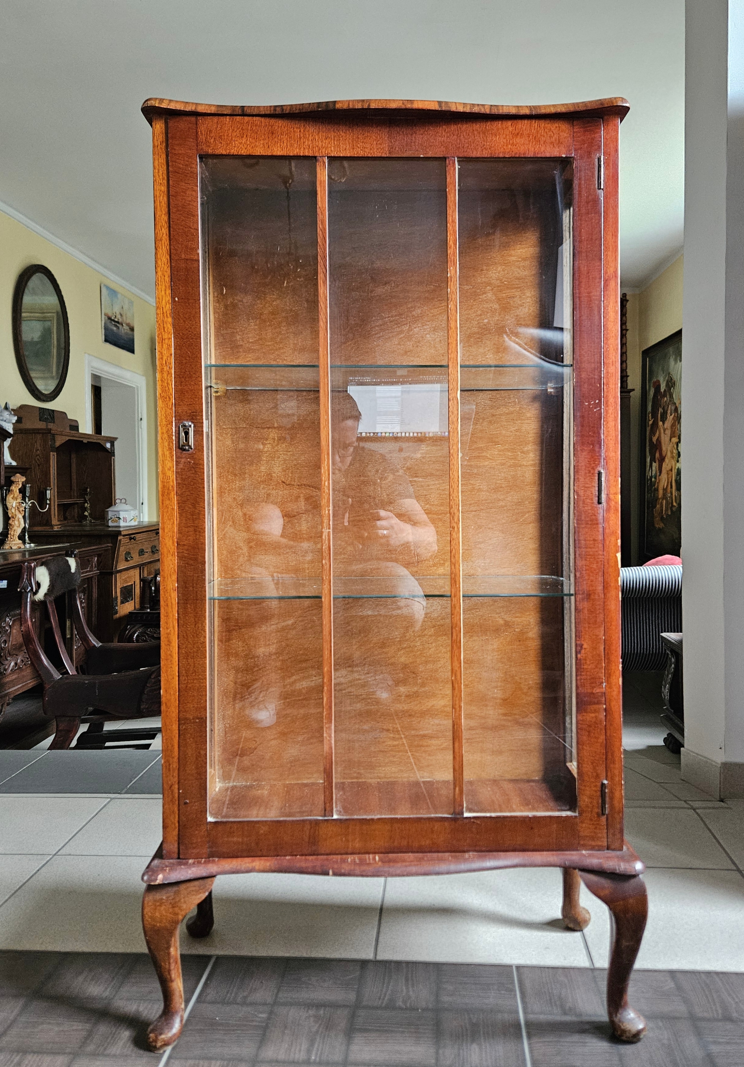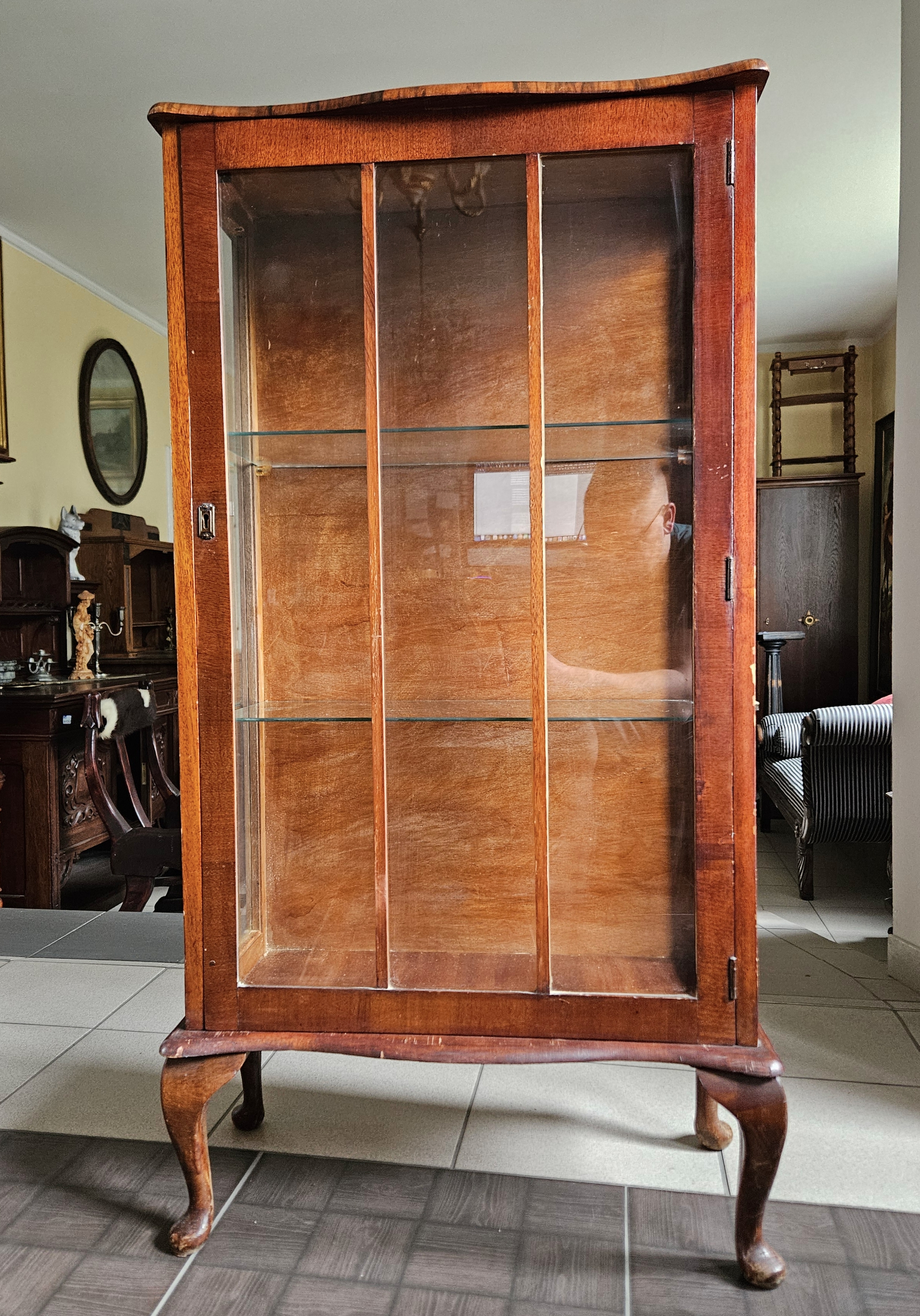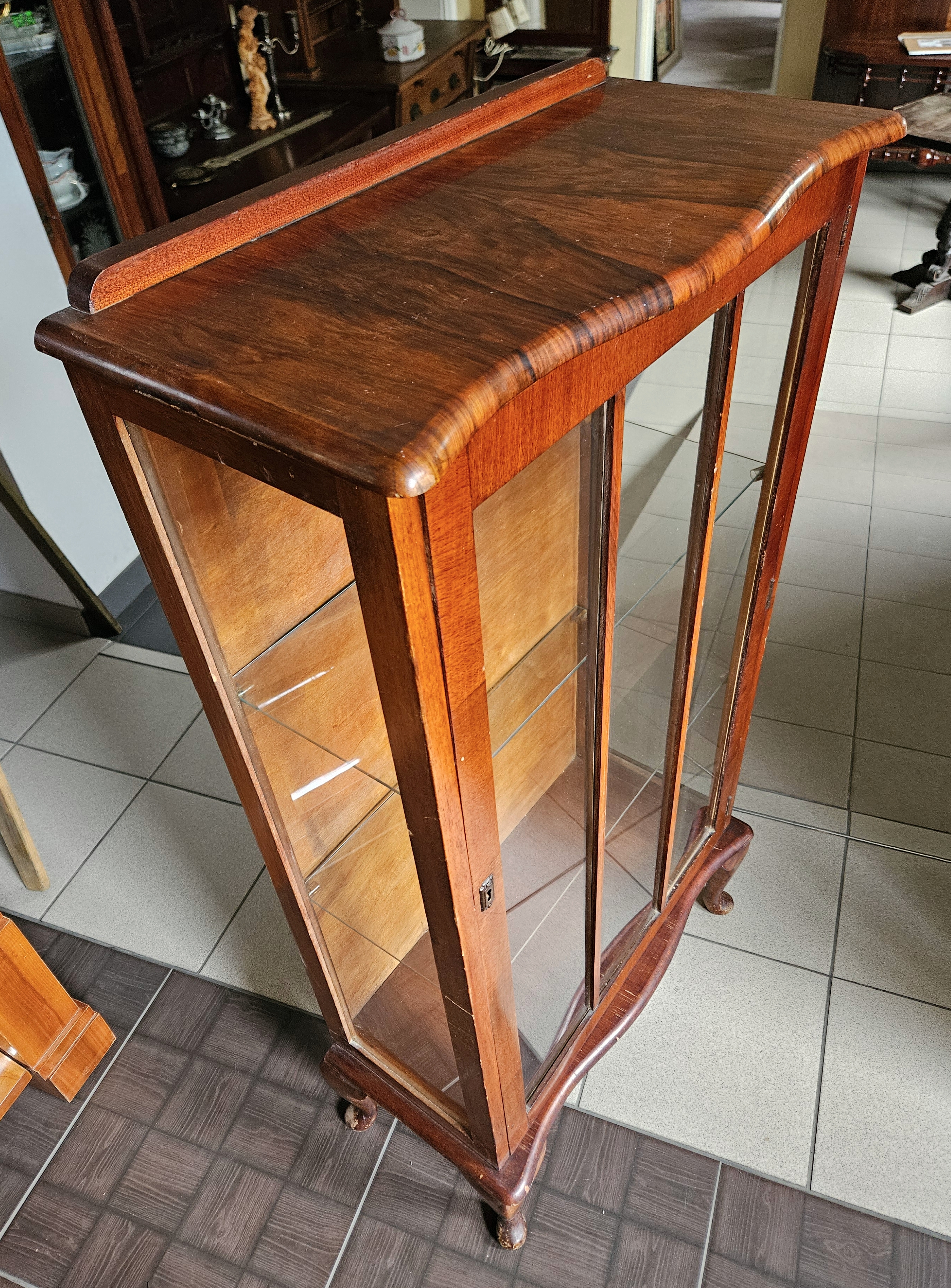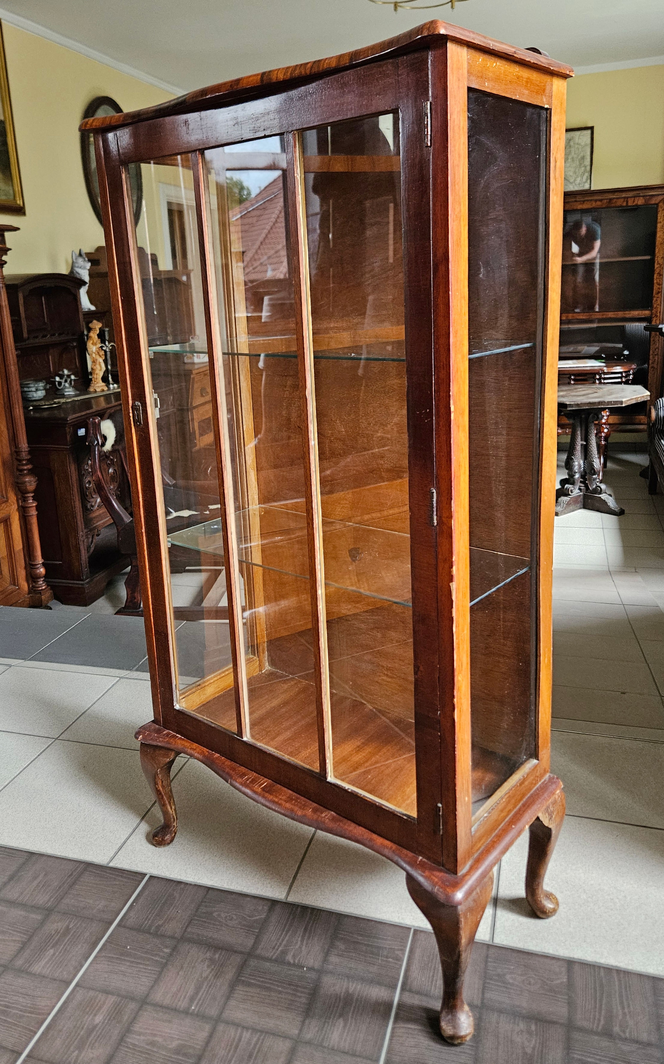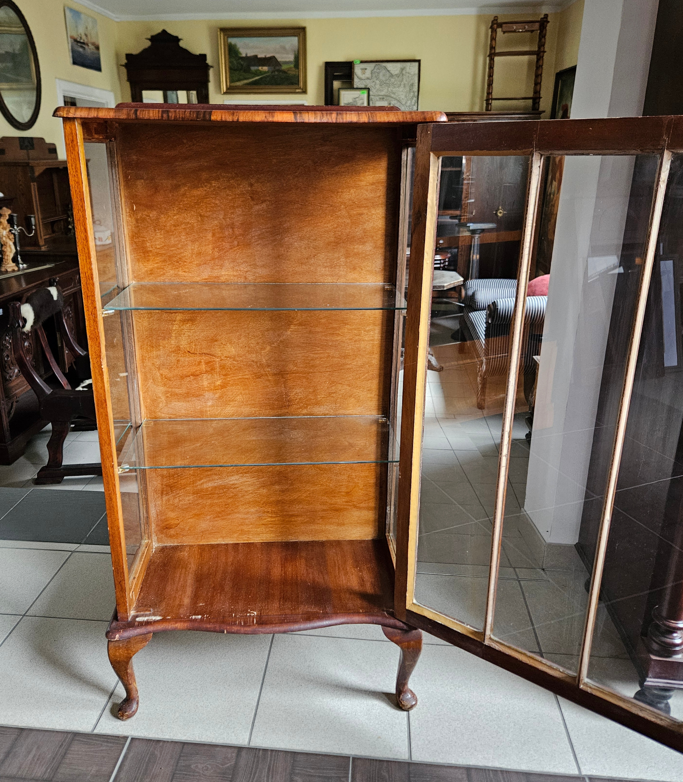 Angielska witrynka w stylu chippendale. Mebel fornirowany orzechem. Boki przeszklone. Wewnątrz znajdują się dwie szklane półki.