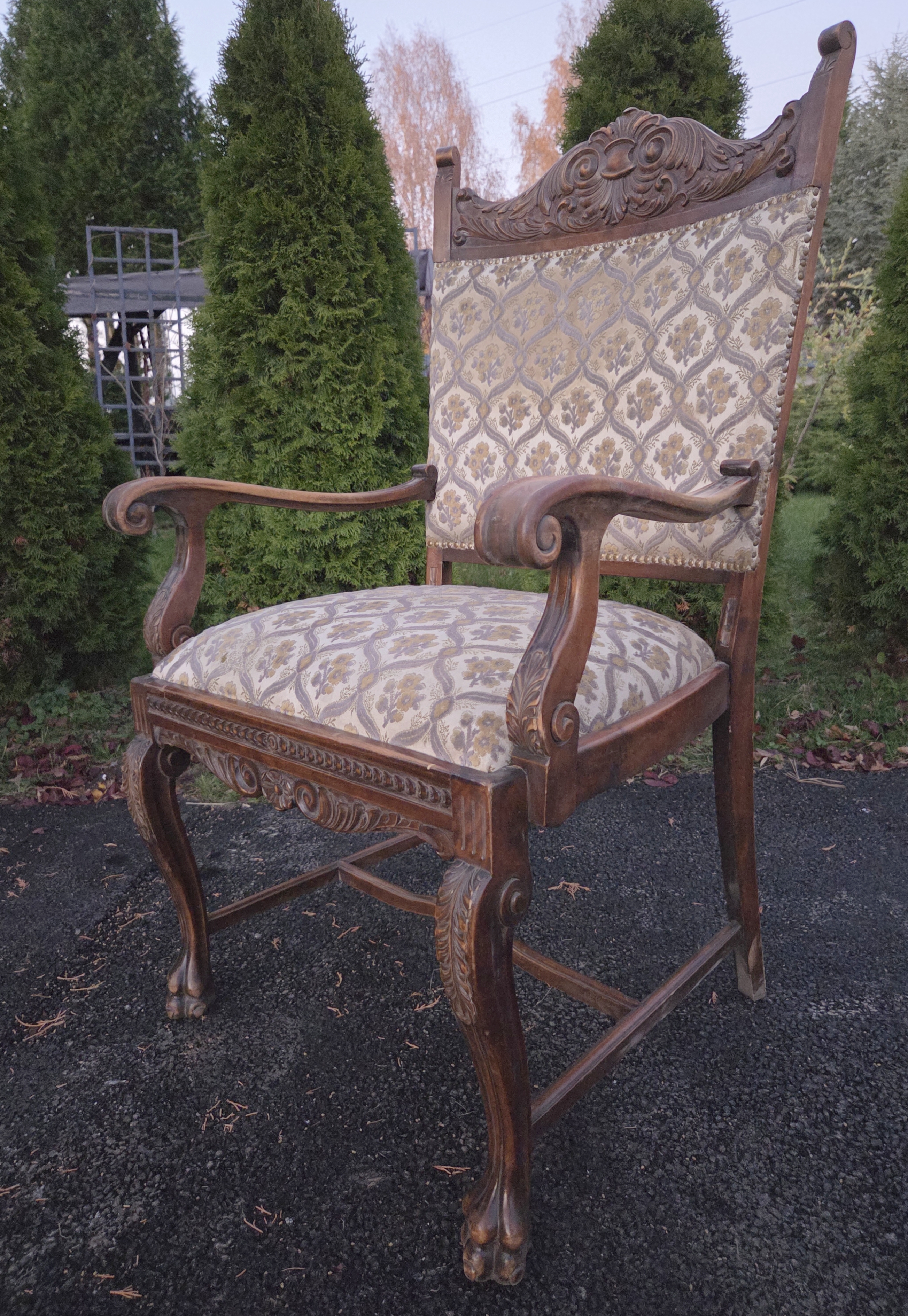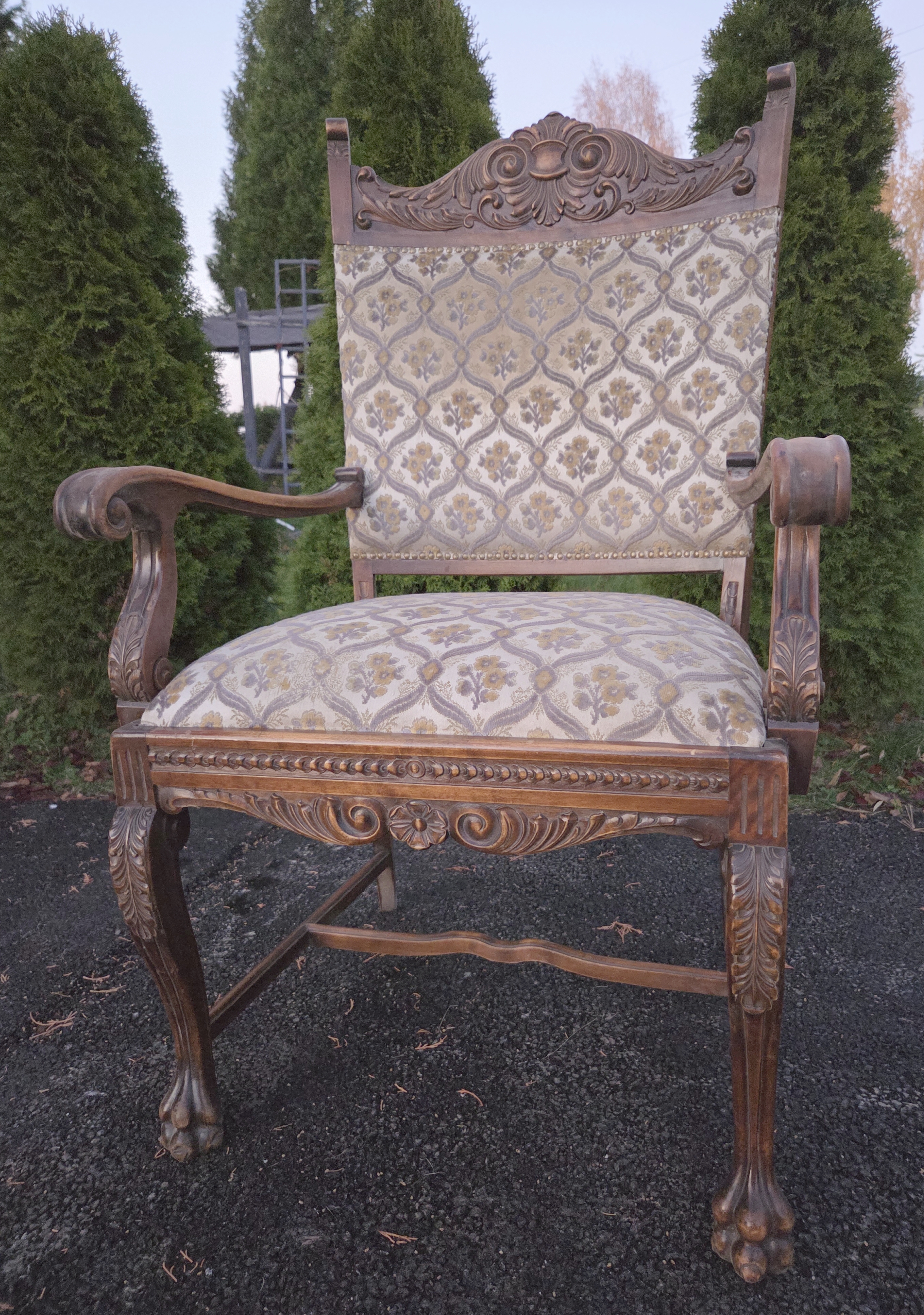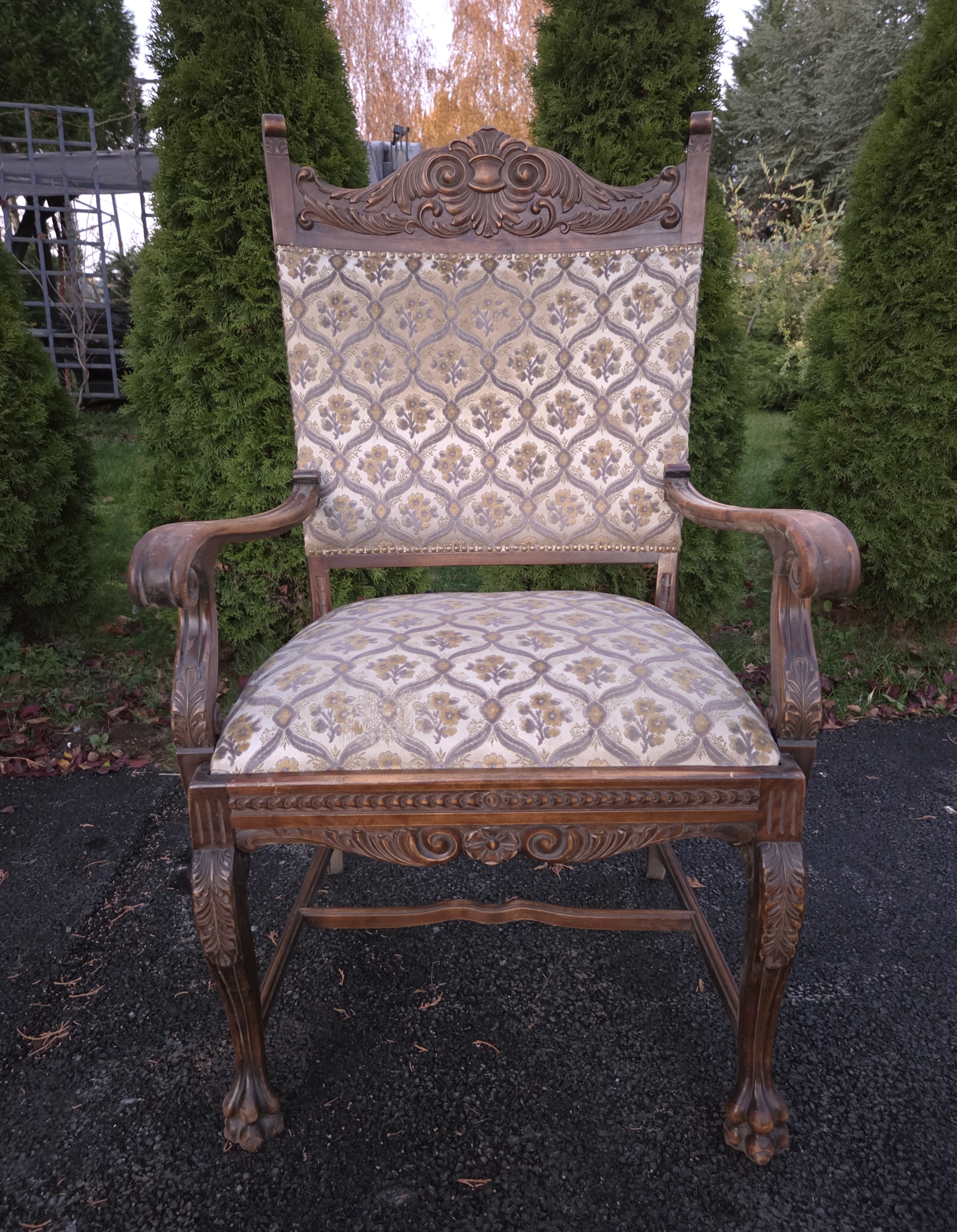 (nr 9263)Orzechowy fotel gabinetowy na szponiastych łapach. Bogate zdobienia snycerskie. Oparcie obite dwustronnie.