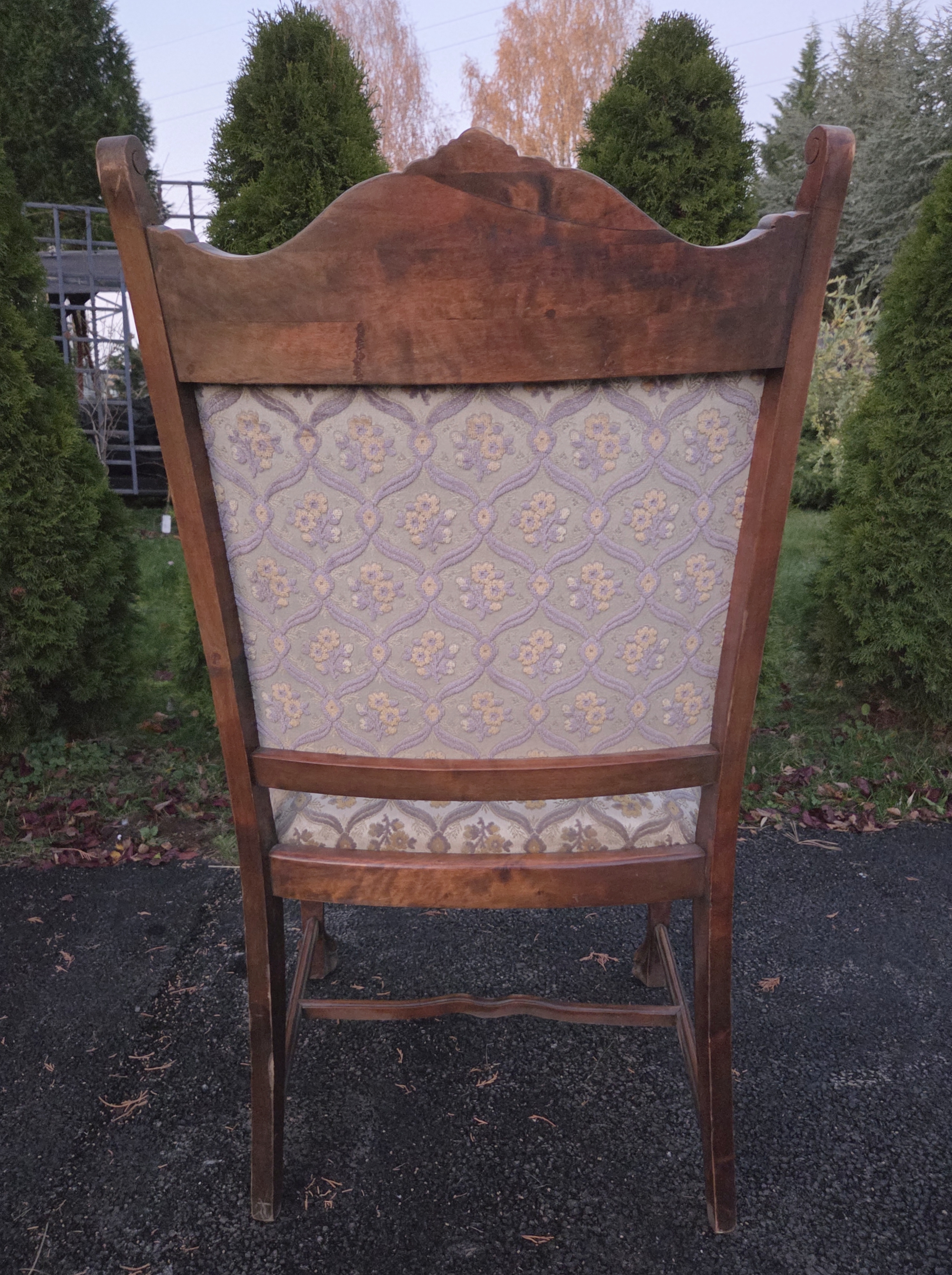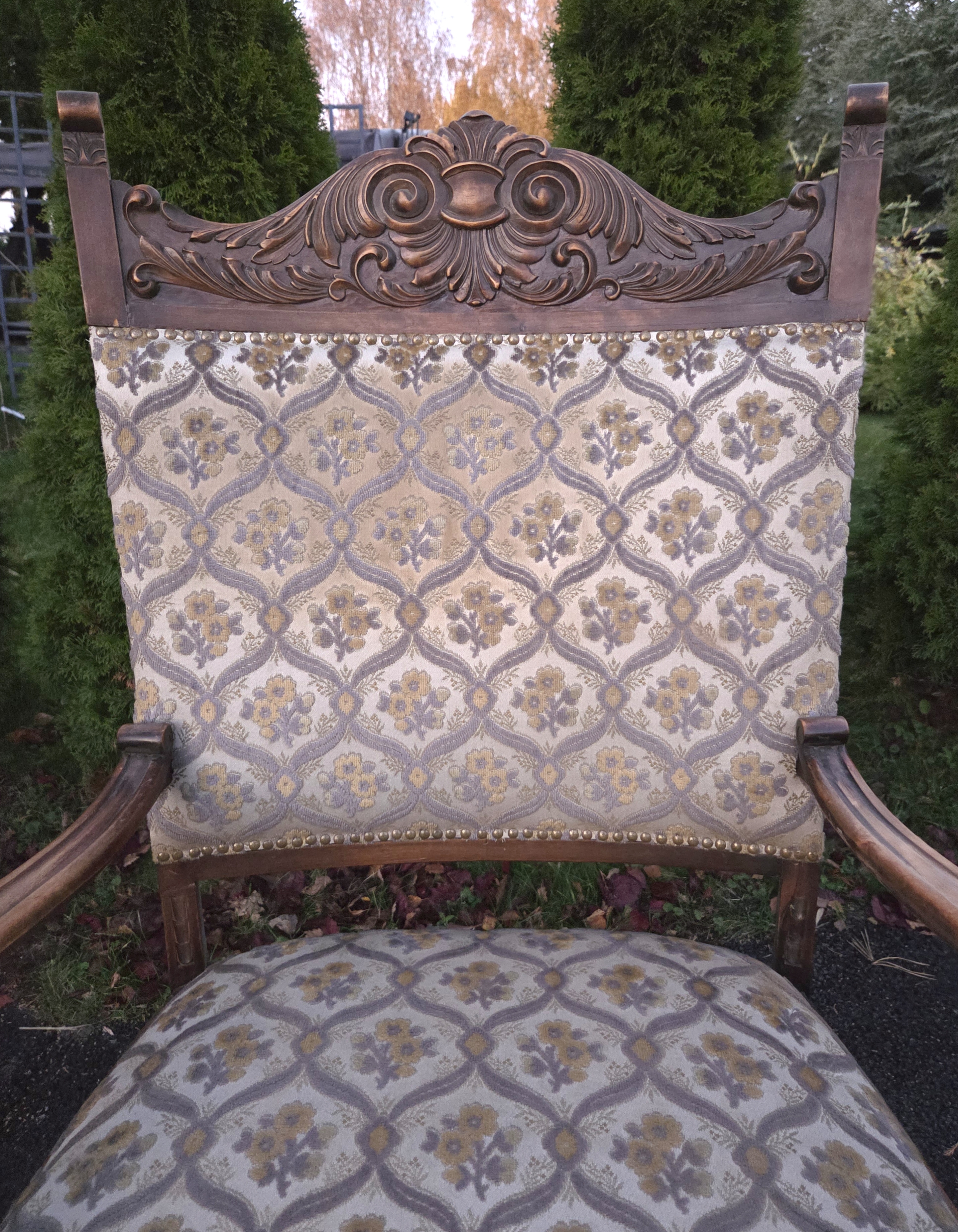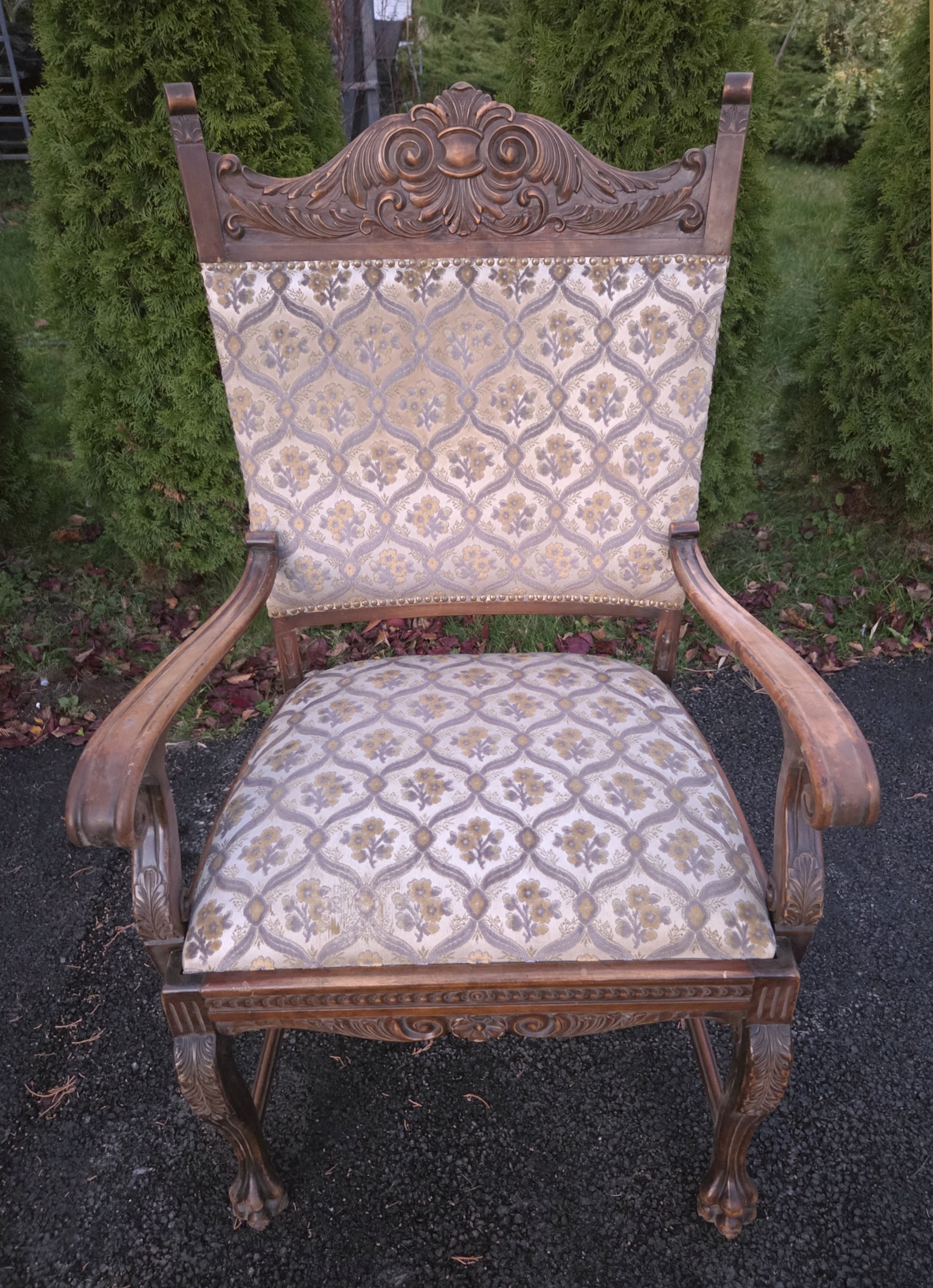 (nr 9263)Orzechowy fotel gabinetowy na szponiastych łapach. Bogate zdobienia snycerskie. Oparcie obite dwustronnie.