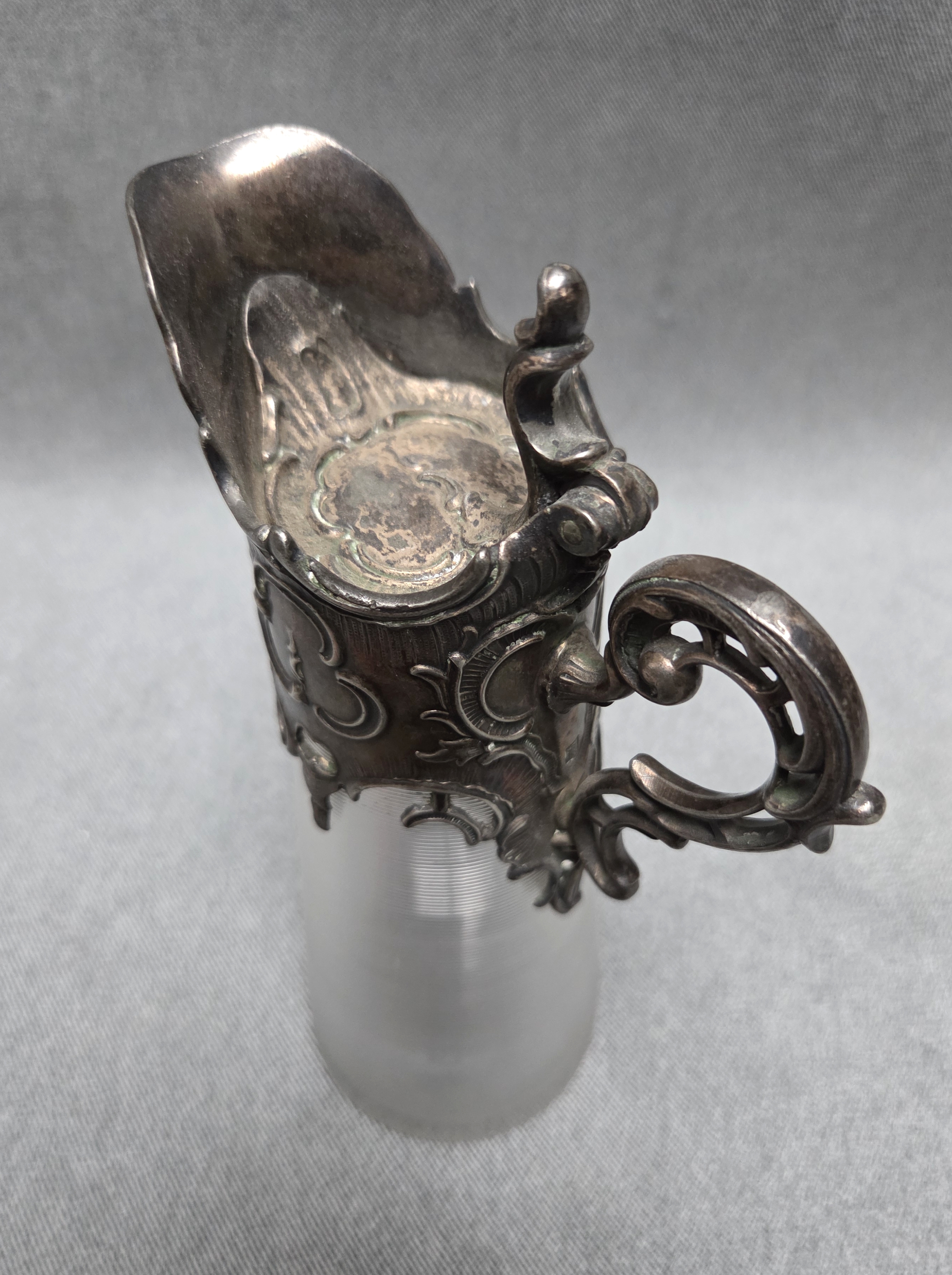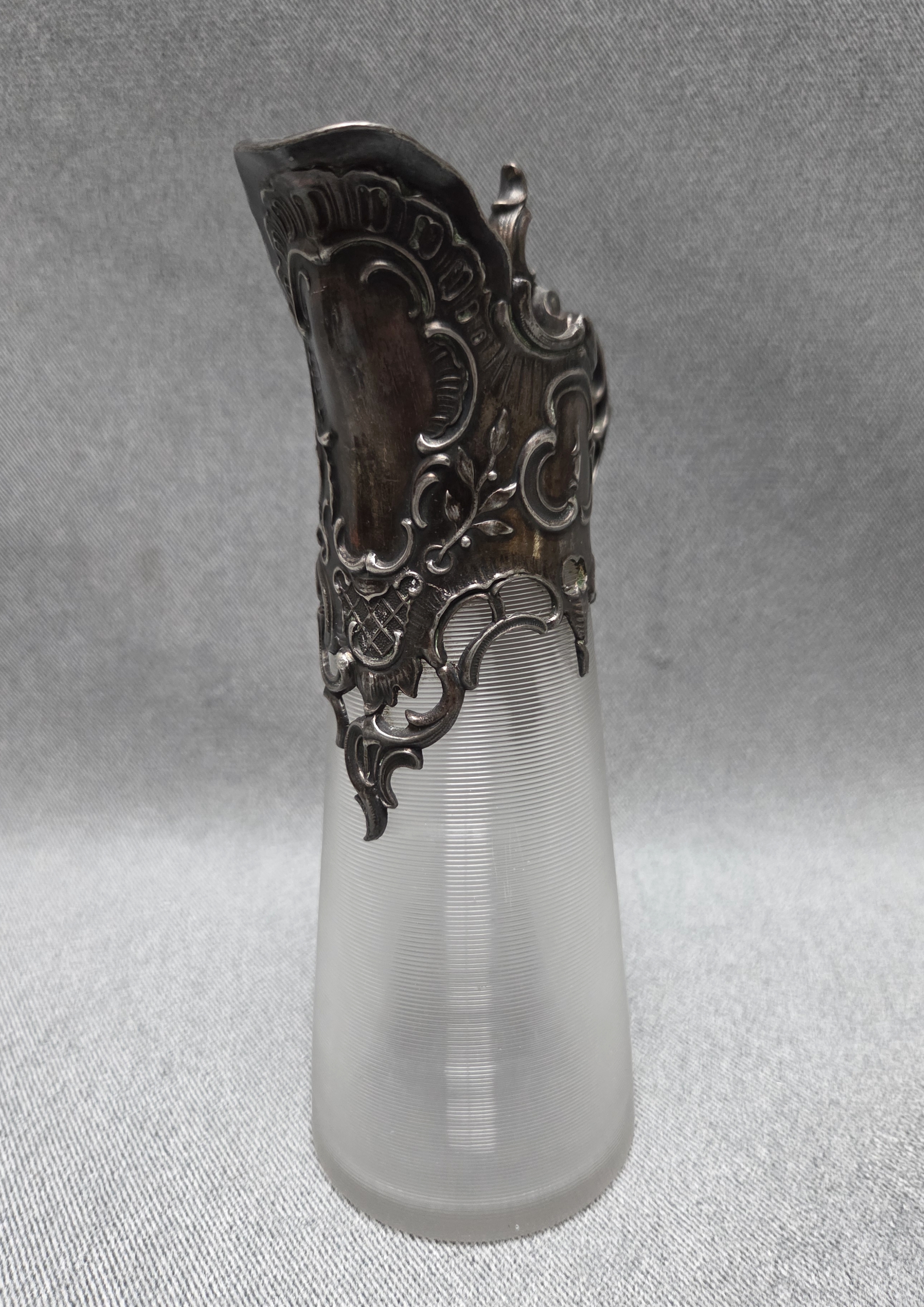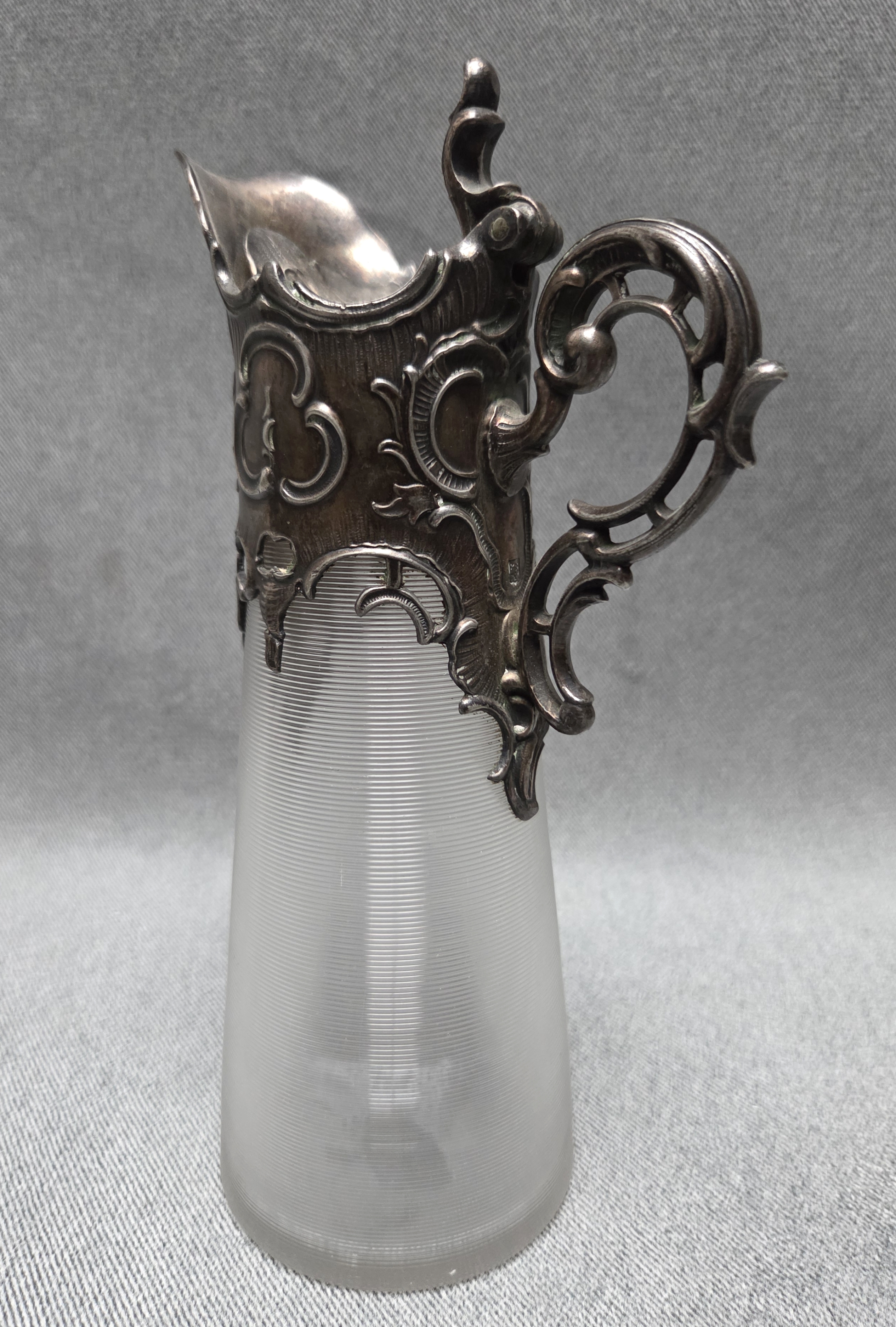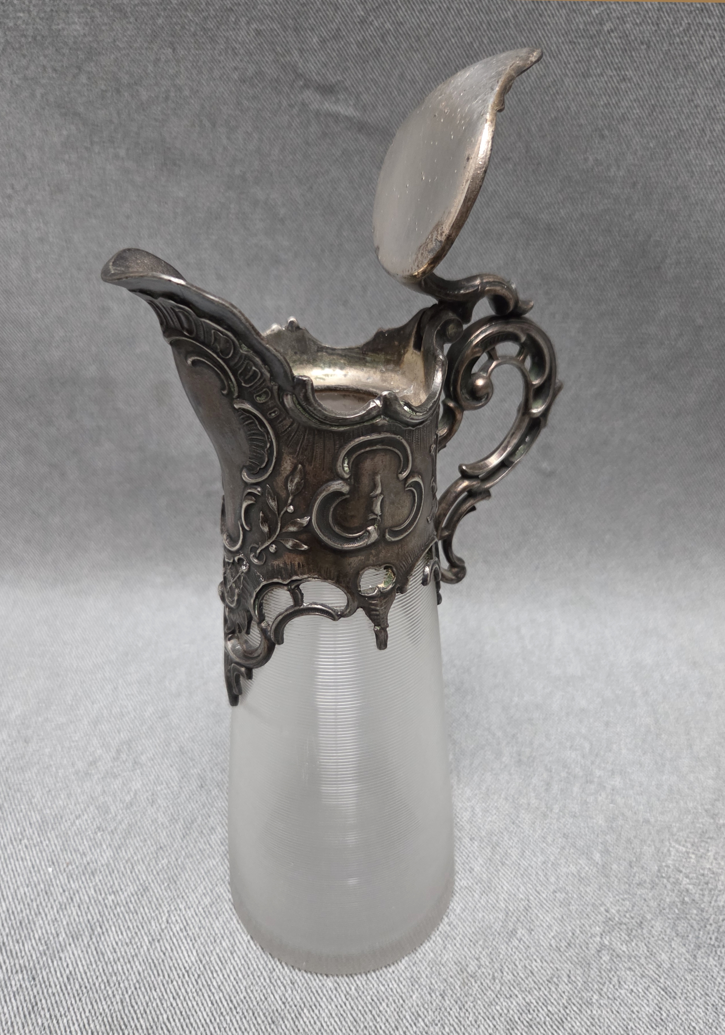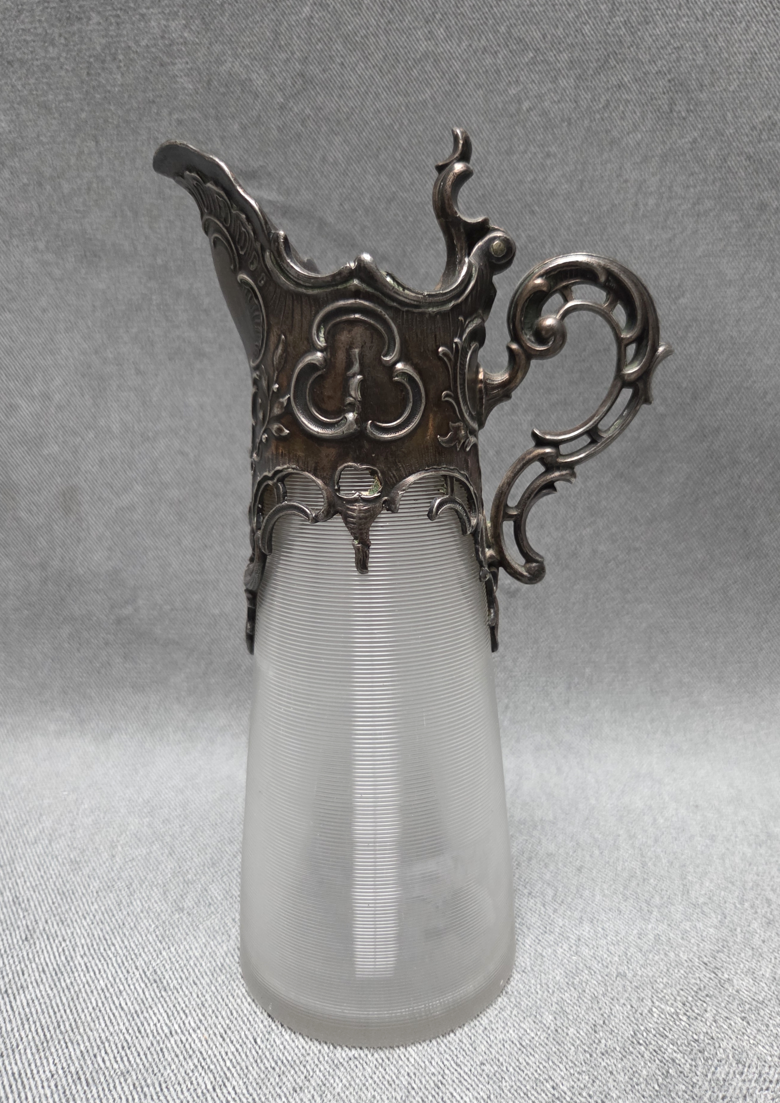 Dzbanek secesyjny z końca XIX wieku. Wykonany z karbowanego, okutego szkła.