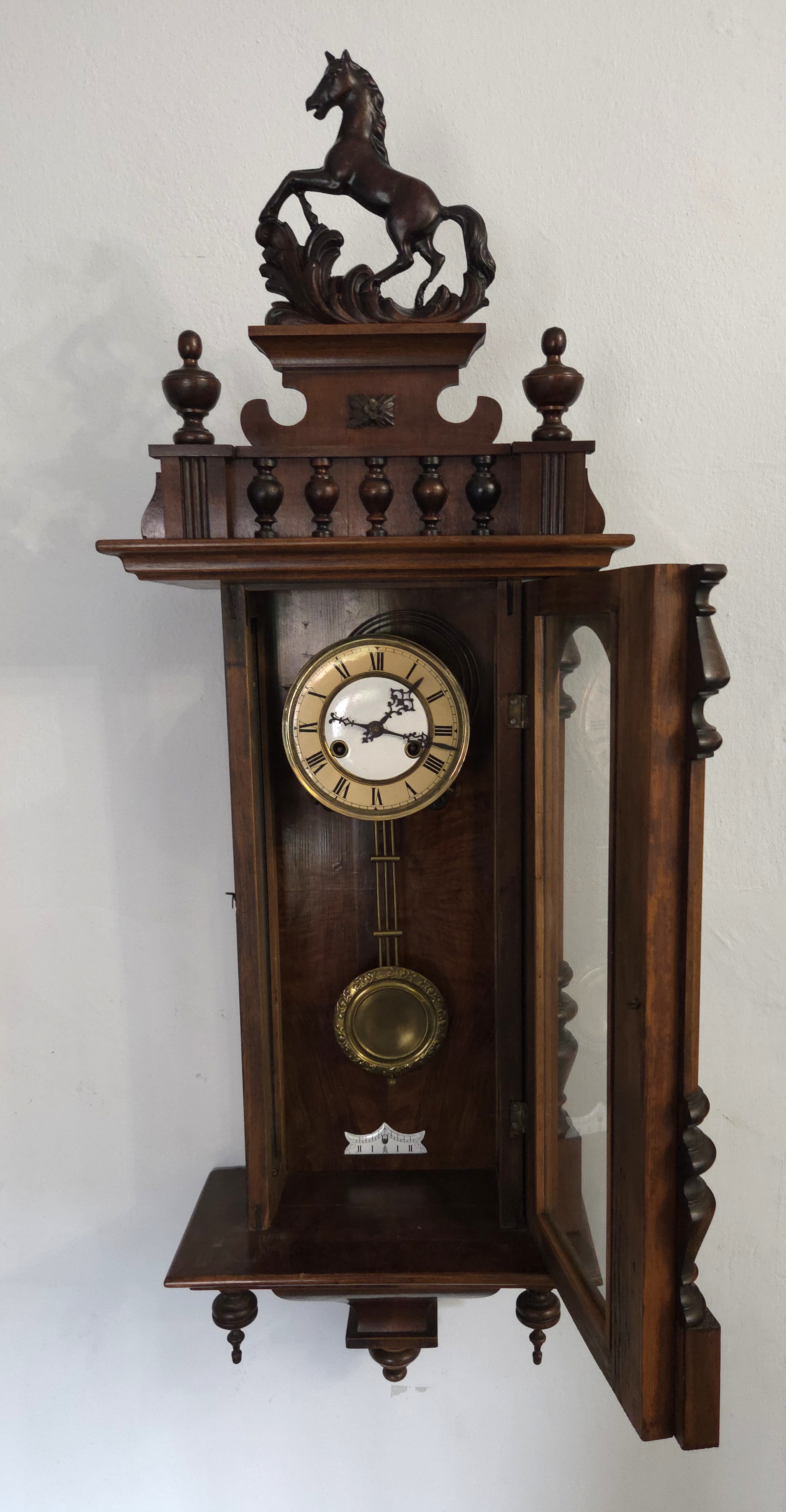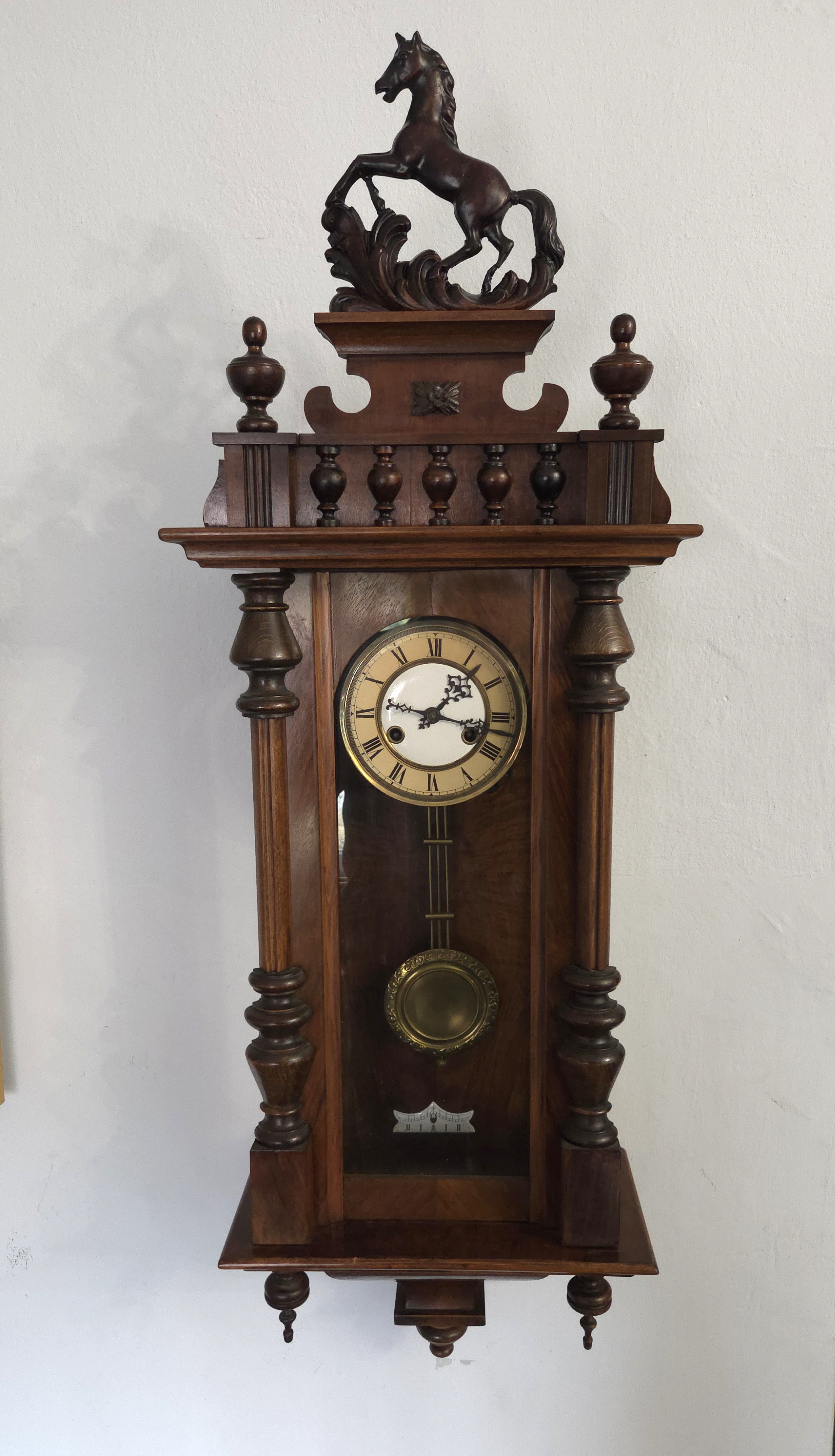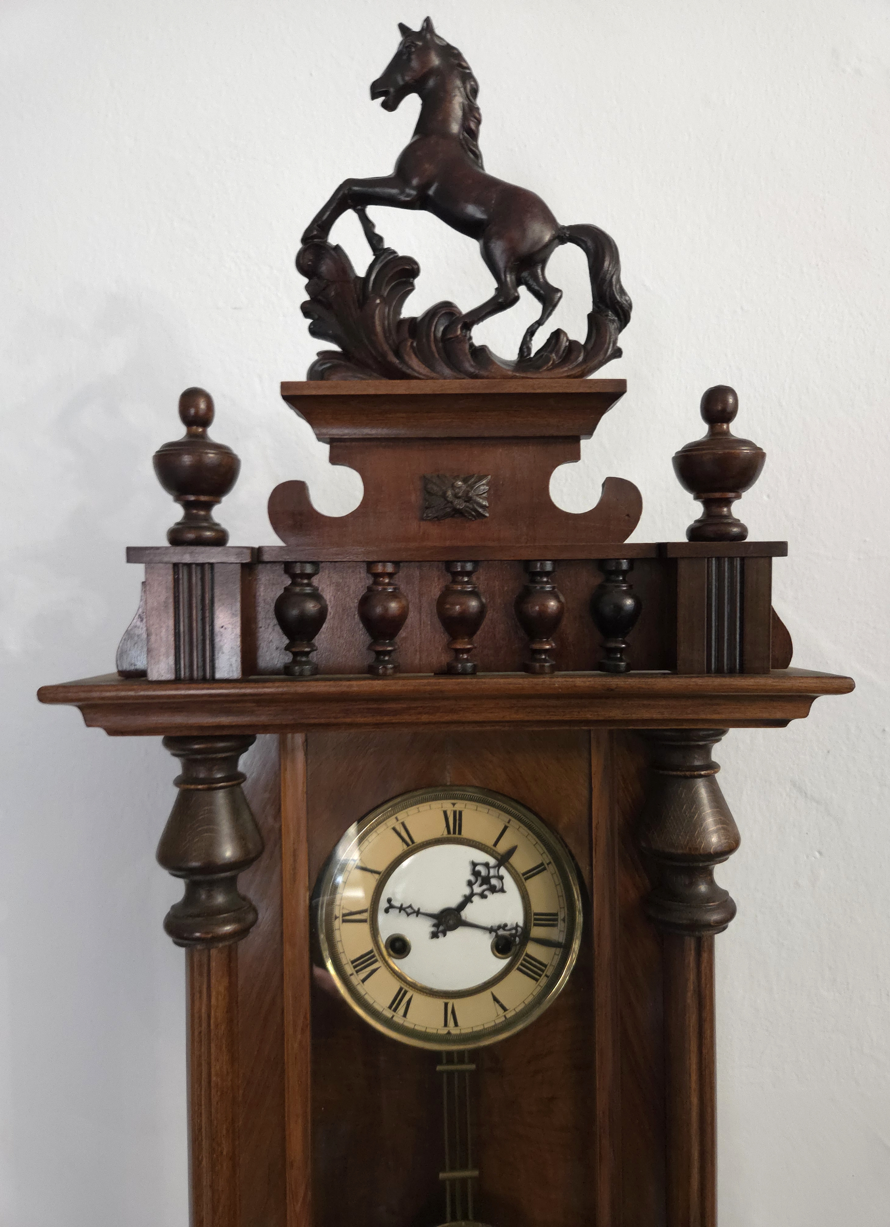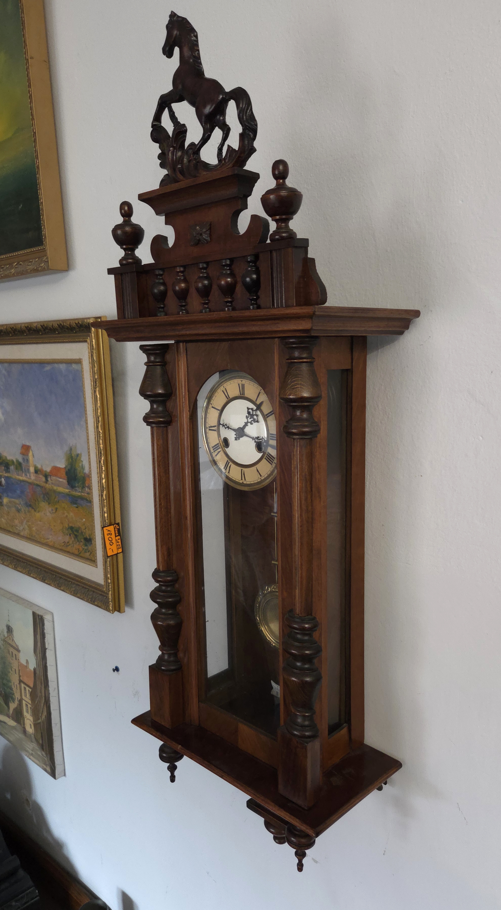 (nr 9306)Orzechowy zegar wiszący z końca XIX wieku. Figura konia zdobi zwieńczenie tego eklektycznego zegara. Wyważone oryginalne zdobienia, charakterystyczne dla epoki, wyjątkiem jest figura konia zamiast standardowo stosowanej zazwyczaj muszli.