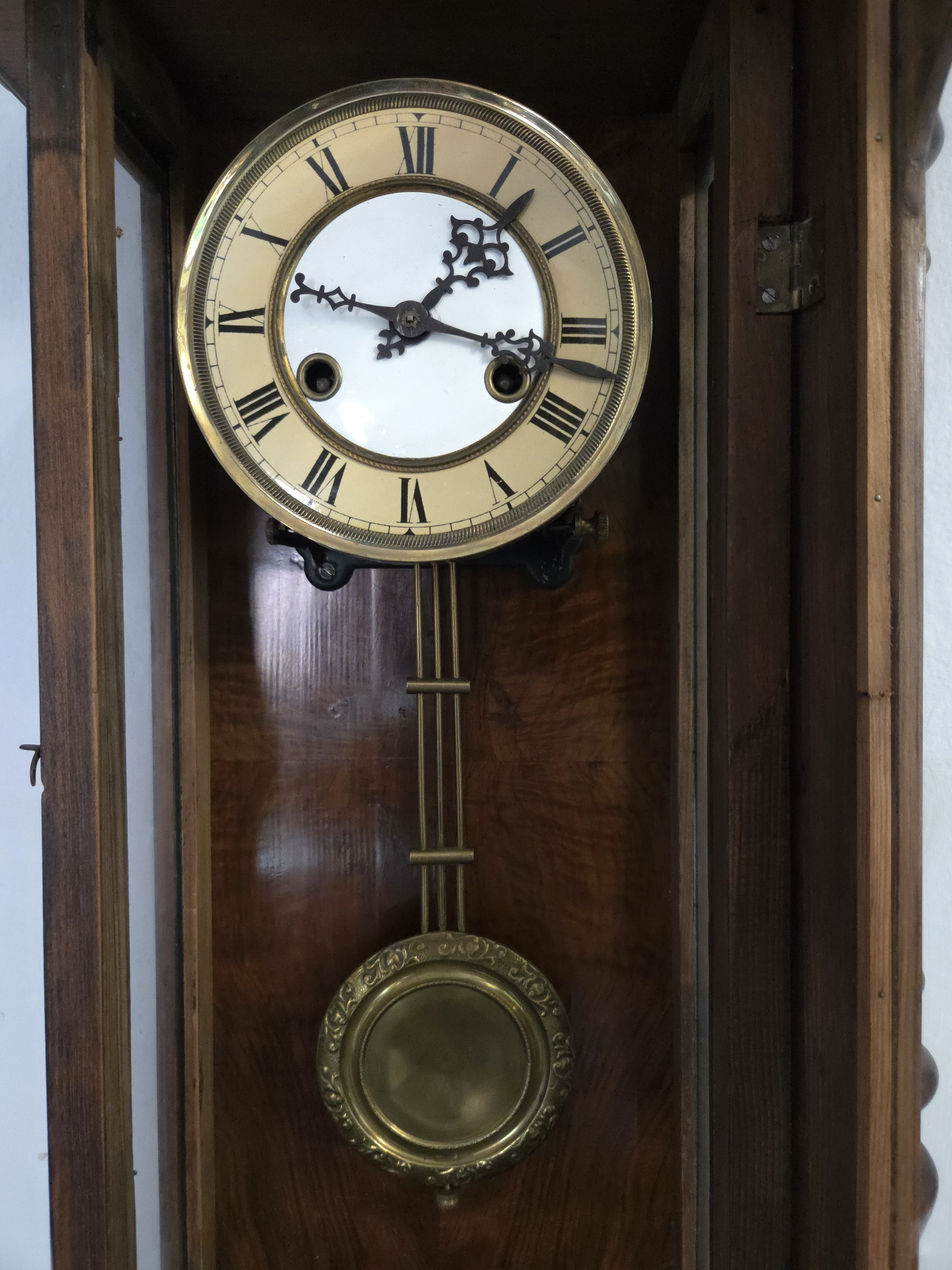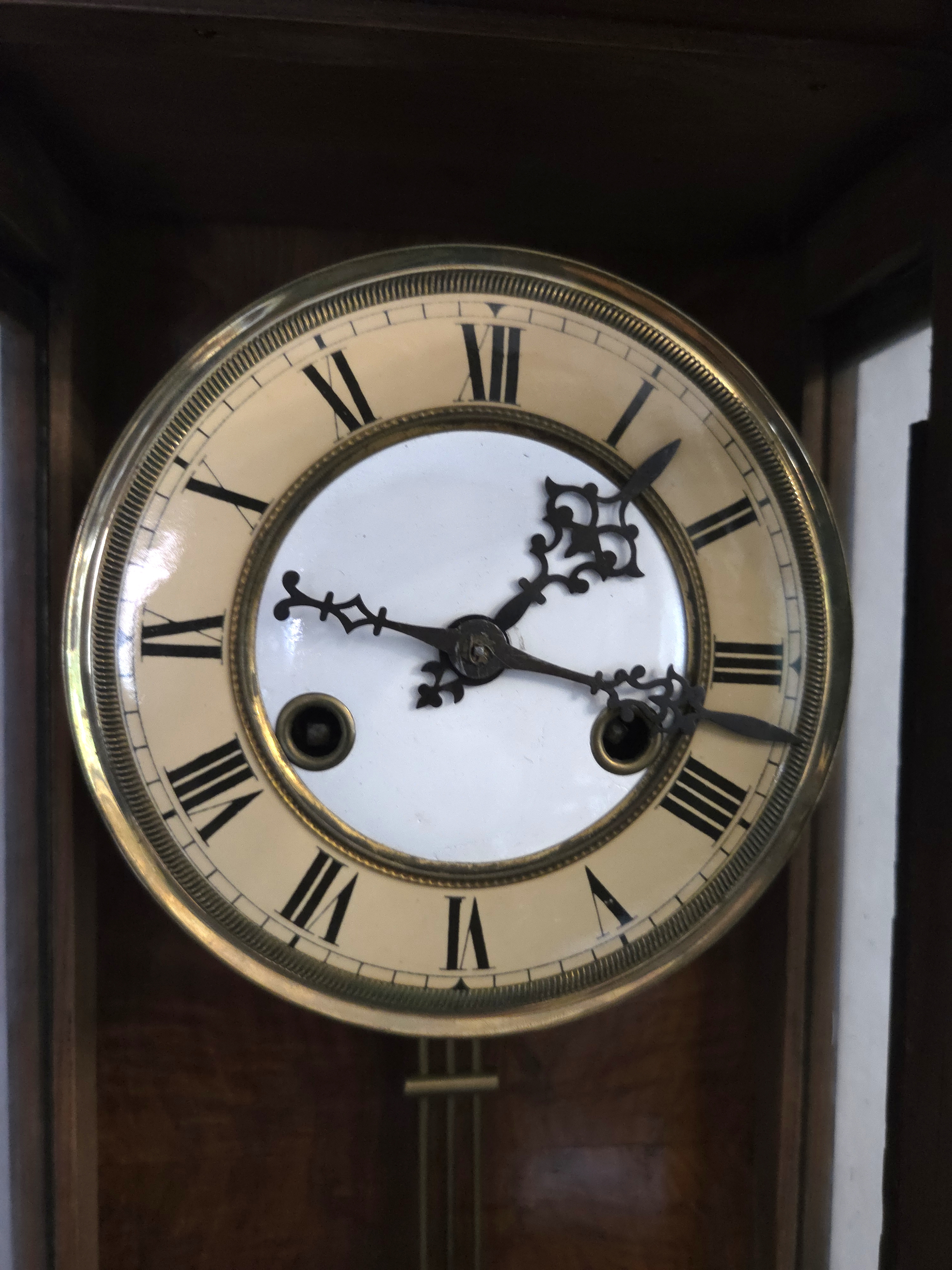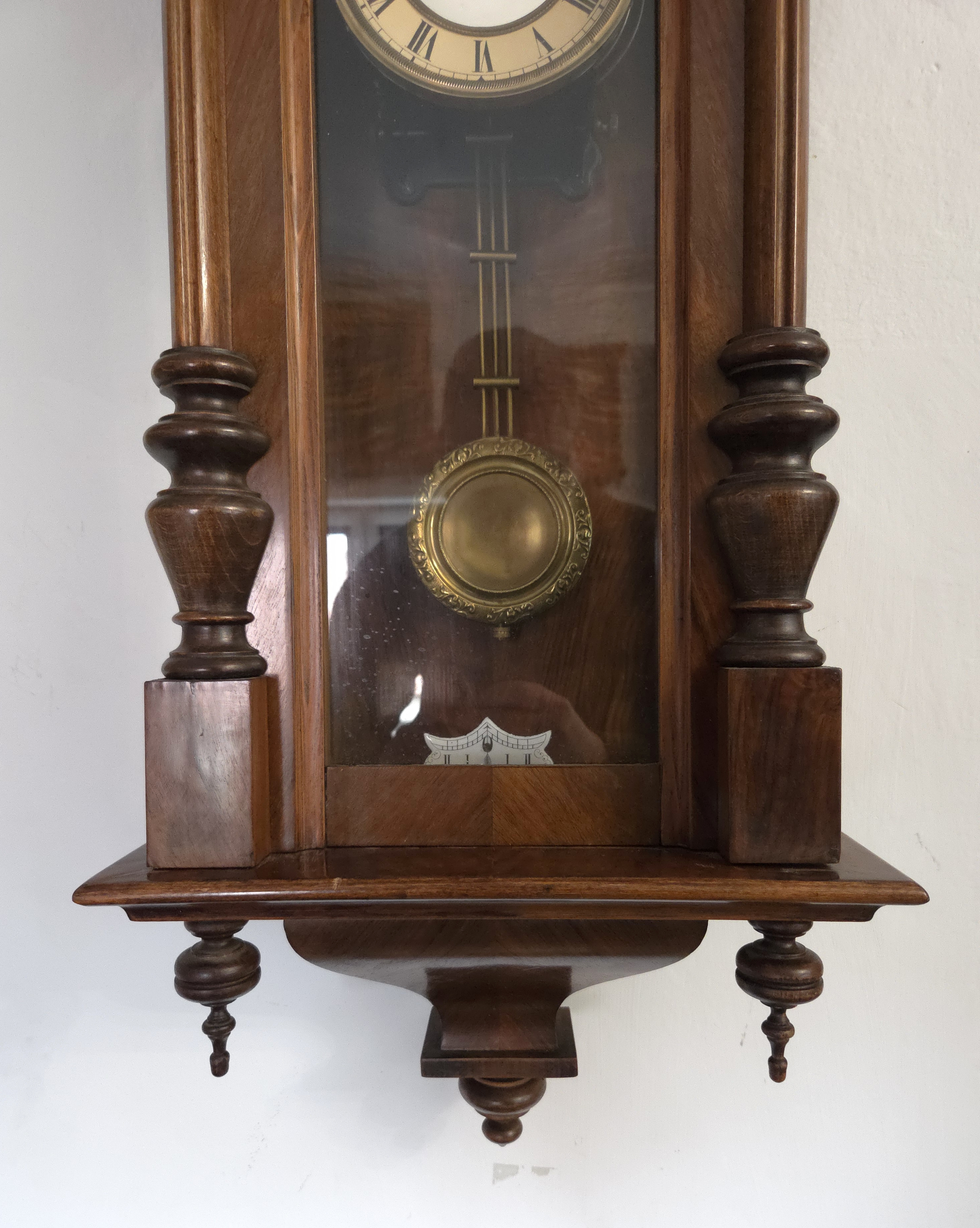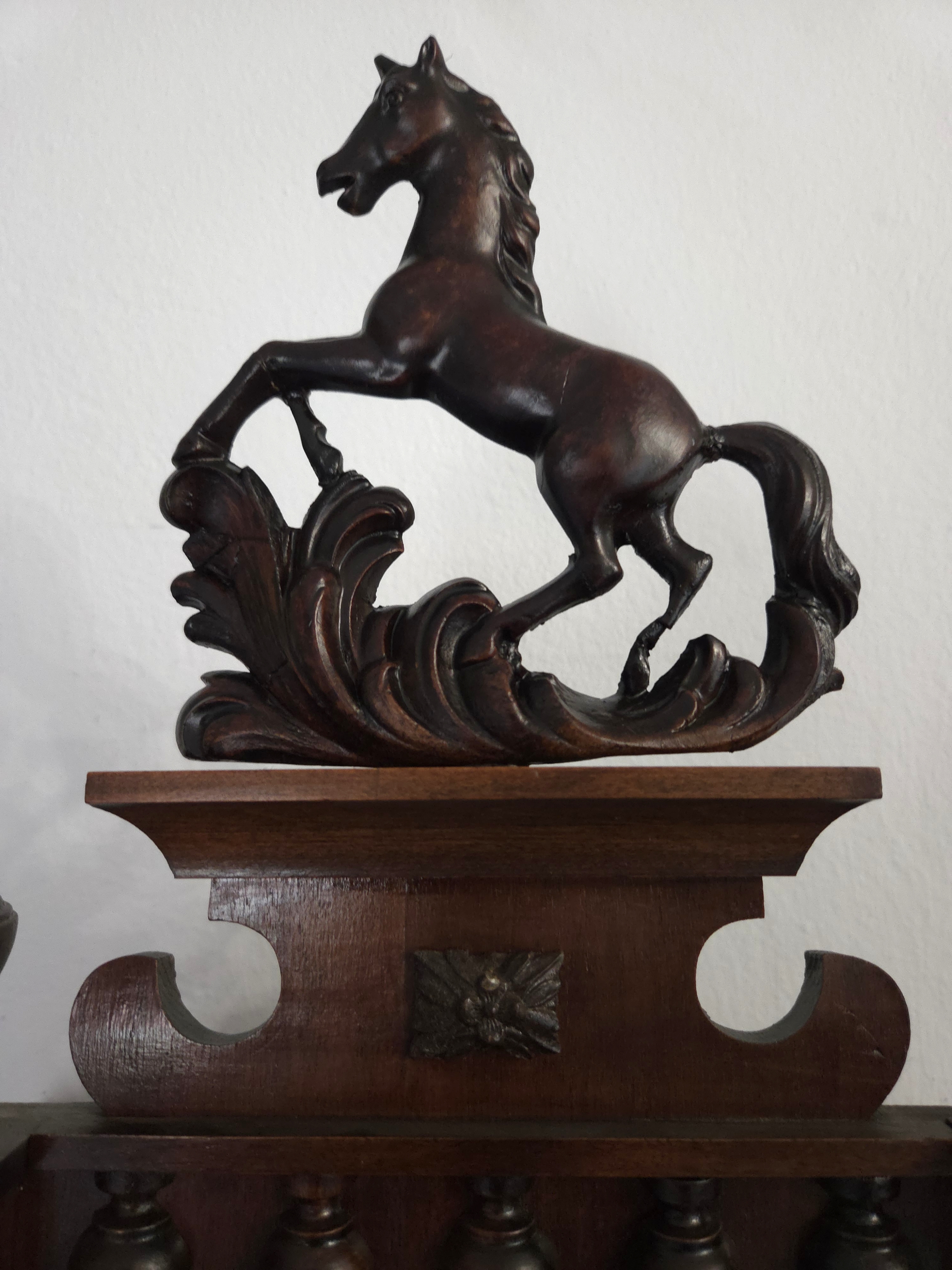 (nr 9306)Orzechowy zegar wiszący z końca XIX wieku. Figura konia zdobi zwieńczenie tego eklektycznego zegara. Wyważone oryginalne zdobienia, charakterystyczne dla epoki, wyjątkiem jest figura konia zamiast standardowo stosowanej zazwyczaj muszli.