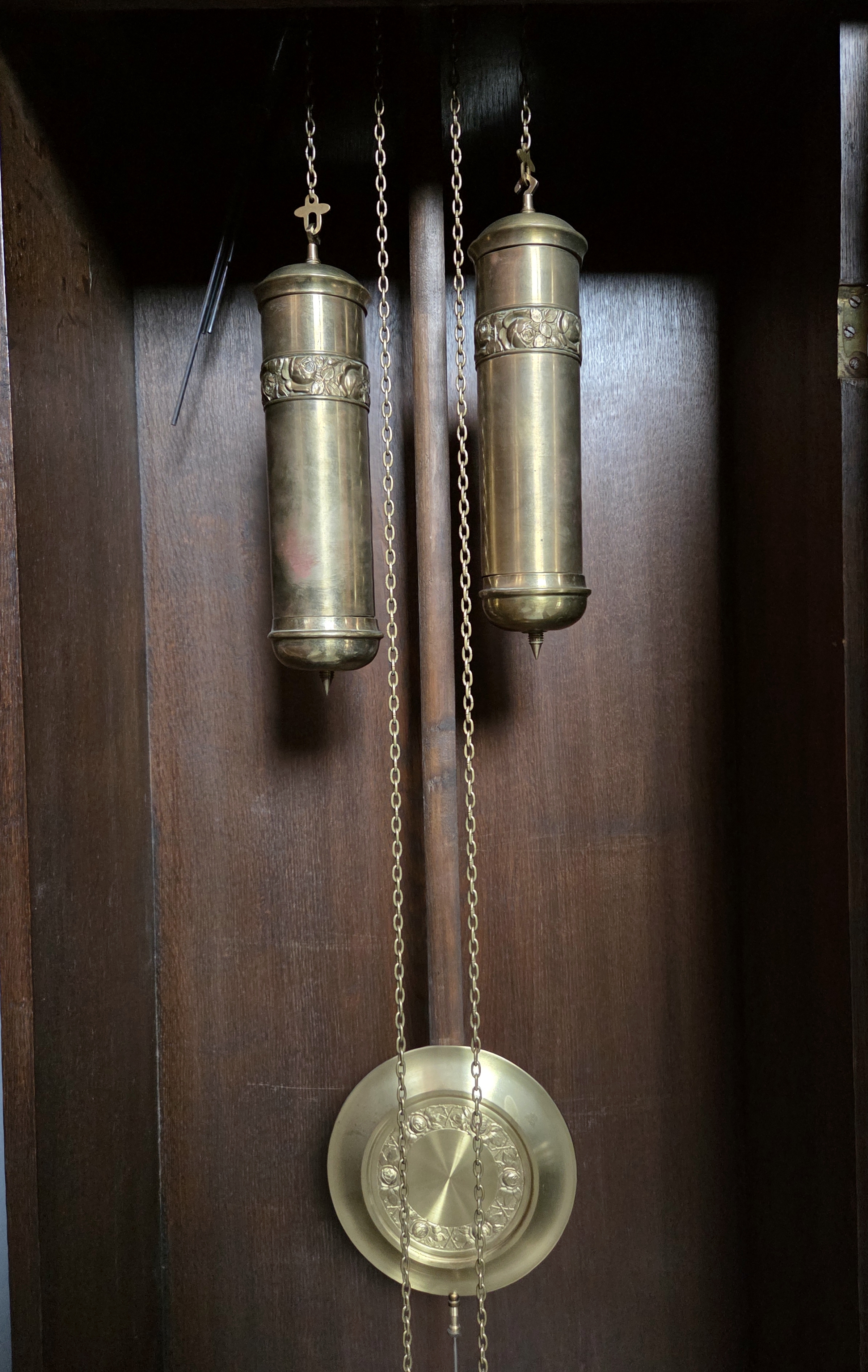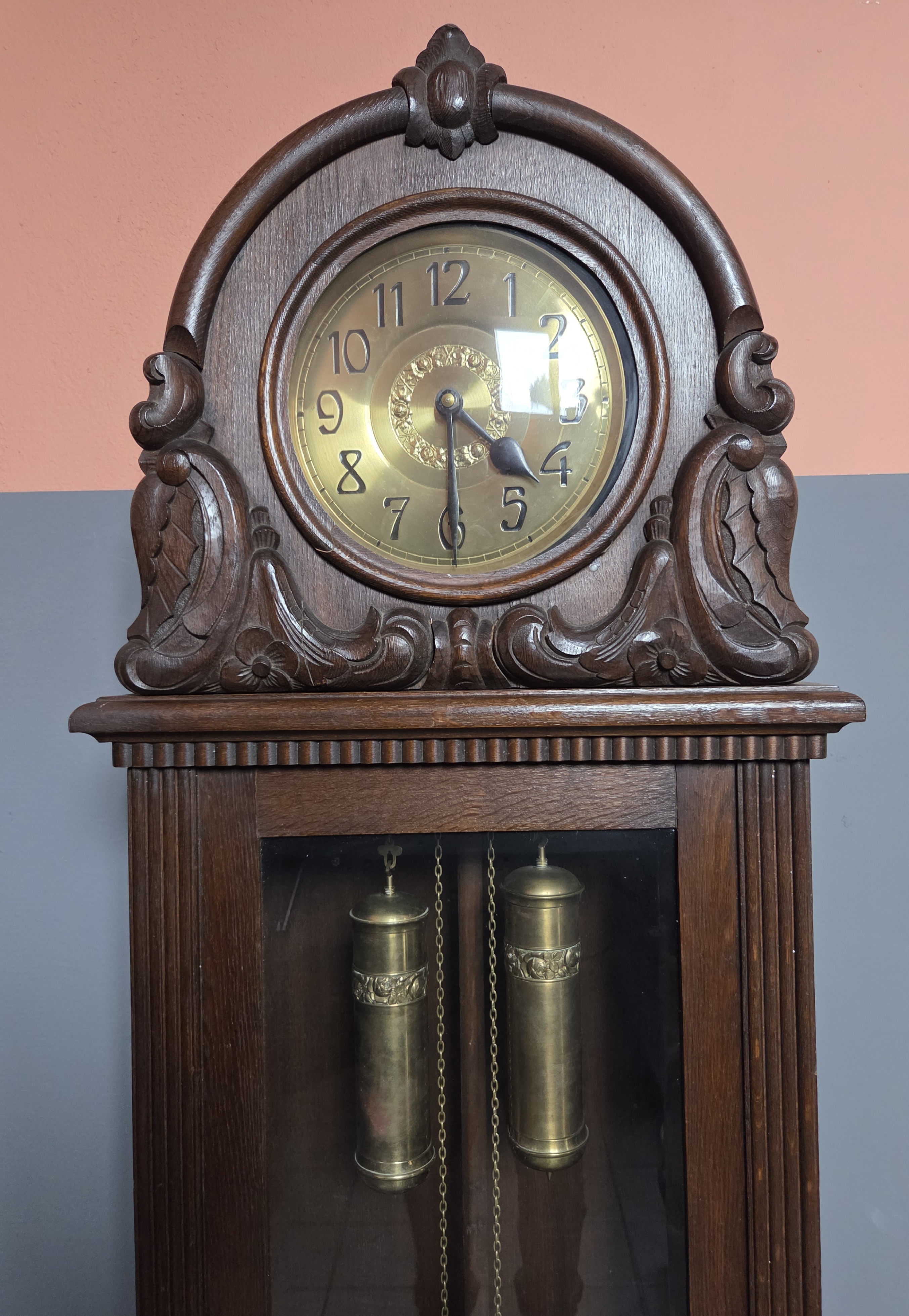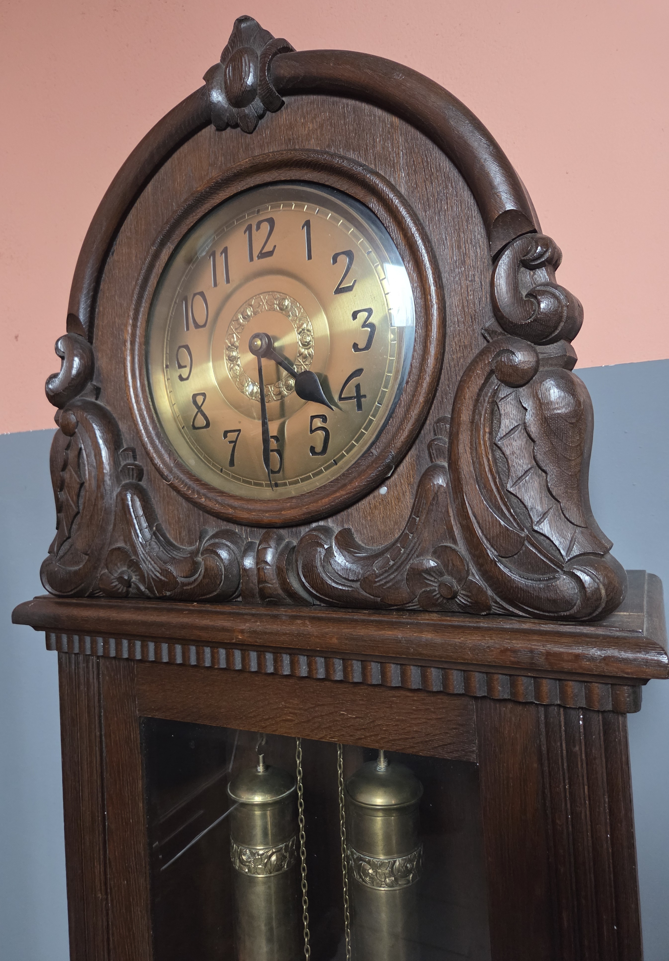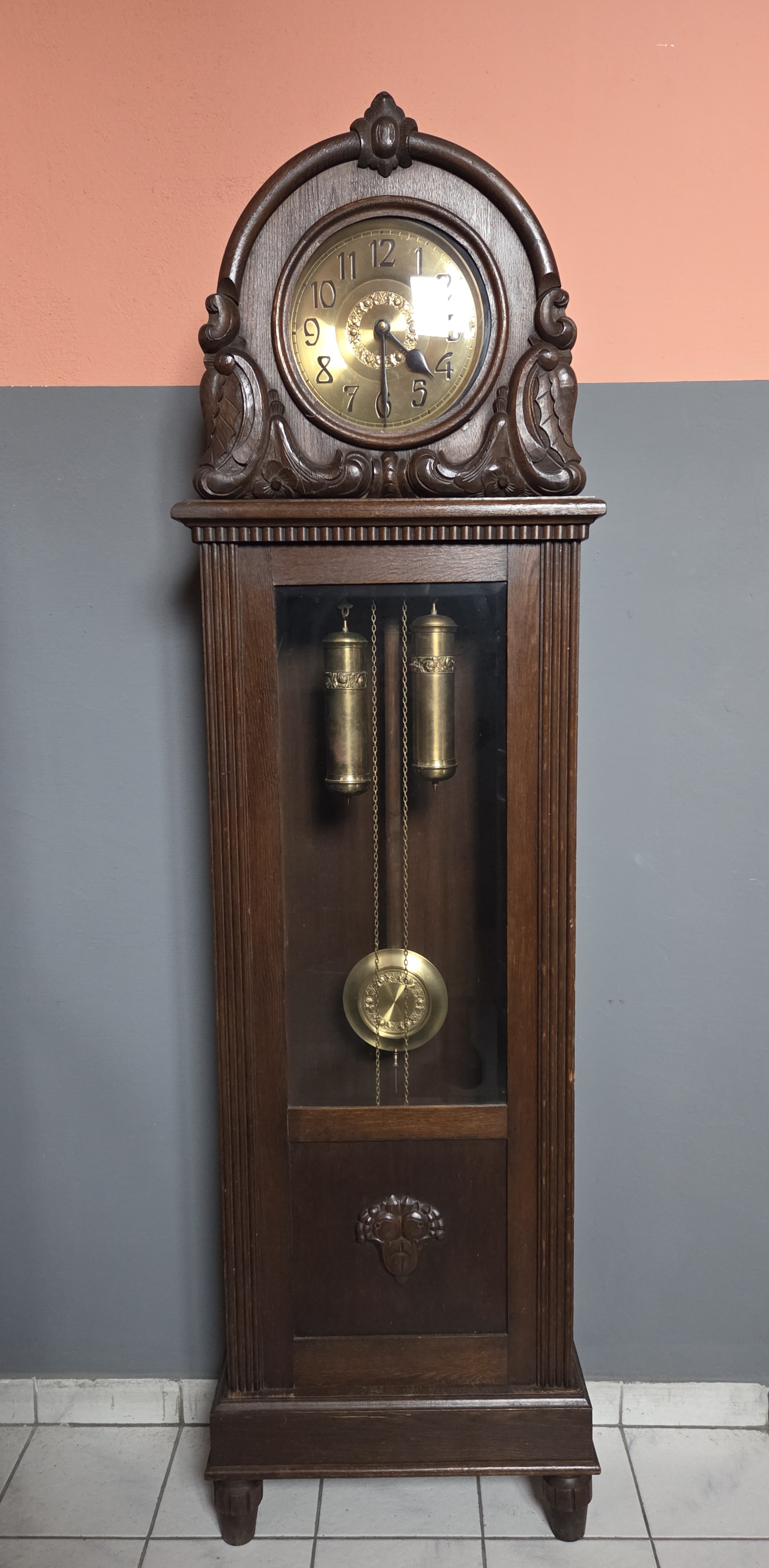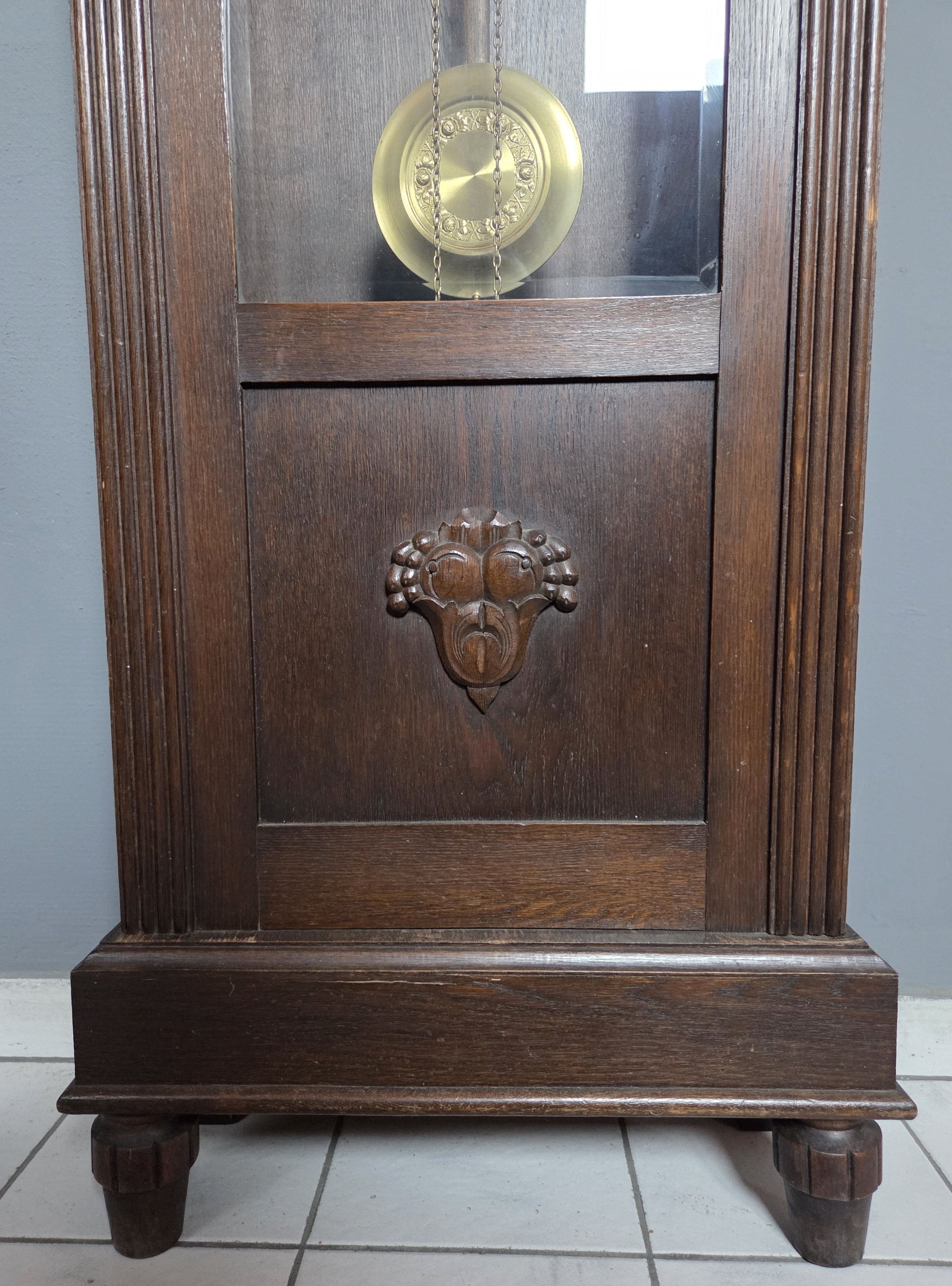 (nr 9308)Zegar stojący typu baba w dębowej skrzyni. Zegar pochodzi z okresu międzywojennego, zdobiony delikatną snycerką.