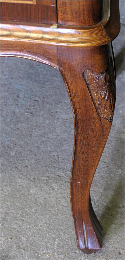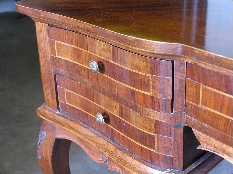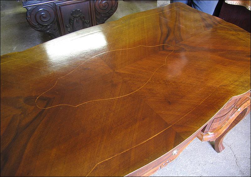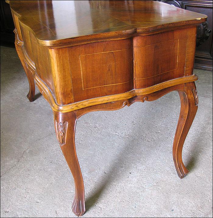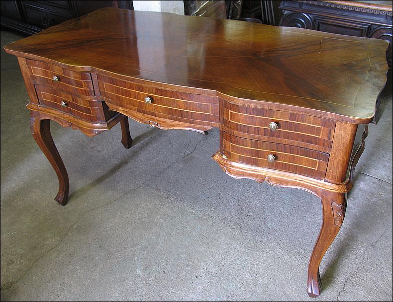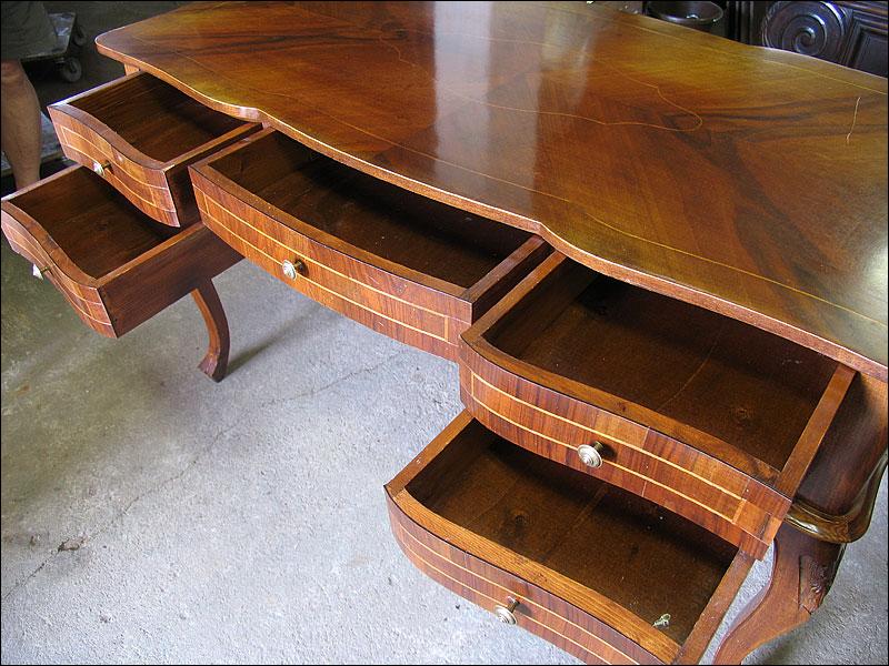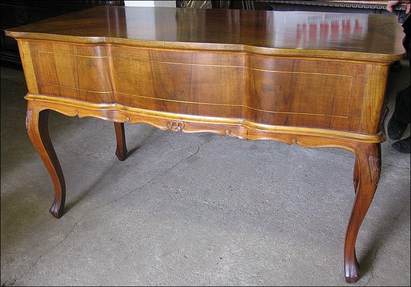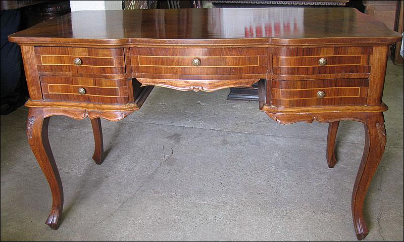 Stylowe biurko, fornirowane orzechem i zdobione pięknymi intarsjami. Pięć szuflad, faliście giętych.2008214