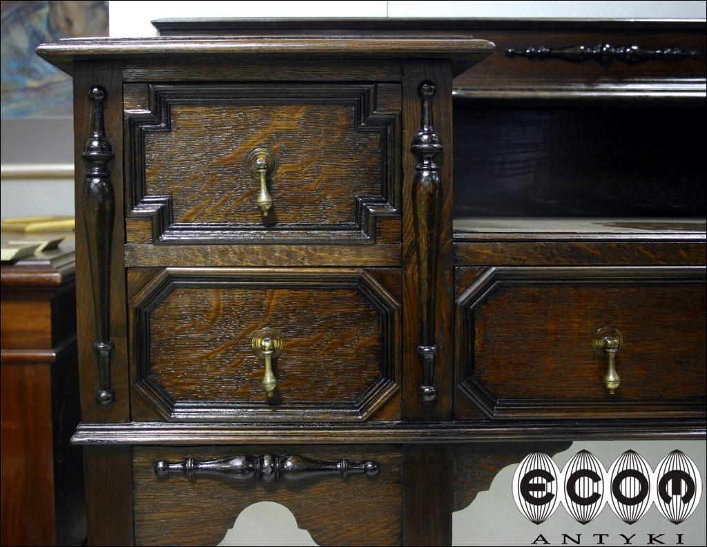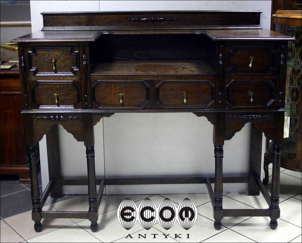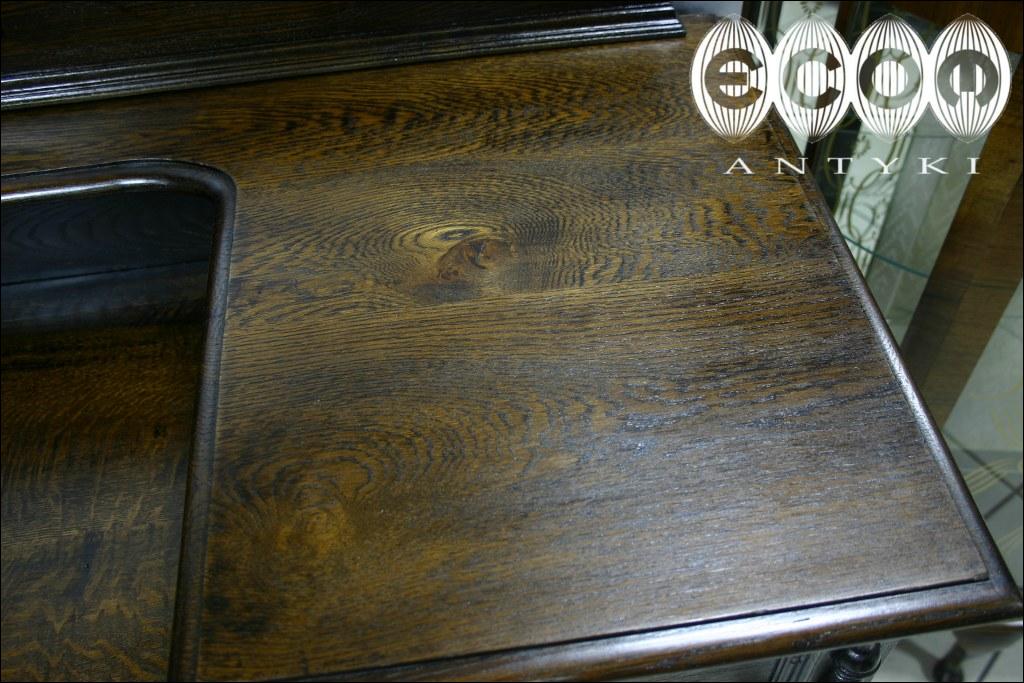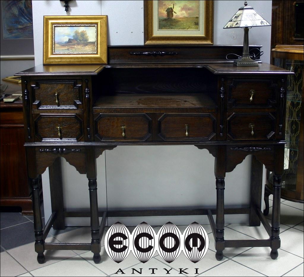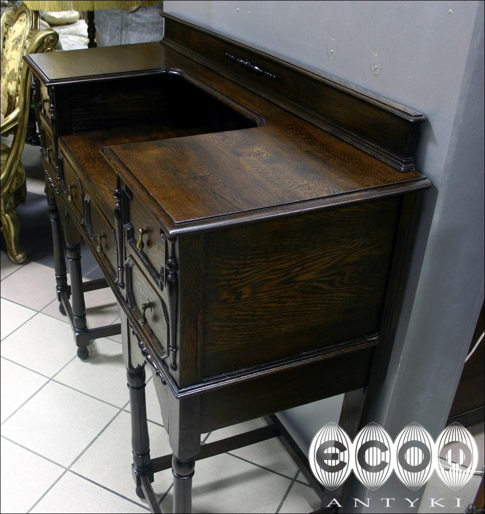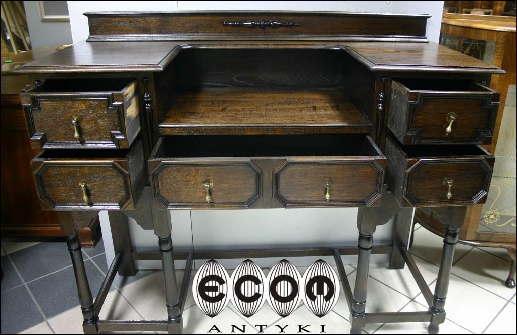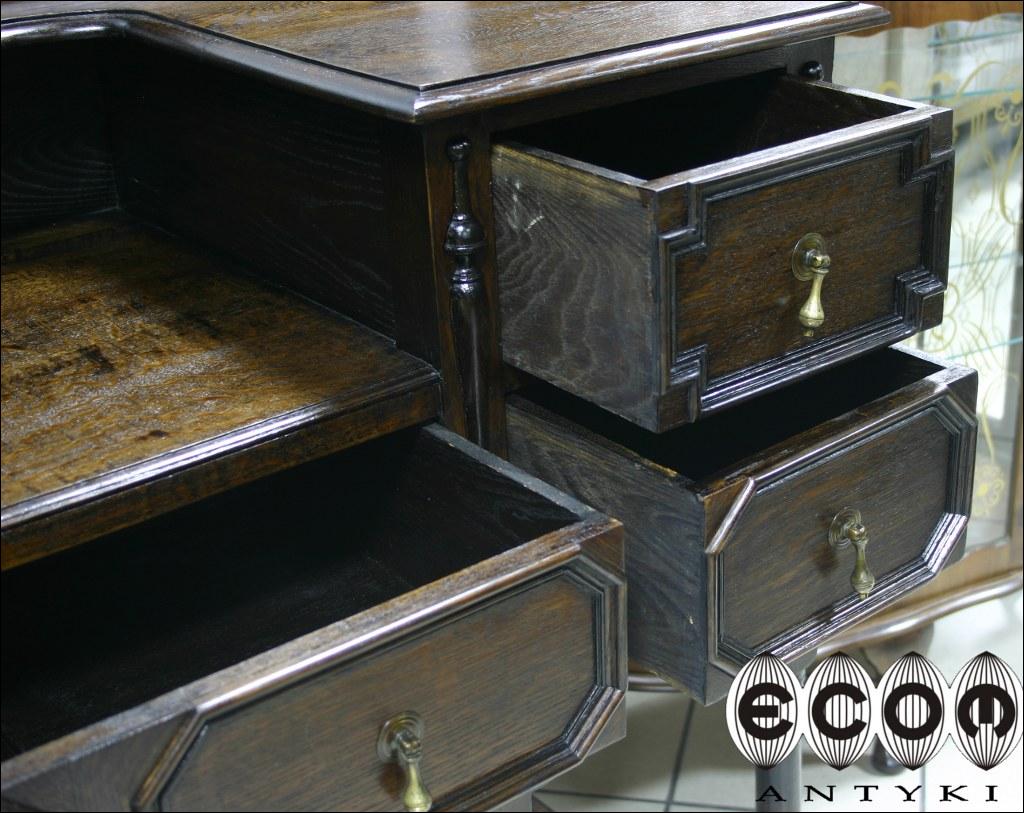 Sekretarzyk w stylu flamandzkim. Piękne, toczone nogi, pilastry między szufladami. Blaty na dwóch poziomach i pięć szuflad nadają funkcjonalności temu stylowemu meblowi.