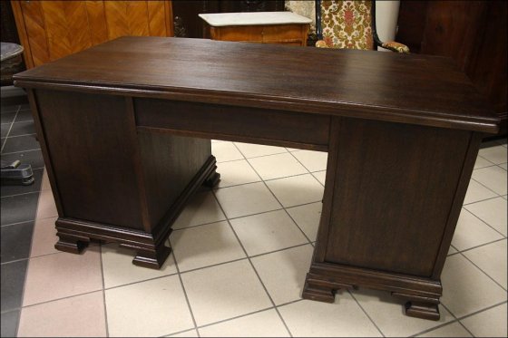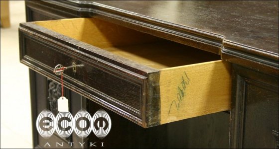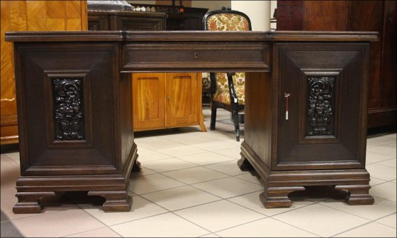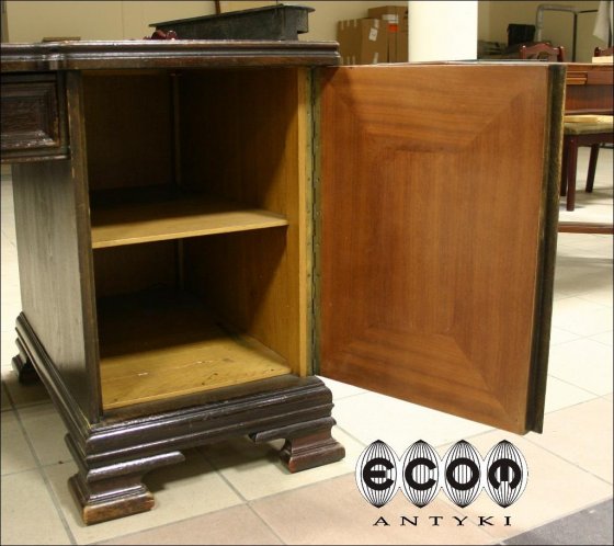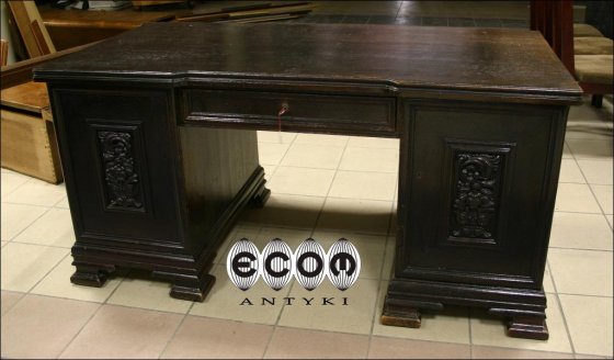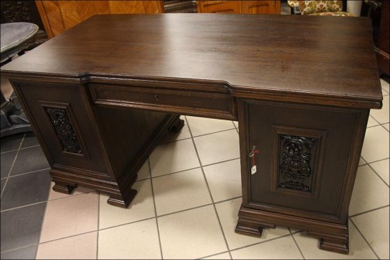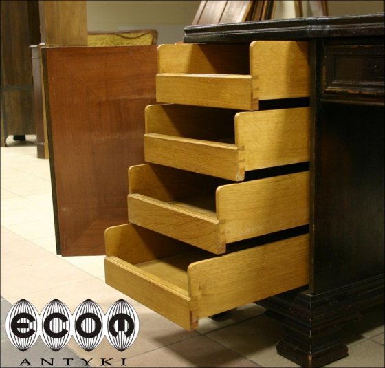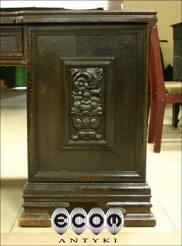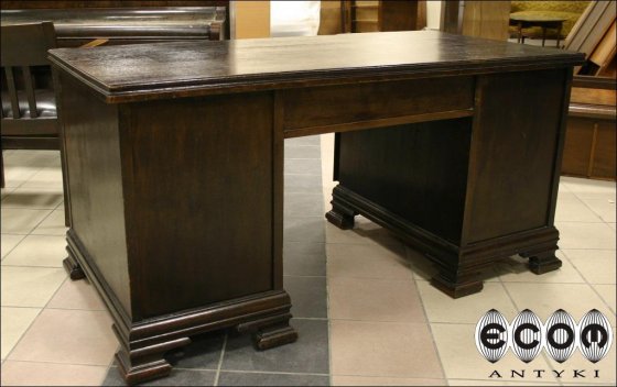 Gabinetowe biurko w kolorze ciemny dąb. Lewa strona z czterema szufladami, prawa z jedną półką. W górnej, środkowej części szuflada zamykana, podobnie jak dwie szafki, na klucz który znajduje się w komplecie. Drzwiczki zdobione prostokątnymi, rzeźbionymi kasetonami. Cały mebel utrzymany w klimacie secesji.